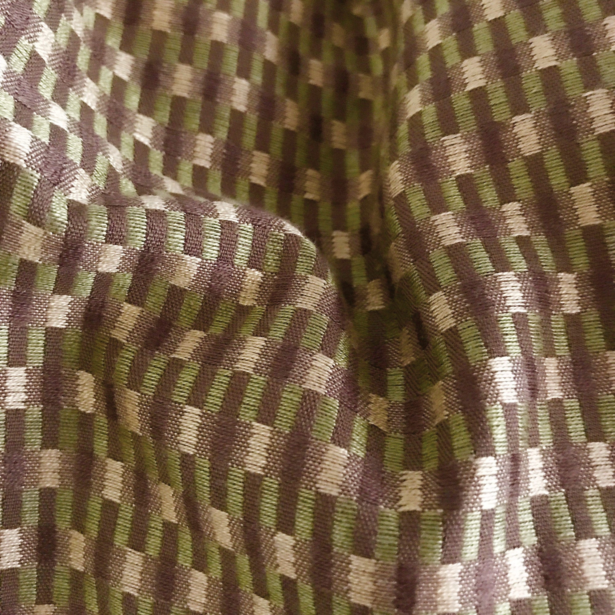 • Woven abstract pattern in vintage avocado green and brown adds depth and texture