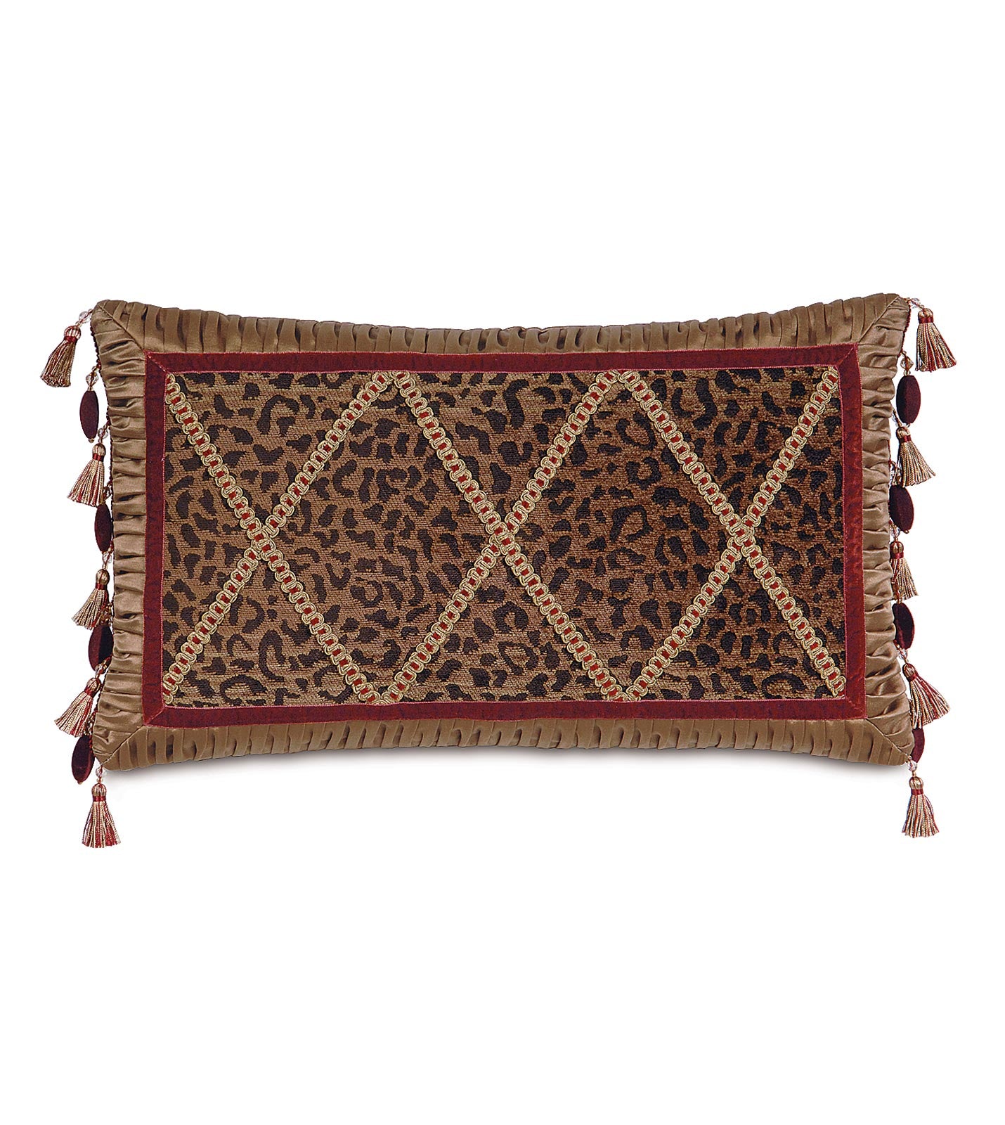 • Decorative pillow featuring a woven leopard pattern fabric with gold accents