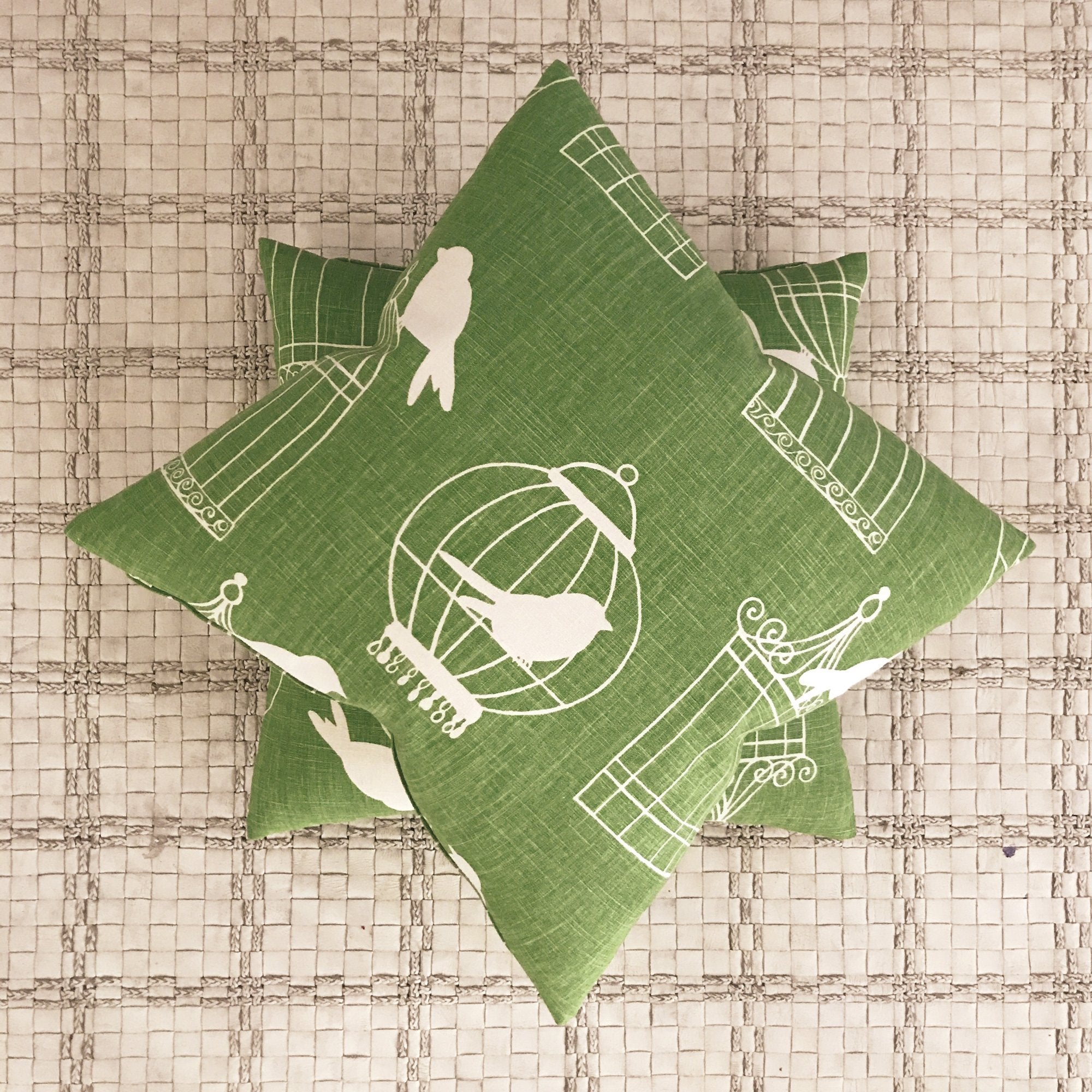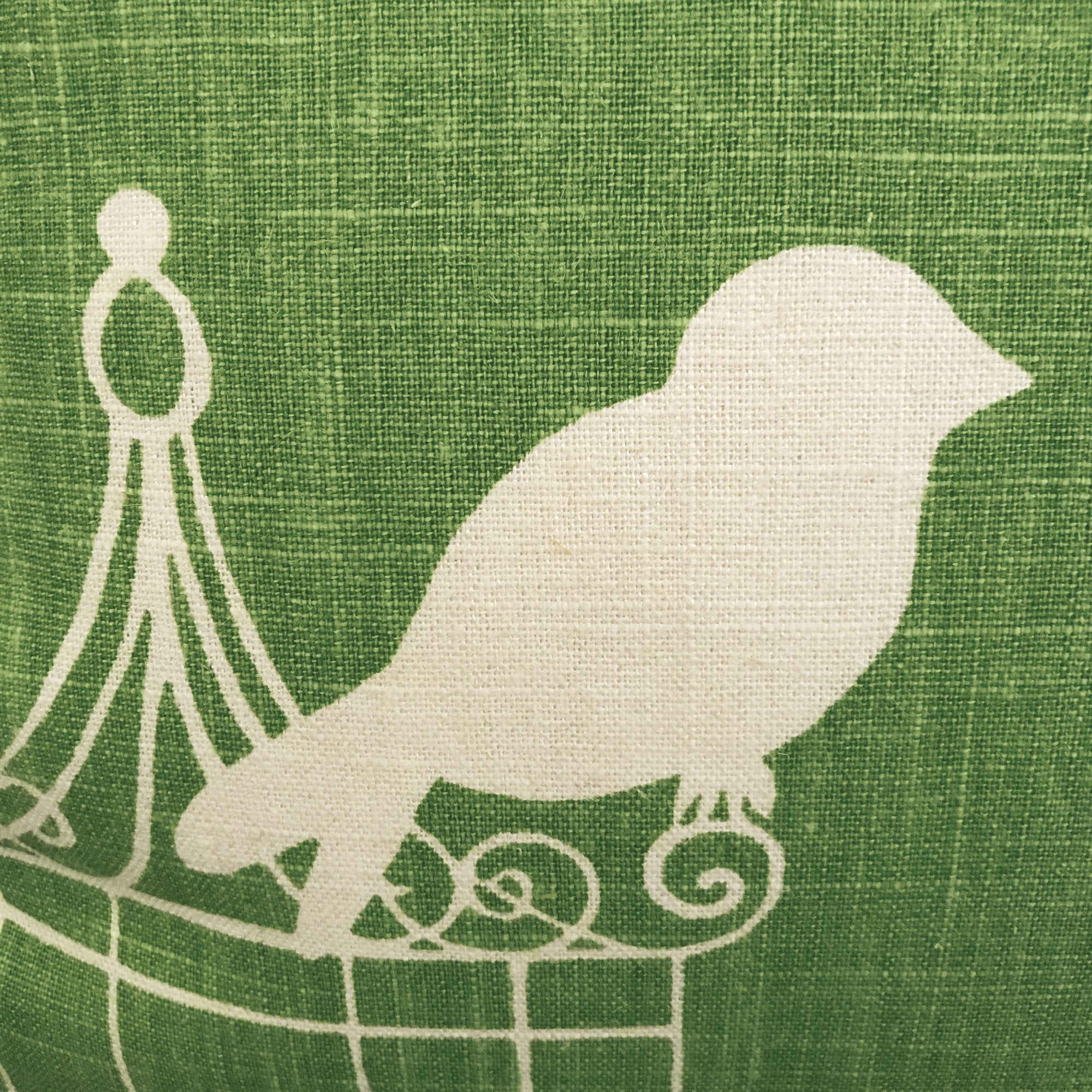 - Songbird print on moss green linen adds a natural, serene touch to your decor