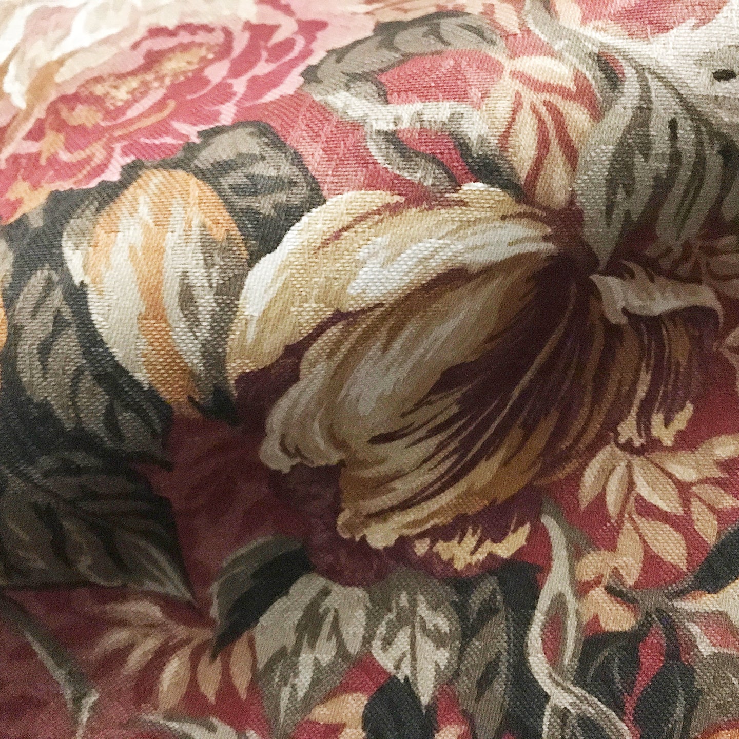 Vintage Inspired Blush Pink Floral Peony Print Fabric with Hues of Green, Beige, Red & Brown