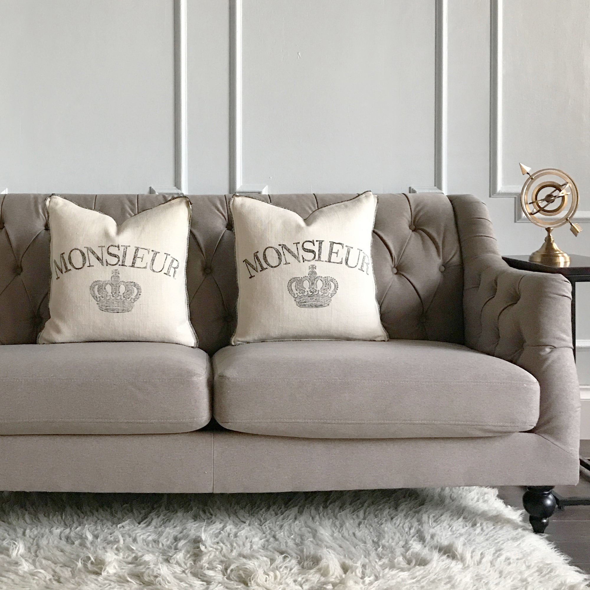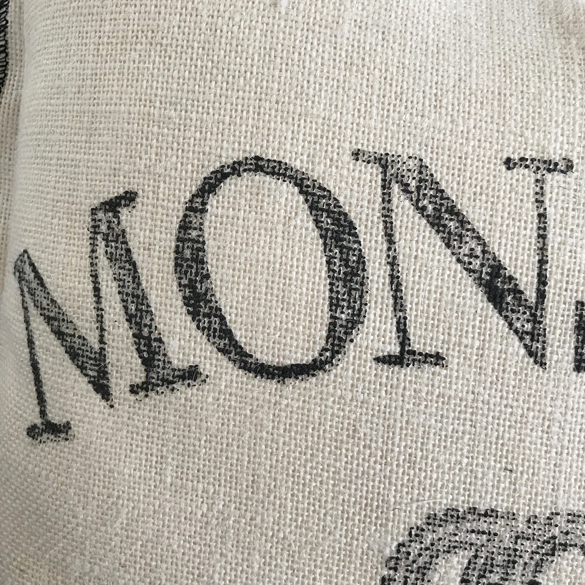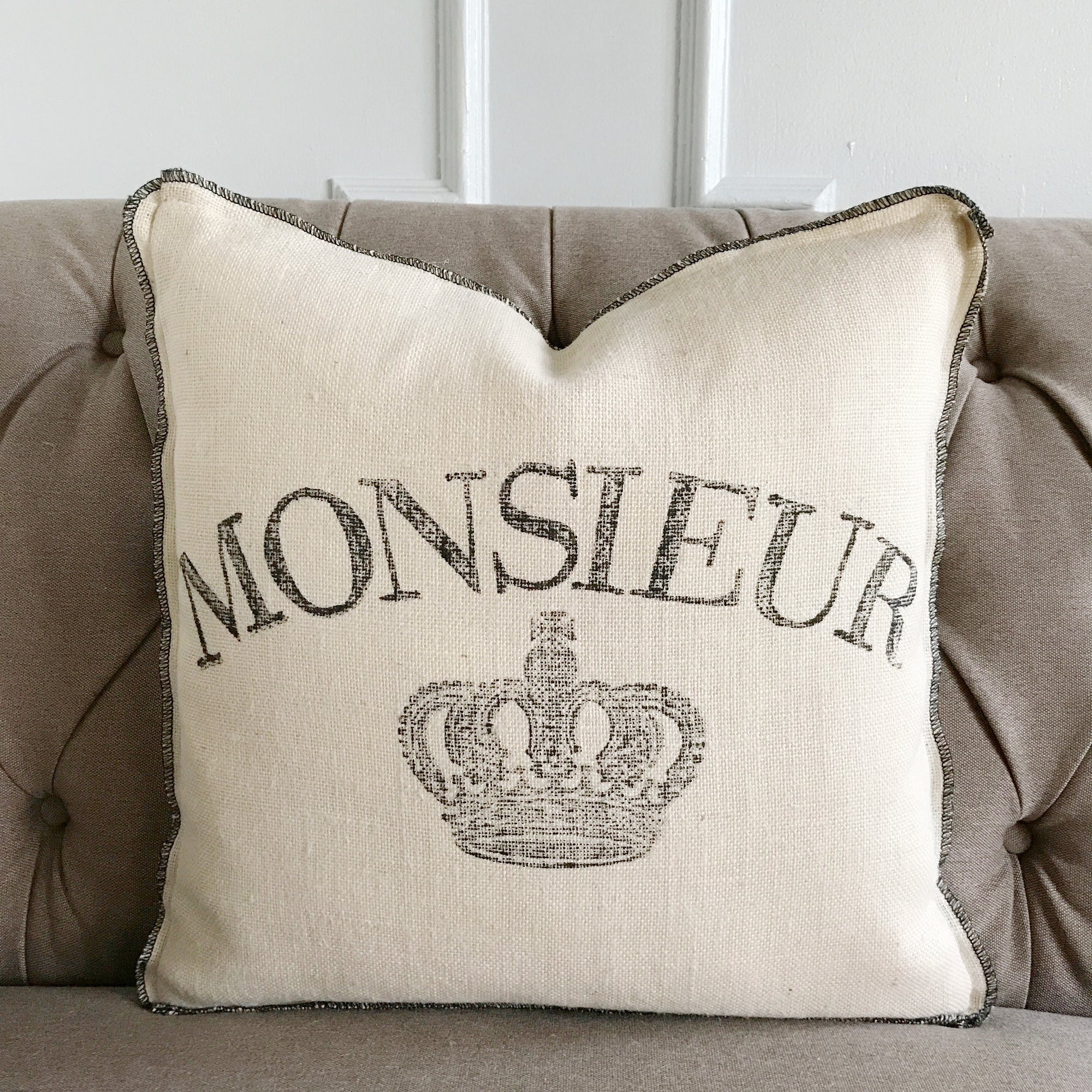 ⁌ Introduce rustic charm and artisan craftsmanship to your decor with the French Country Ivory Burlap "Monsieur" Block Printed Throw Pillow Cover. Made from natural burlap, this pillow cover features a bold "Monsieur" block print, adding a whimsical yet sophisticated French-inspired touch. Its textured fabric and understated design make it a versatile accent for living rooms, bedrooms, or entryways, complementing farmhouse, rustic, or eclectic interiors.
