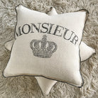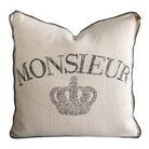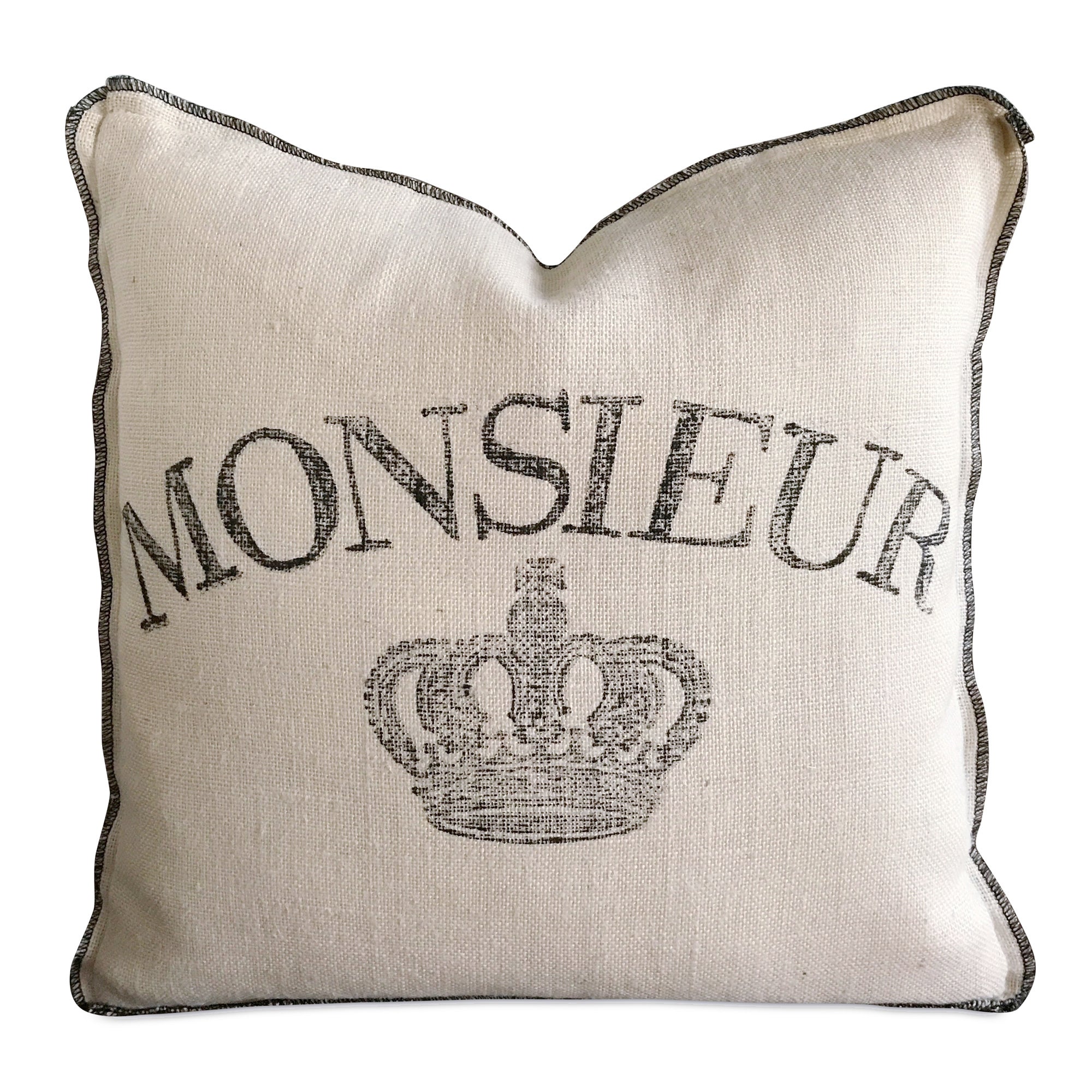 French Country Ivory Burlap "Monsieur" Block Printed Artisan Throw Pillow Cover 20x20