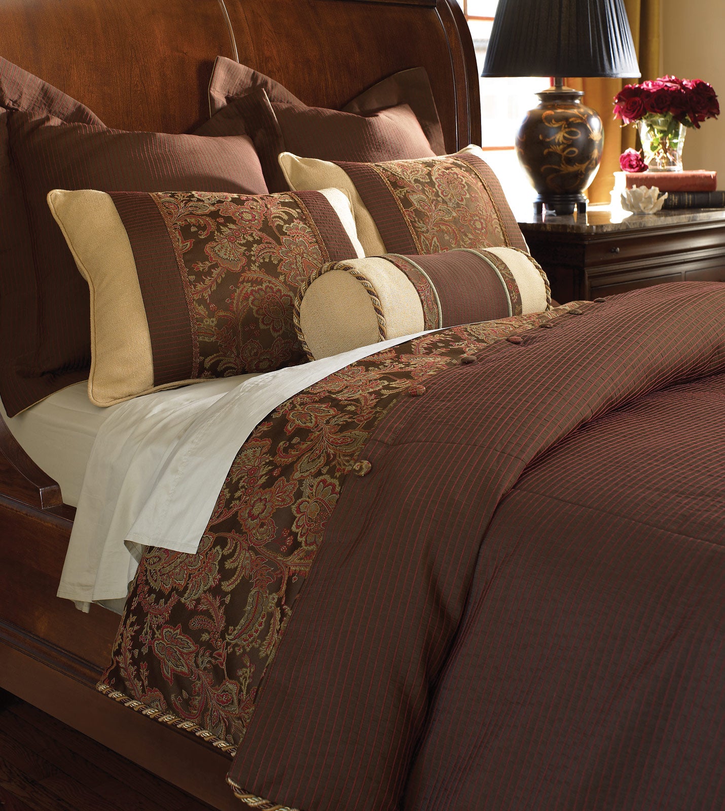 - Euro sham in mahogany brown with delicate red stripes