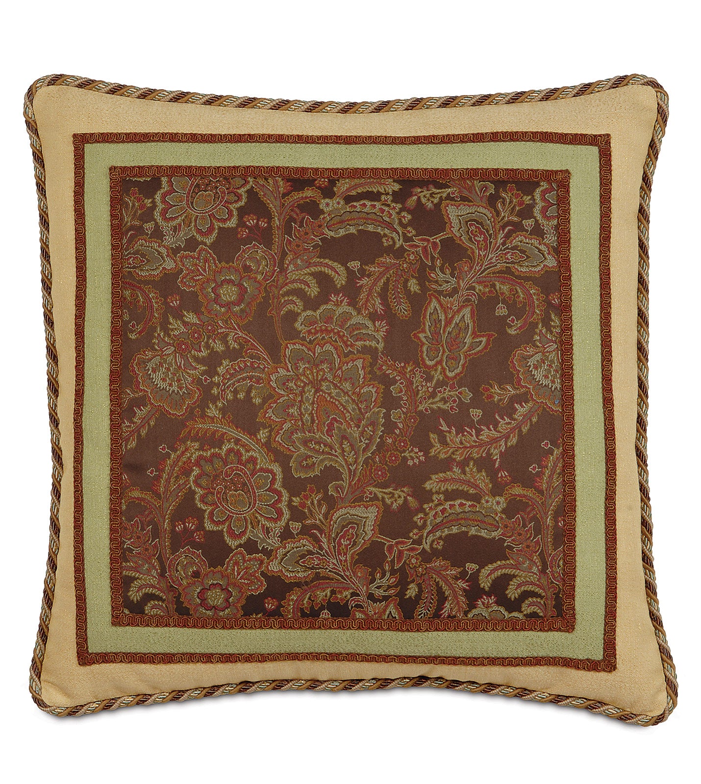 - Euro sham featuring a centered floral insert in mahogany brown