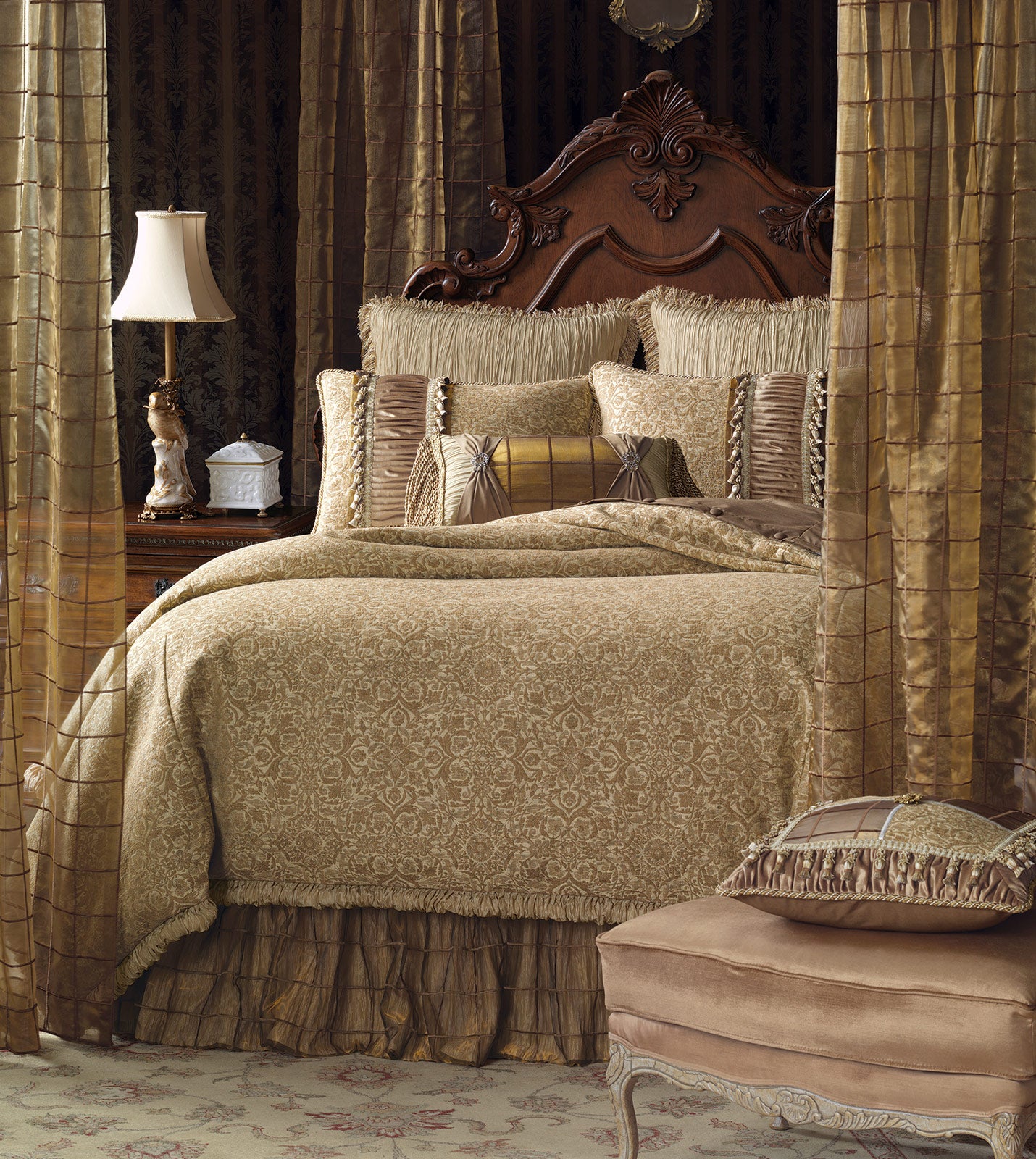 • Standard sham with a floral damask pattern and tassel detailing (left) in gold