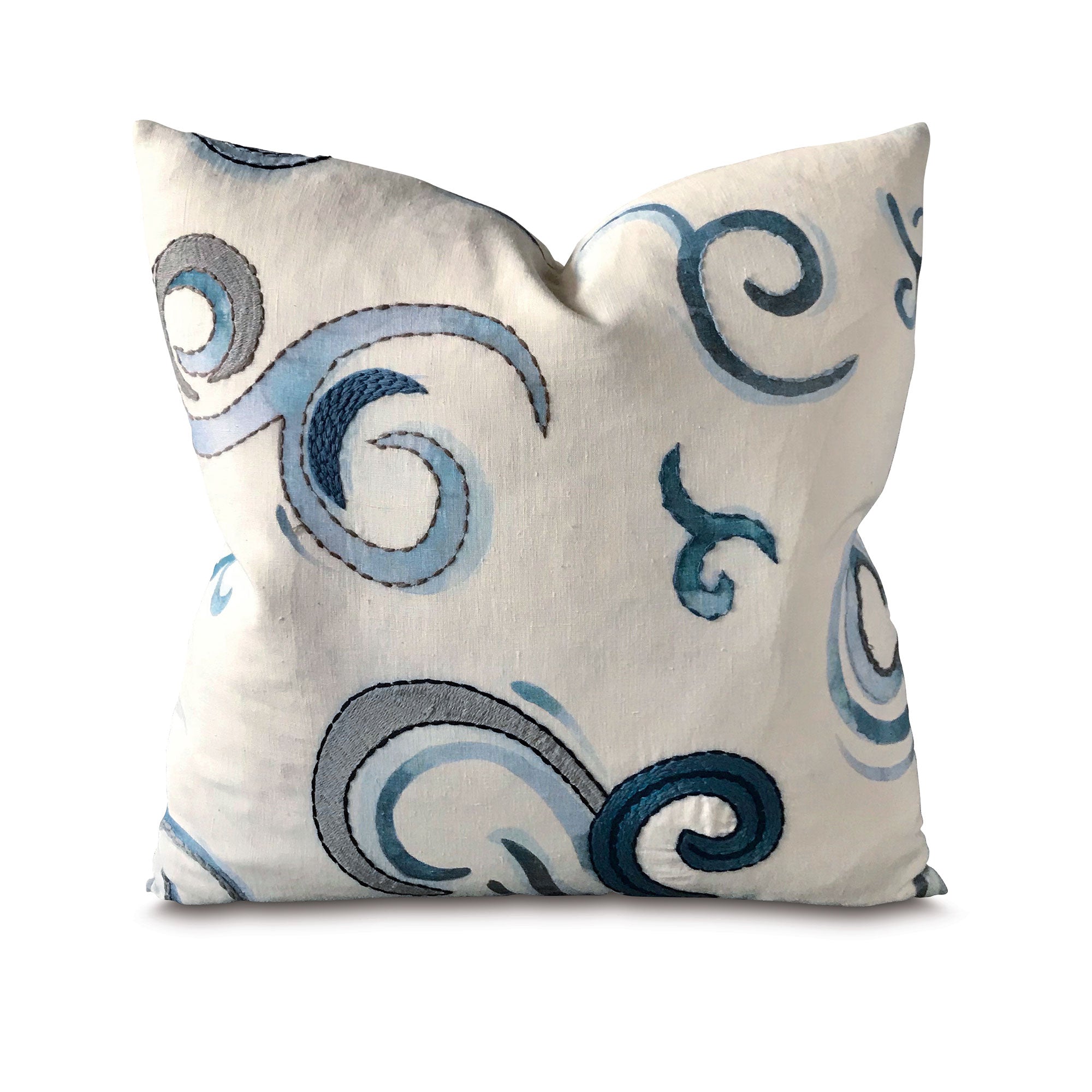 ⁌ Add modern artistry to your décor with the Blue and Ivory Geo Swirl Throw Pillow Cover. This 20x20 decorative pillow cover features intricate blue geometric swirl embroidery on a soft ivory fabric base, creating a striking yet versatile accent. Self-backed for a seamless finish, it’s designed with a knife edge for crisp lines and a hidden zipper for easy care. Proudly made in the USA.