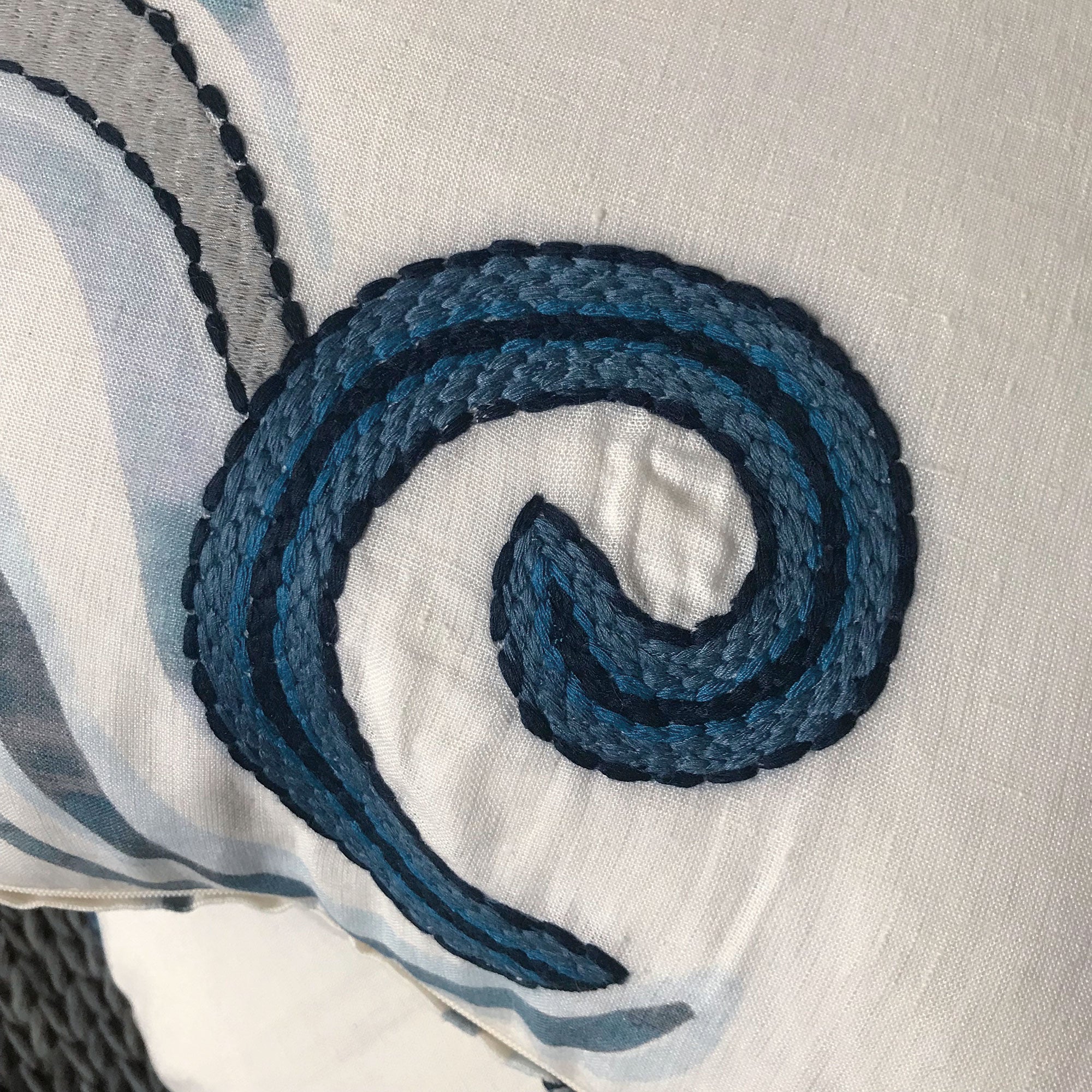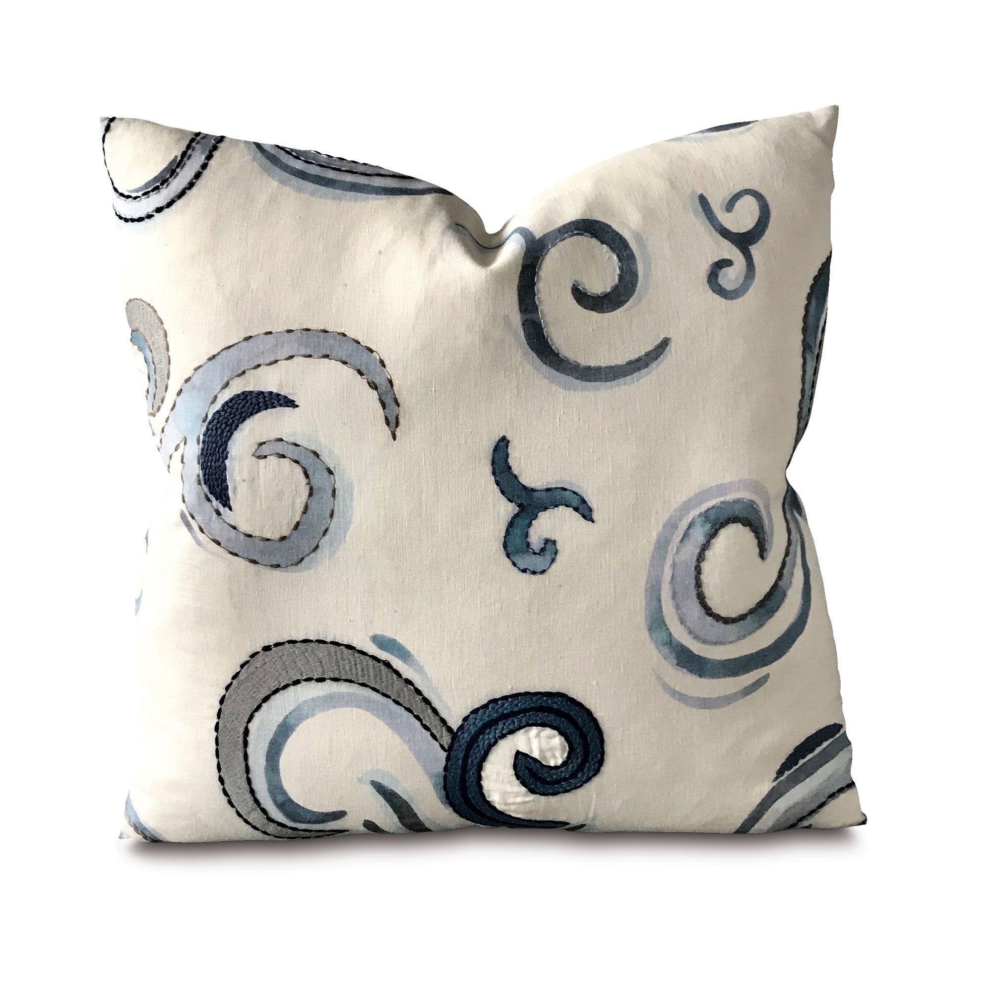⁌ Elevate your home décor with the Blue and Ivory Geo Swirl Throw Pillow Cover. This 22x22 decorative pillow cover showcases intricate blue geometric swirl embroidery on a soft ivory fabric base, offering a modern design with timeless appeal. Self-backed for a seamless finish, it features a knife edge for crisp structure and a hidden zipper for easy care. Proudly made in the USA.