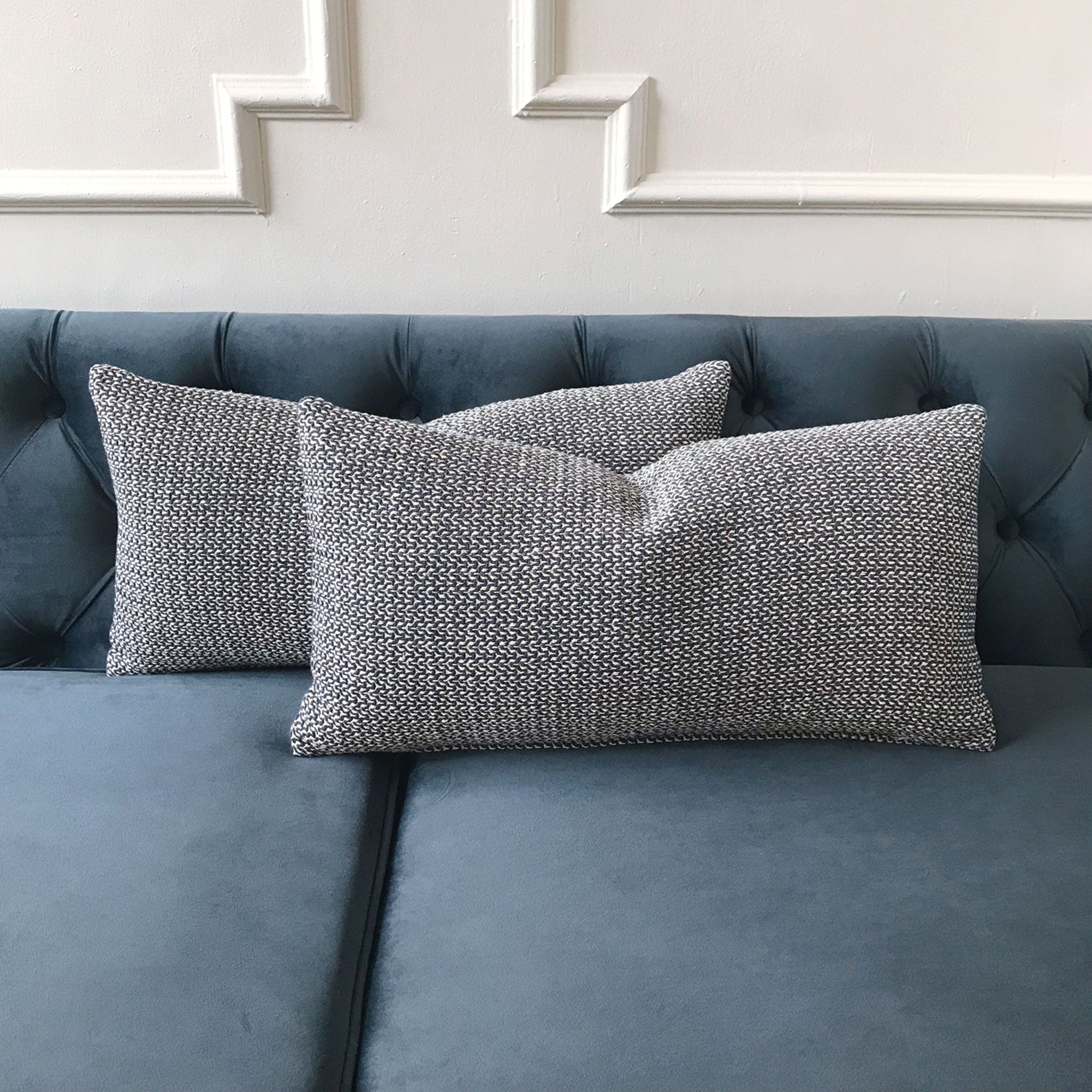 A well-styled space includes different textures and colors. Pairing blue throw pillow covers with woven, velvet, or linen fabrics adds depth and interest.
