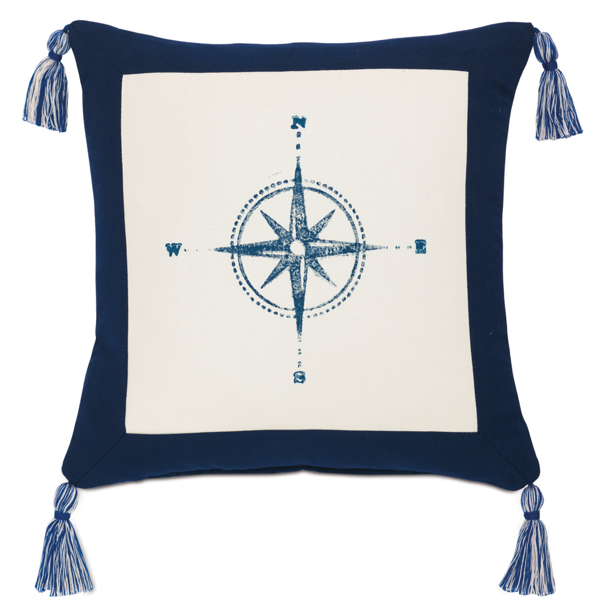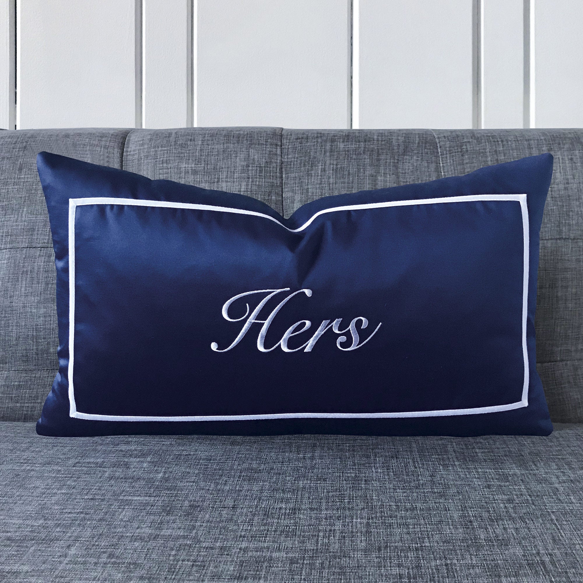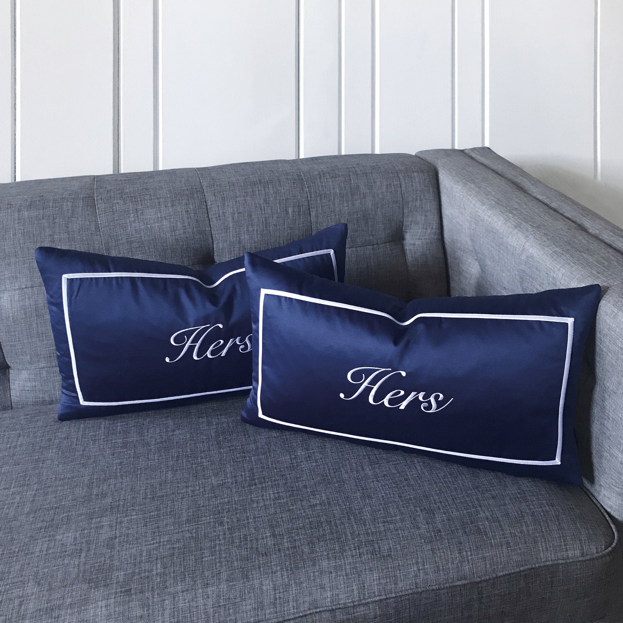 Navy blue pillow covers add a bold, timeless touch.