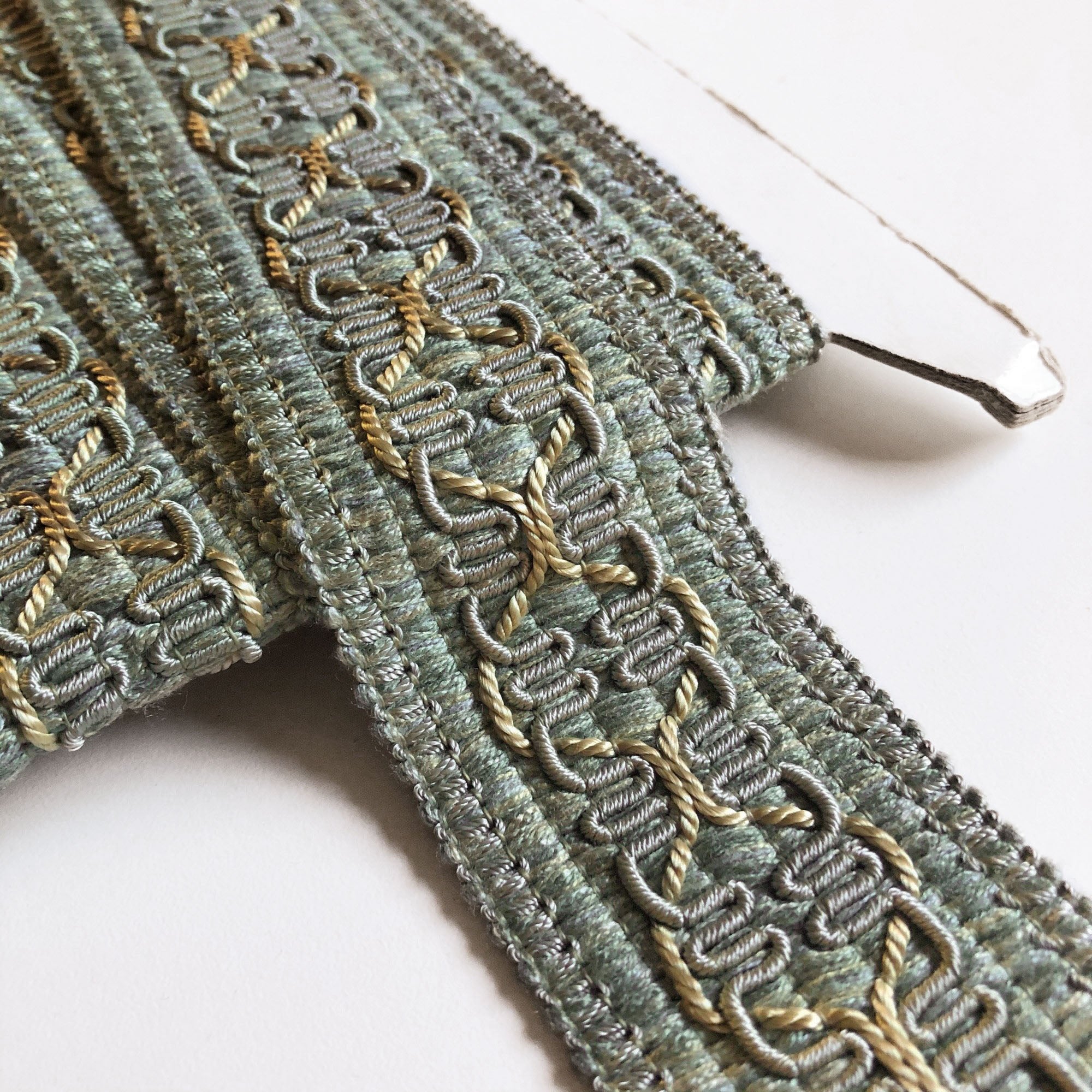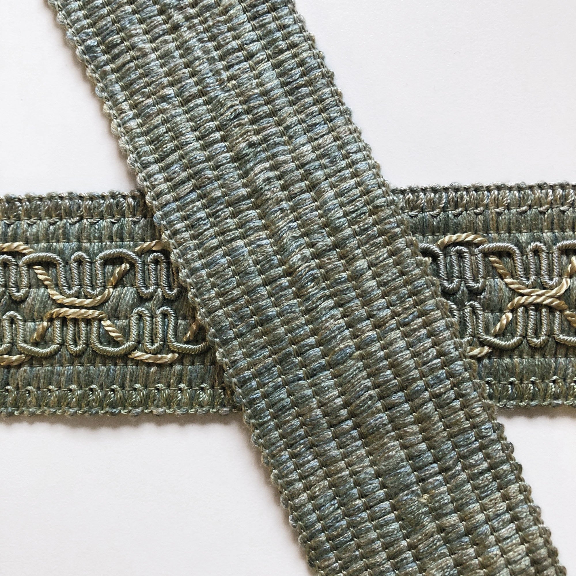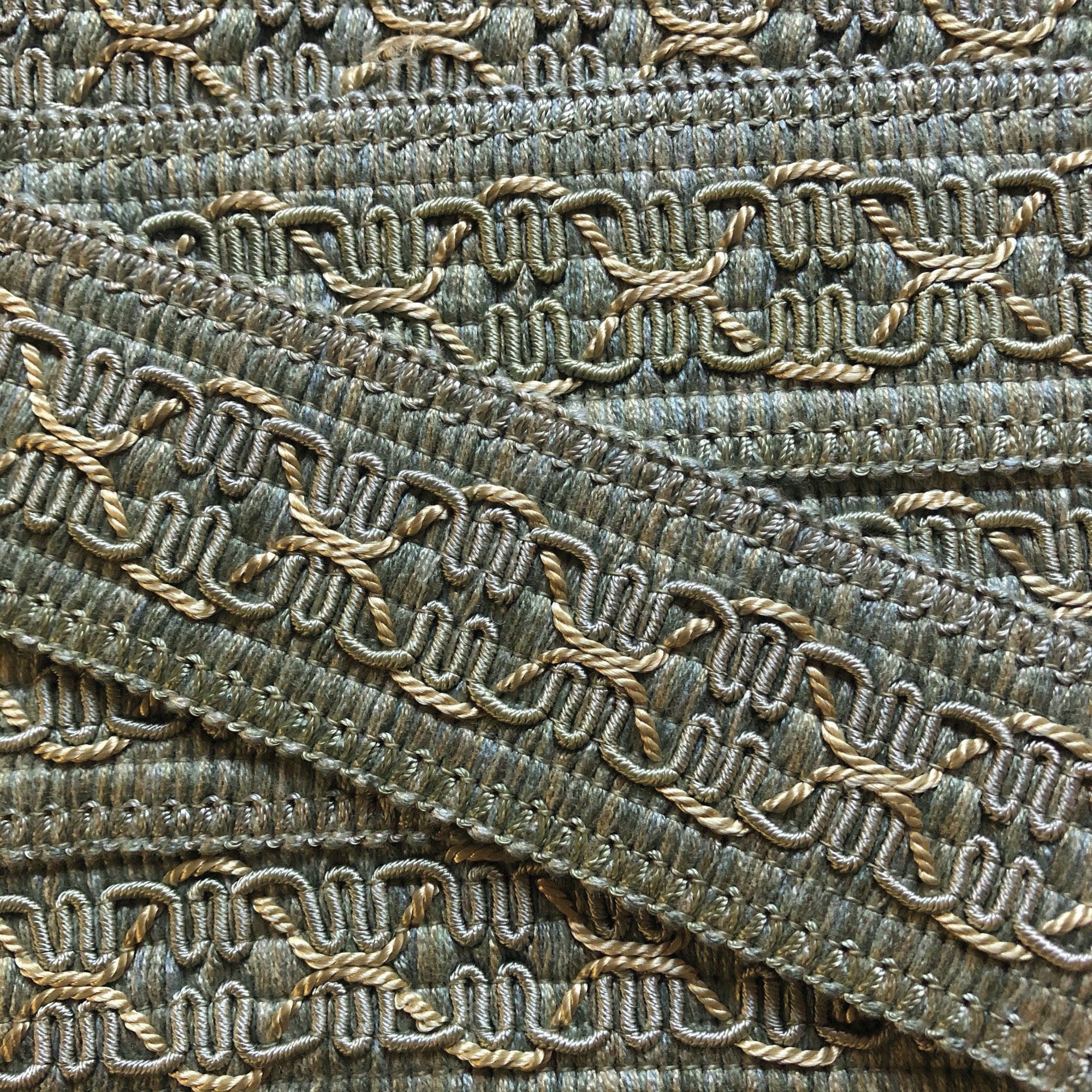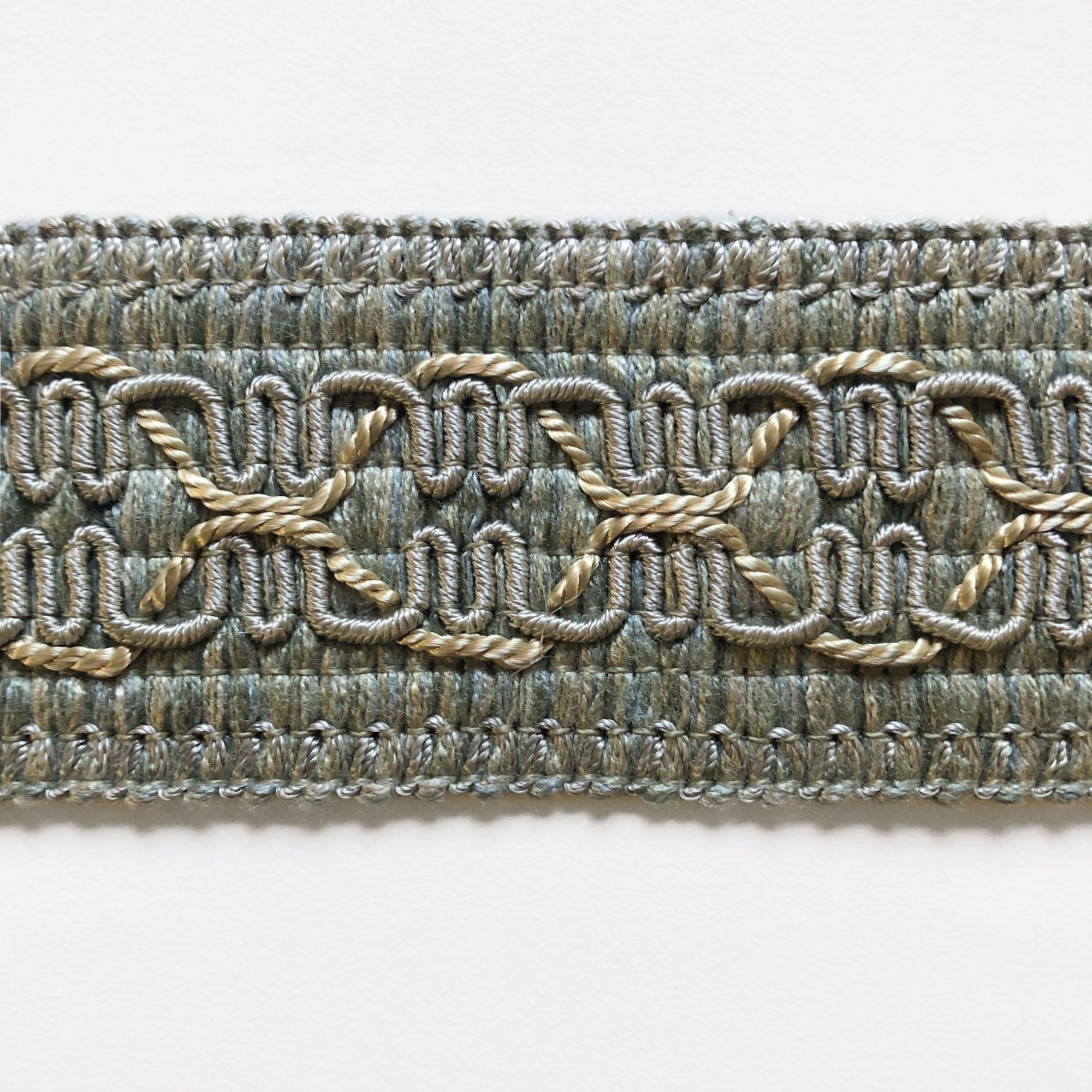 Decorative silver and light blue border trim with beige interwoven threads.