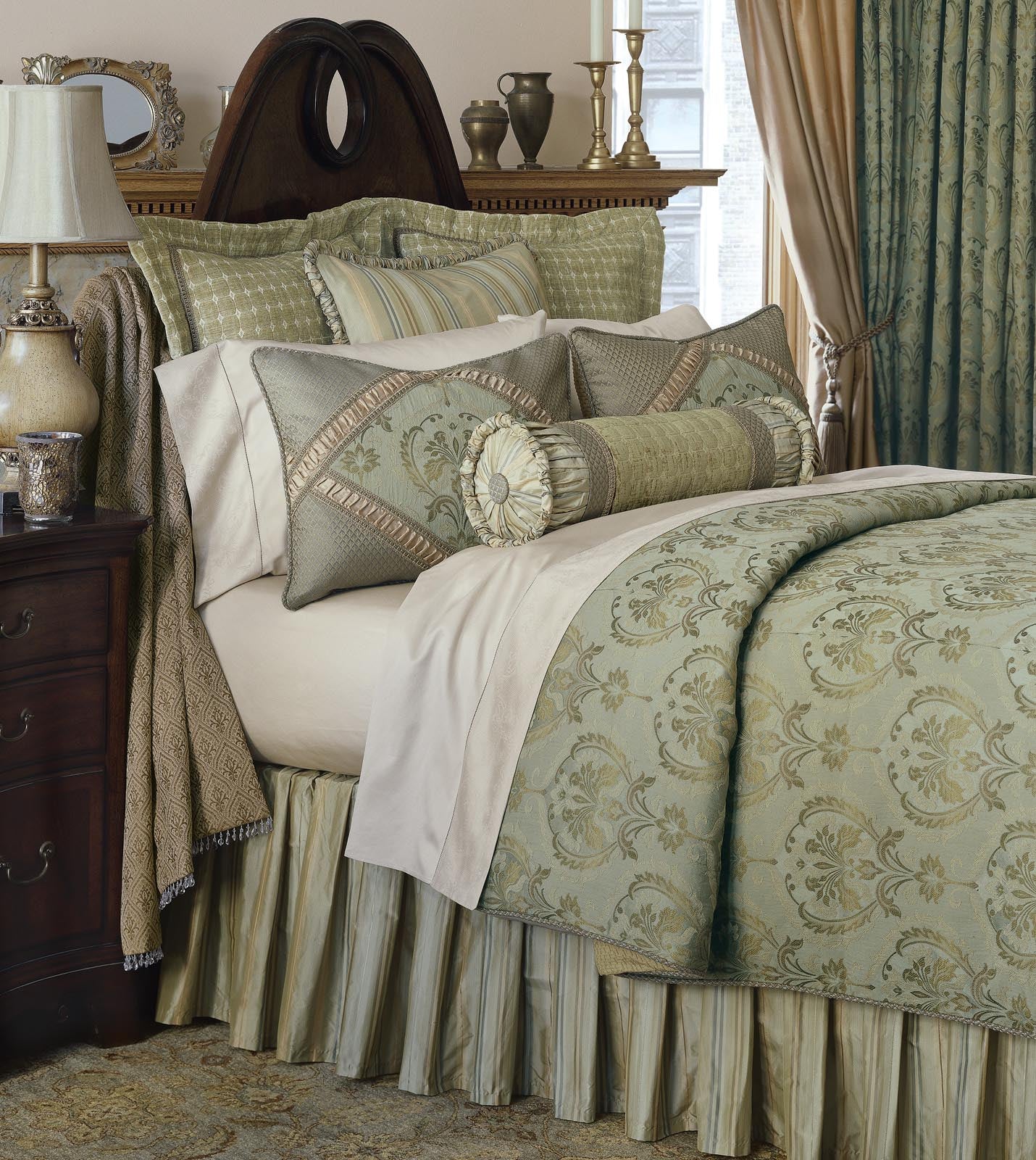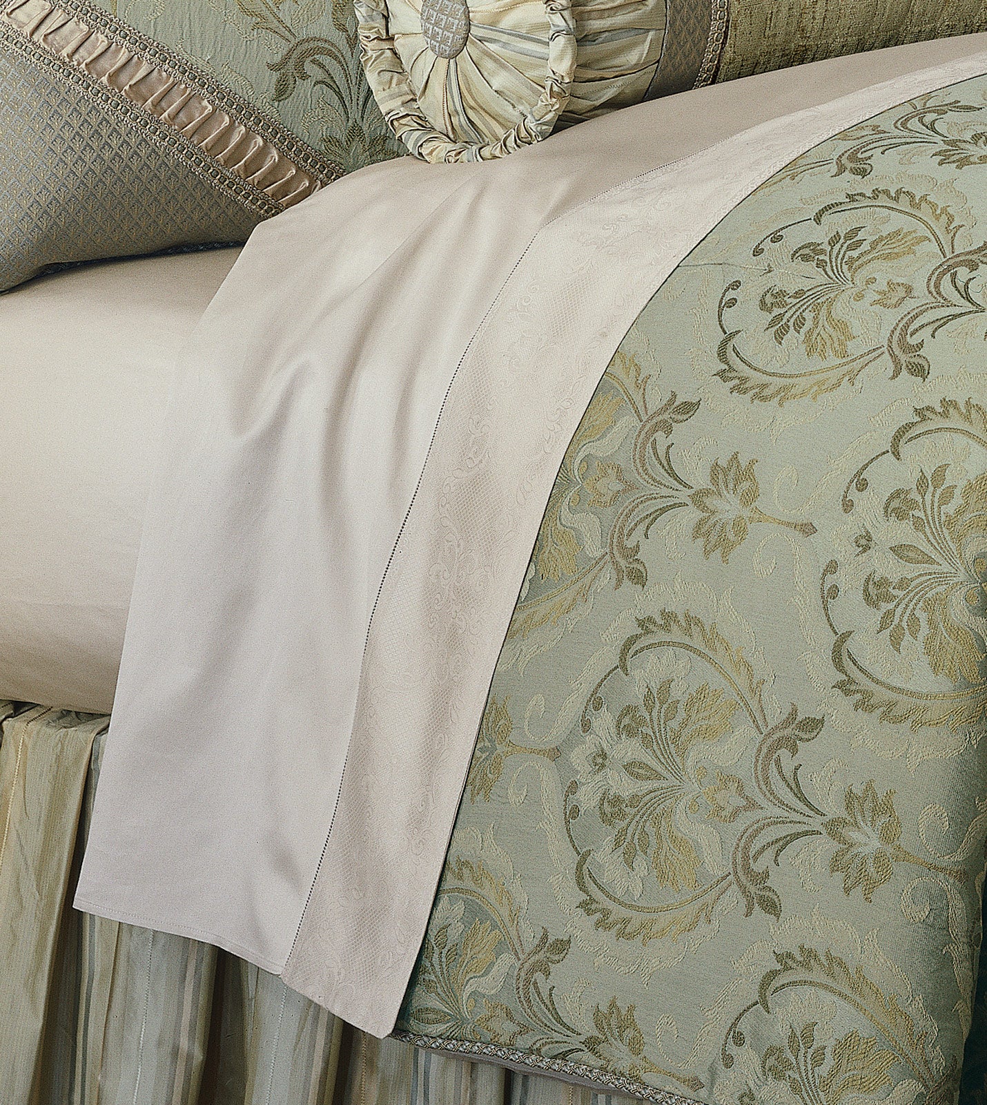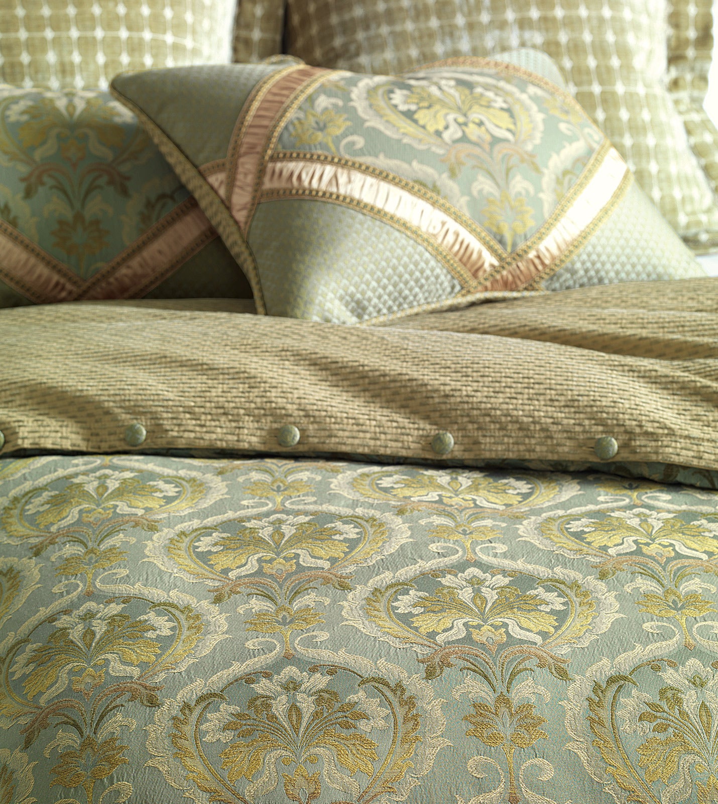 • Duvet cover with a damask pattern in sea blue, beige and aloe