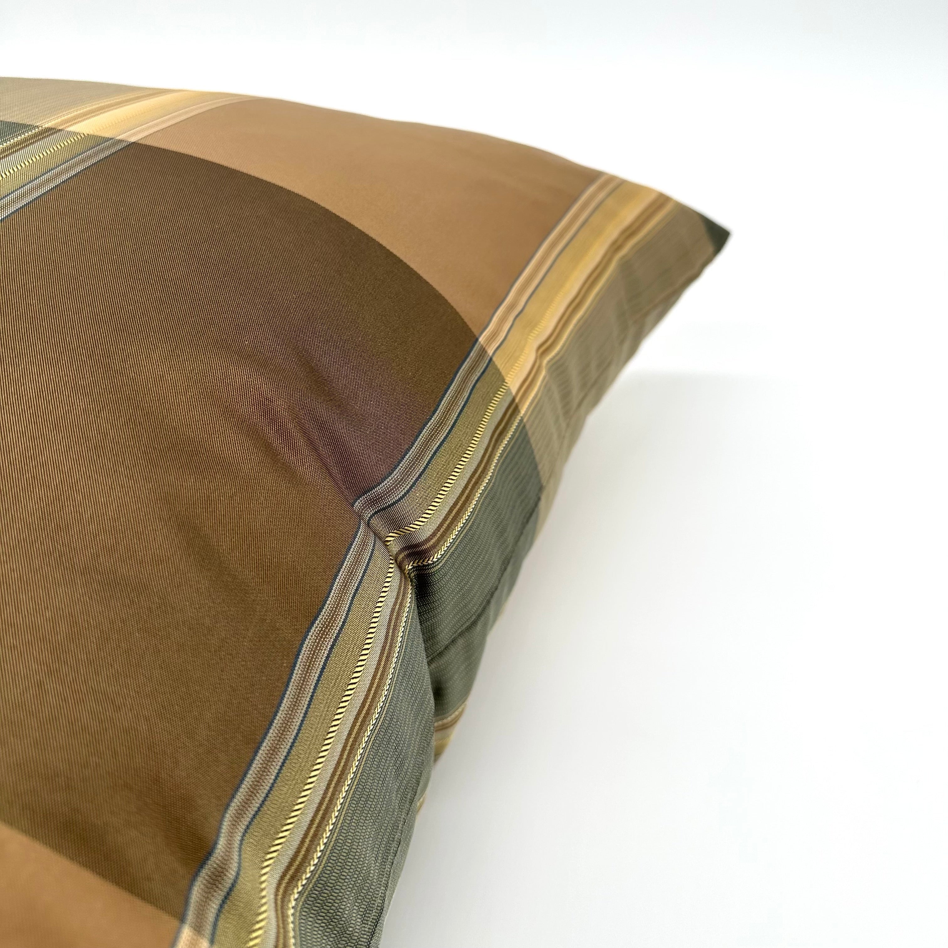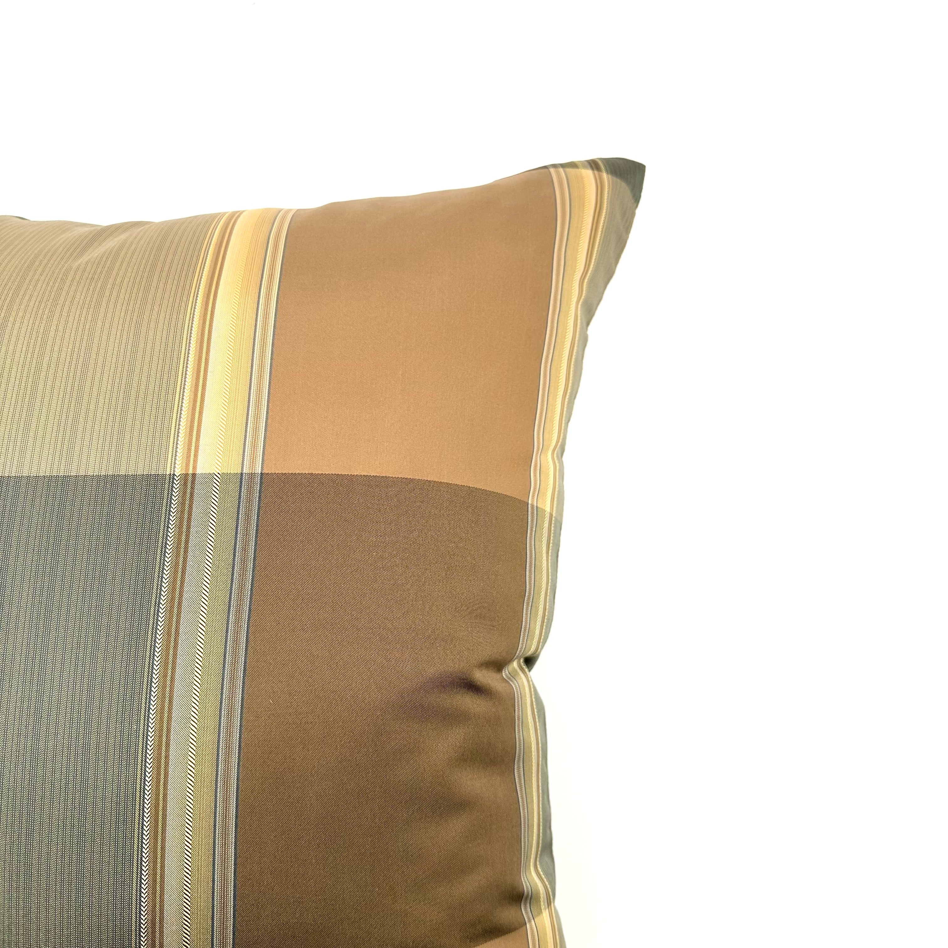 • Jacquard decorative pillow cover with a warm plaid pattern in brown, yellow, and tan
