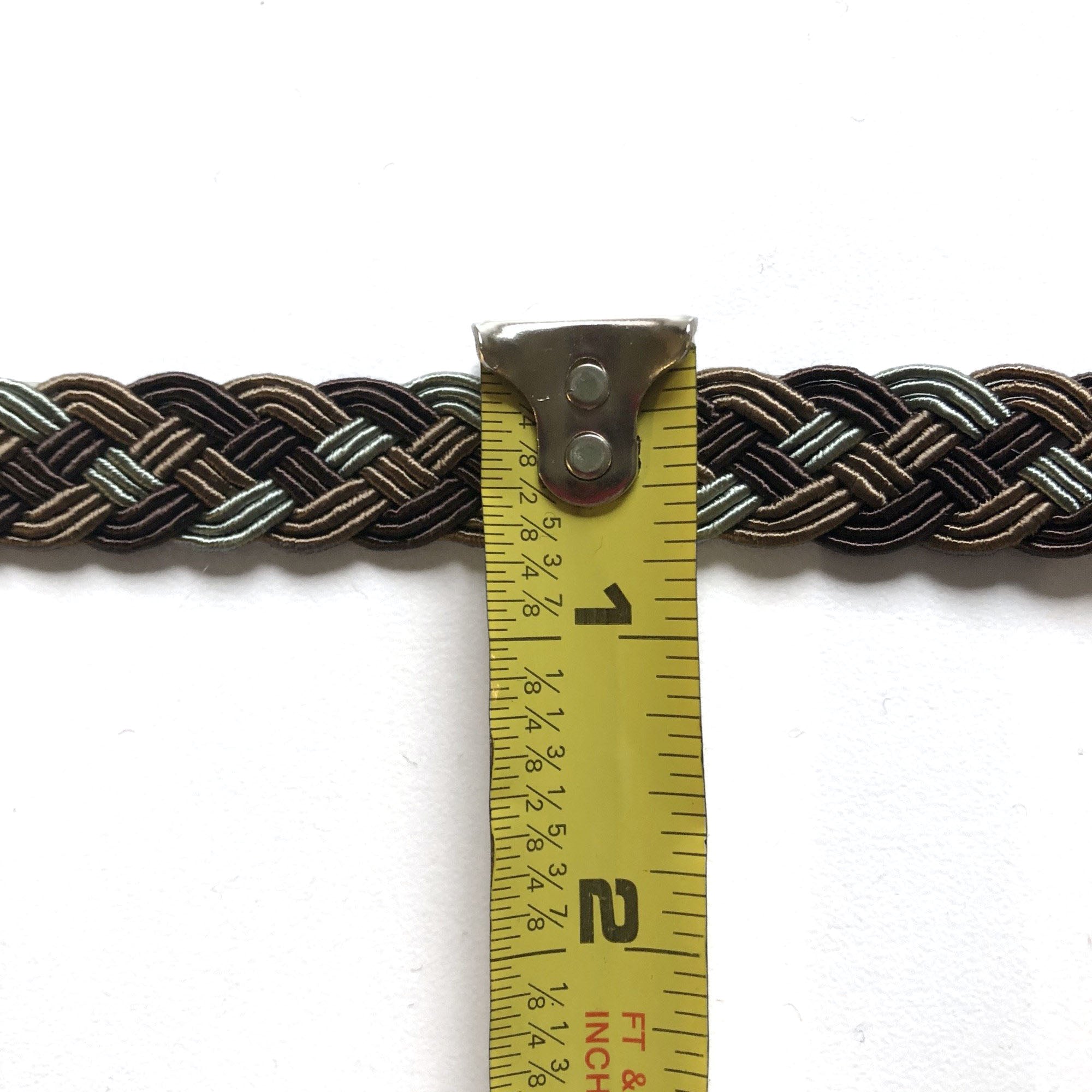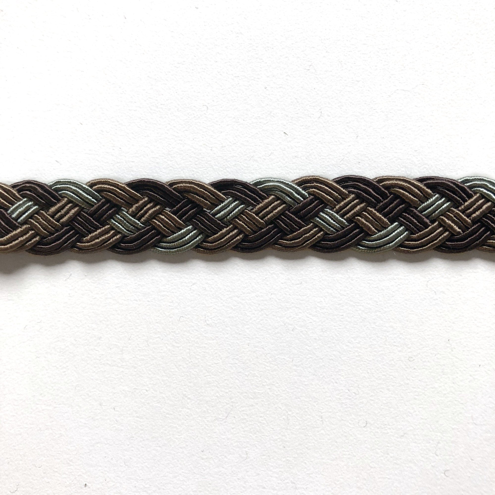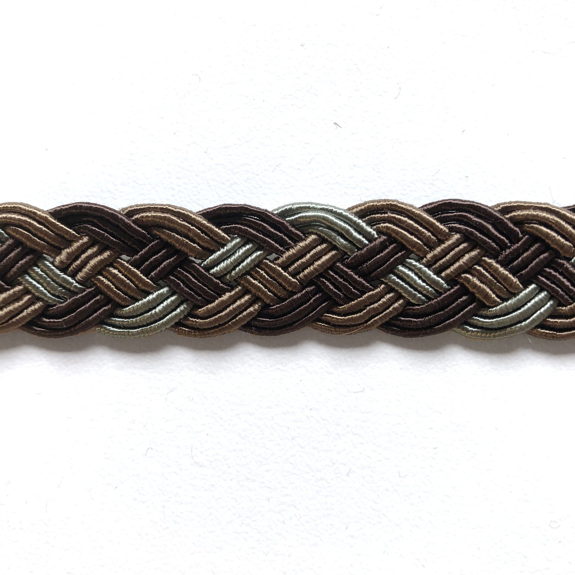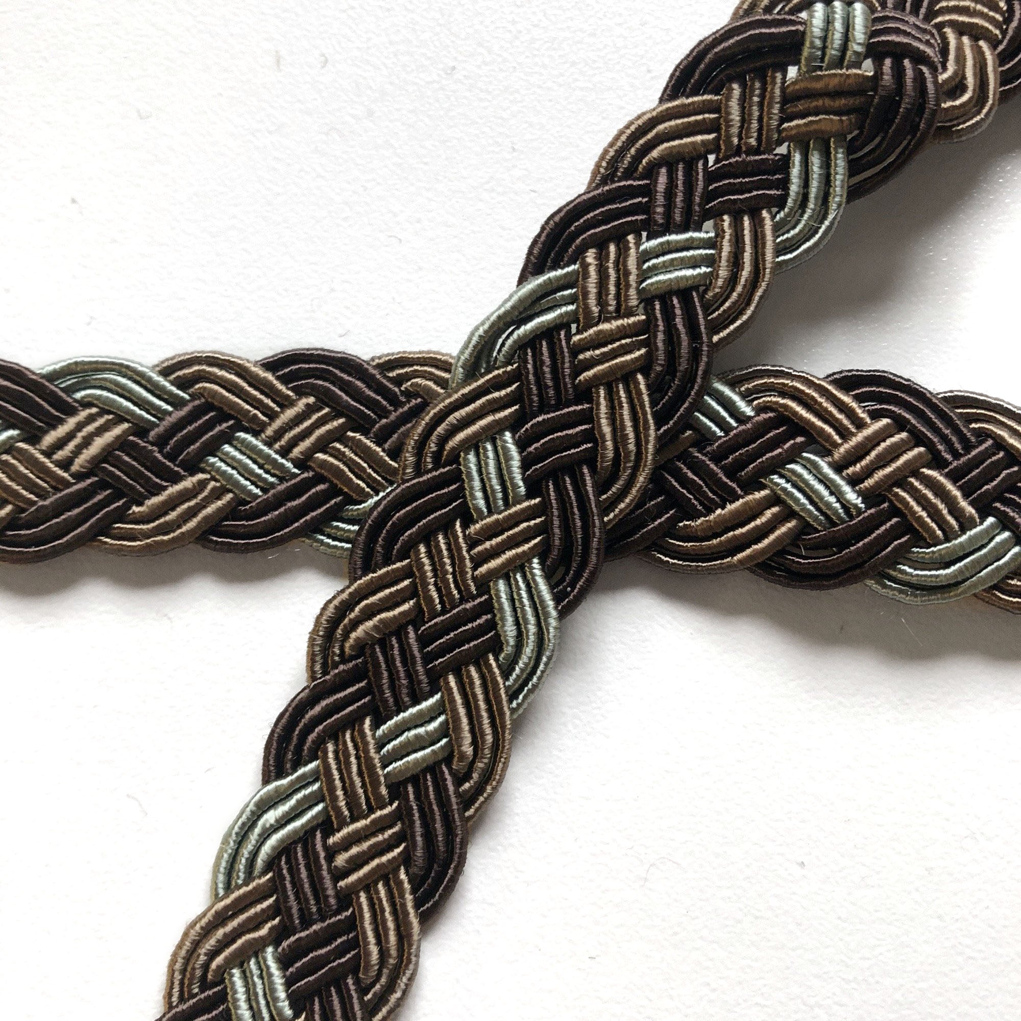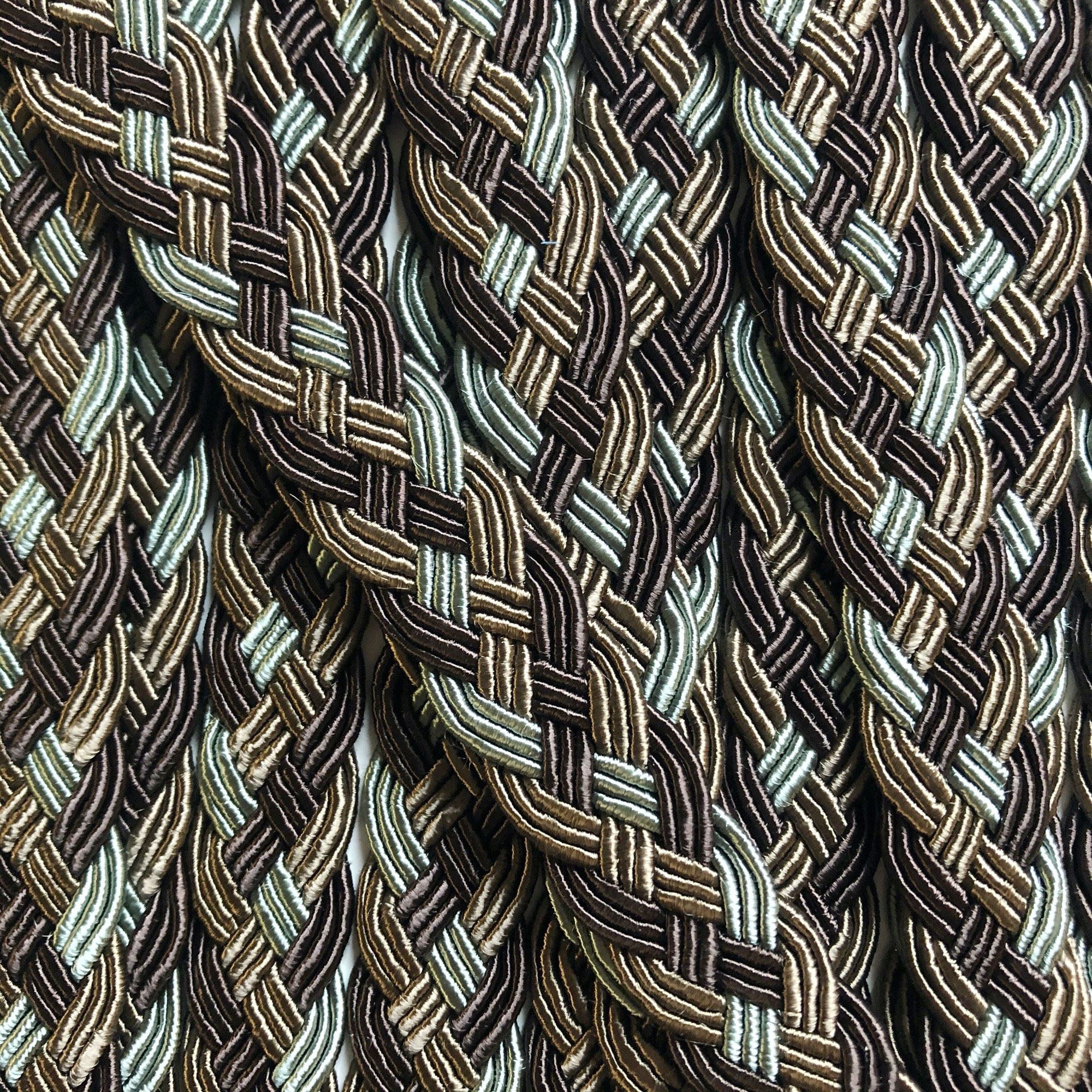 Decorative gimp trim with bronze, turquoise, and brown threads.