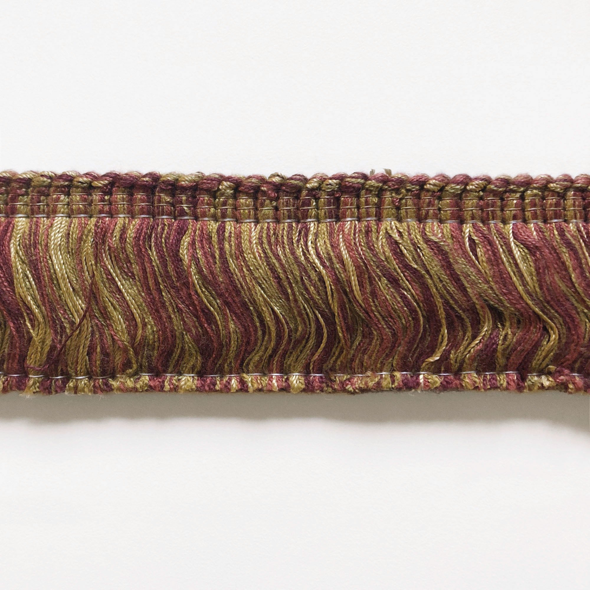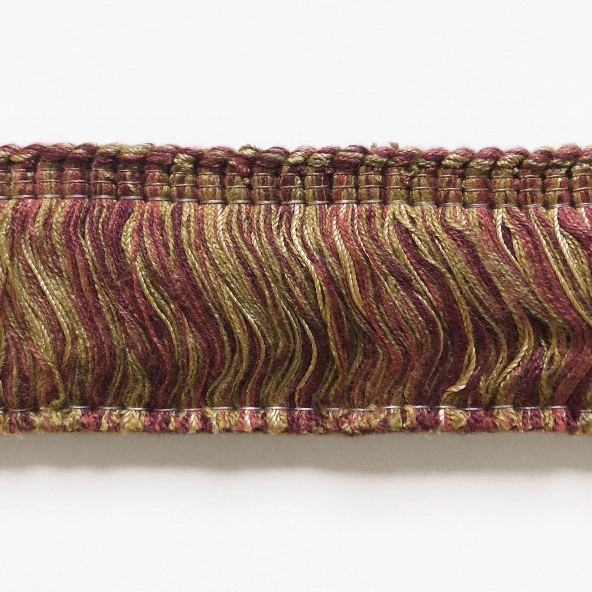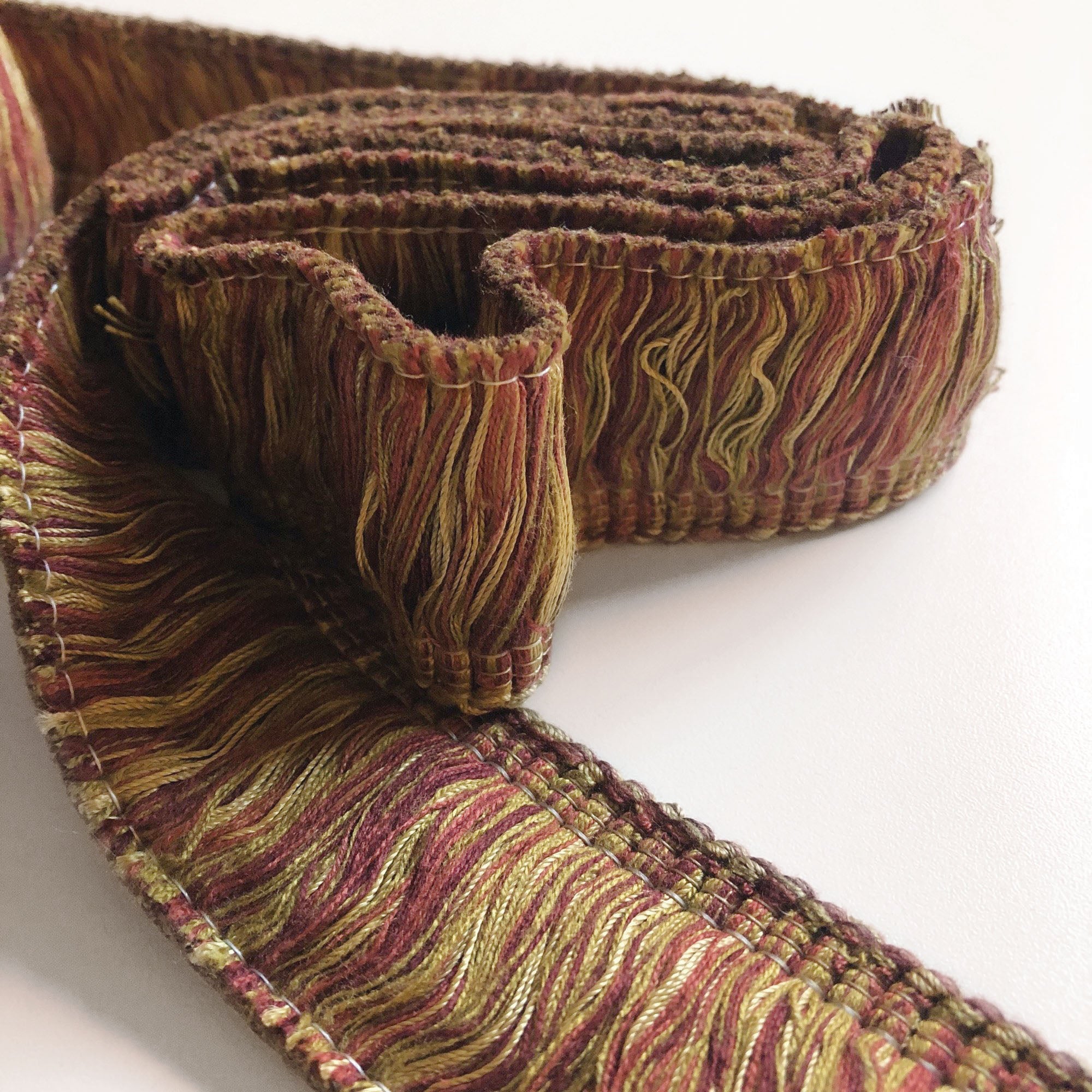 Decorative brush trim fringe with fuschia and mustard yellow threads.