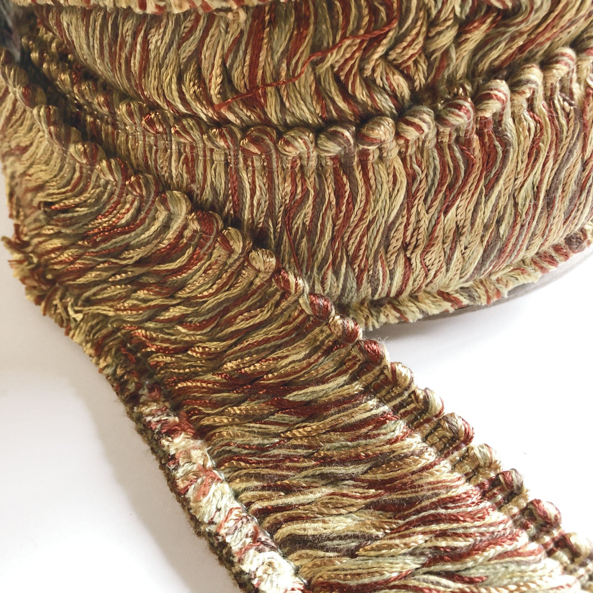 Decorative brush fringe trim with rust red, gold, and brown threads.