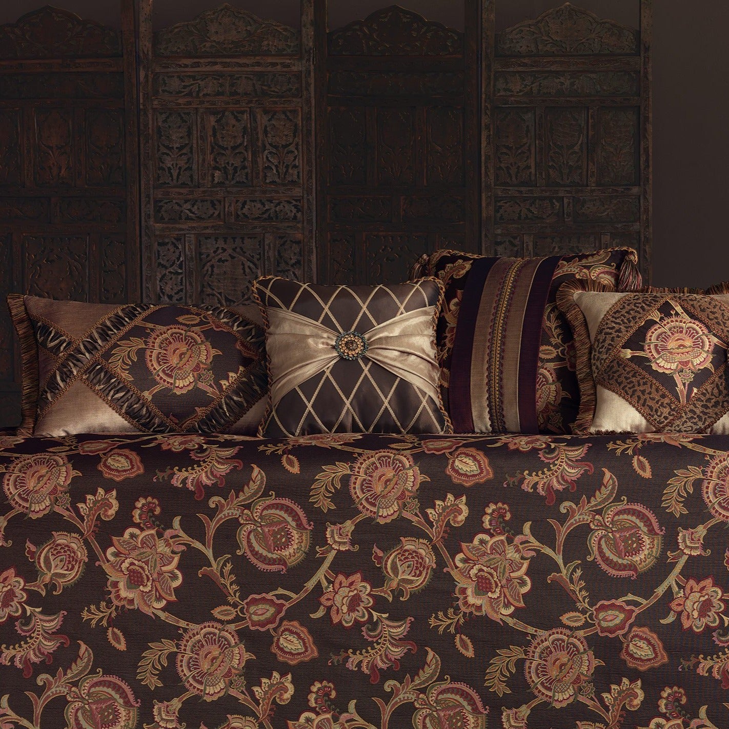 Embrace Cassandra and experience old world opulence. Luxurious damask and velvet fabrics in high contrast jewel tones meet ornate trimmings to convey the highest level of aristocratic taste.