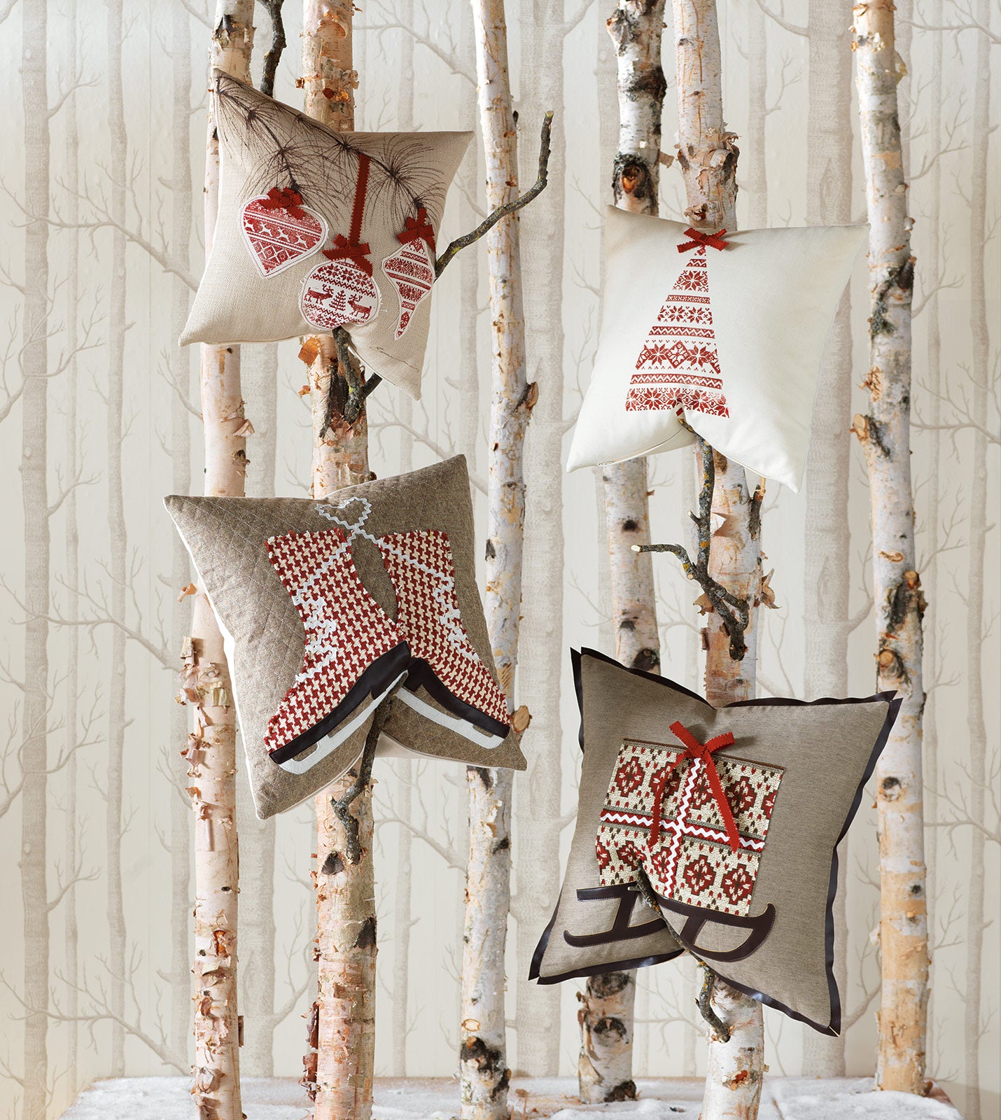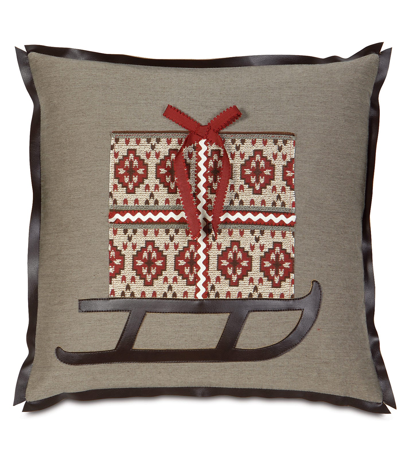 - Christmas themed decorative pillow featuring nordic holiday gift wrap applique on face