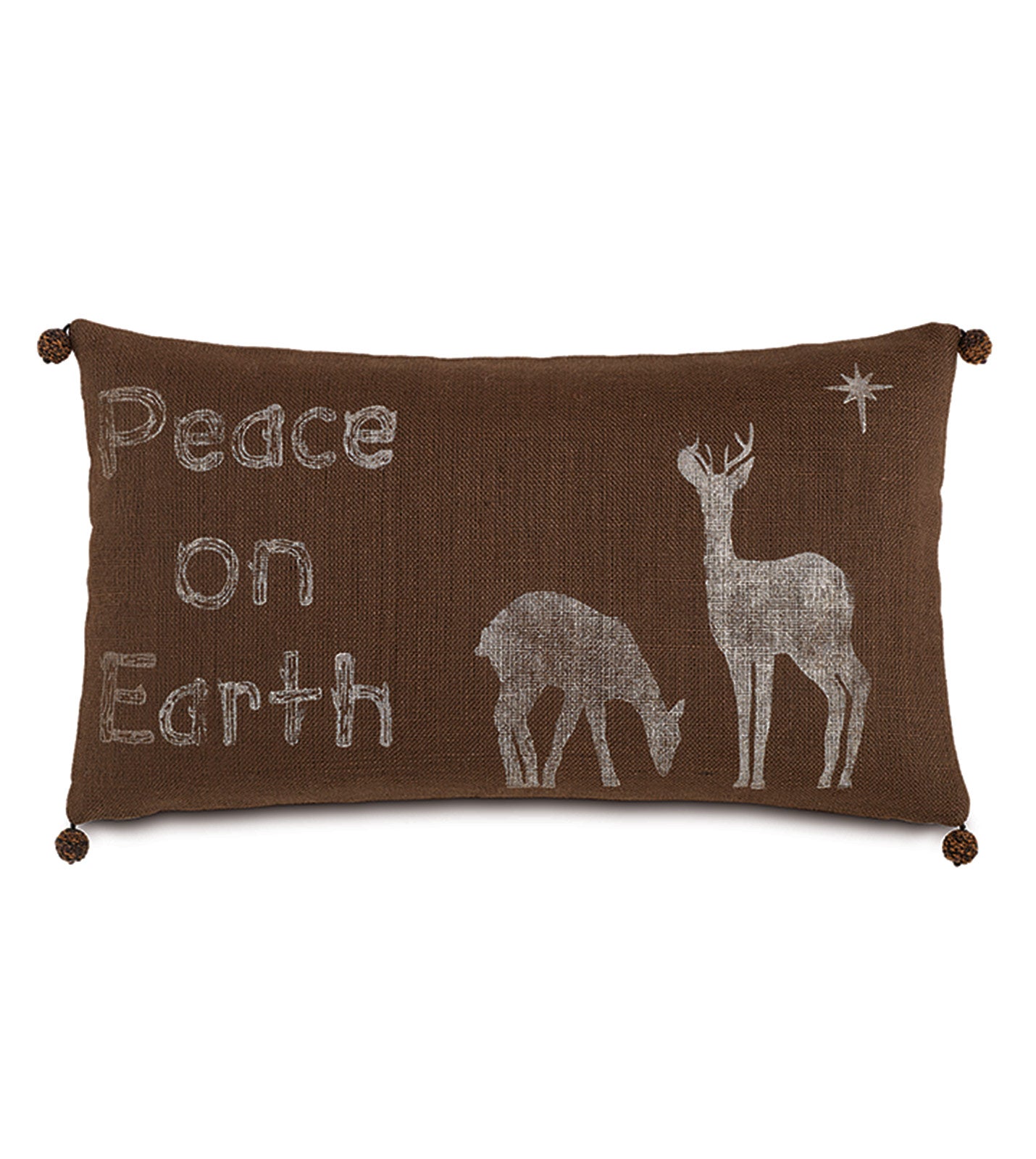 Adorn your home with the Peace on Earth Jute Decorative Pillow Cover 15x26. Give your living room, bedroom, family room, and more a fresh new look with our selection of high quality decorative pillows curated by a team of trend leading designers. This luxurious brown jute accent pillow meets flair with versatility, offering the perfect personal touch for any French Country aesthetic. Hand-crafted by dedicated professionals in the USA, this throw pillow cover is designed to last - without compromising on quality. The block printed letters and ball trim edge complete the look. Insert sold separately. Returns not accepted.