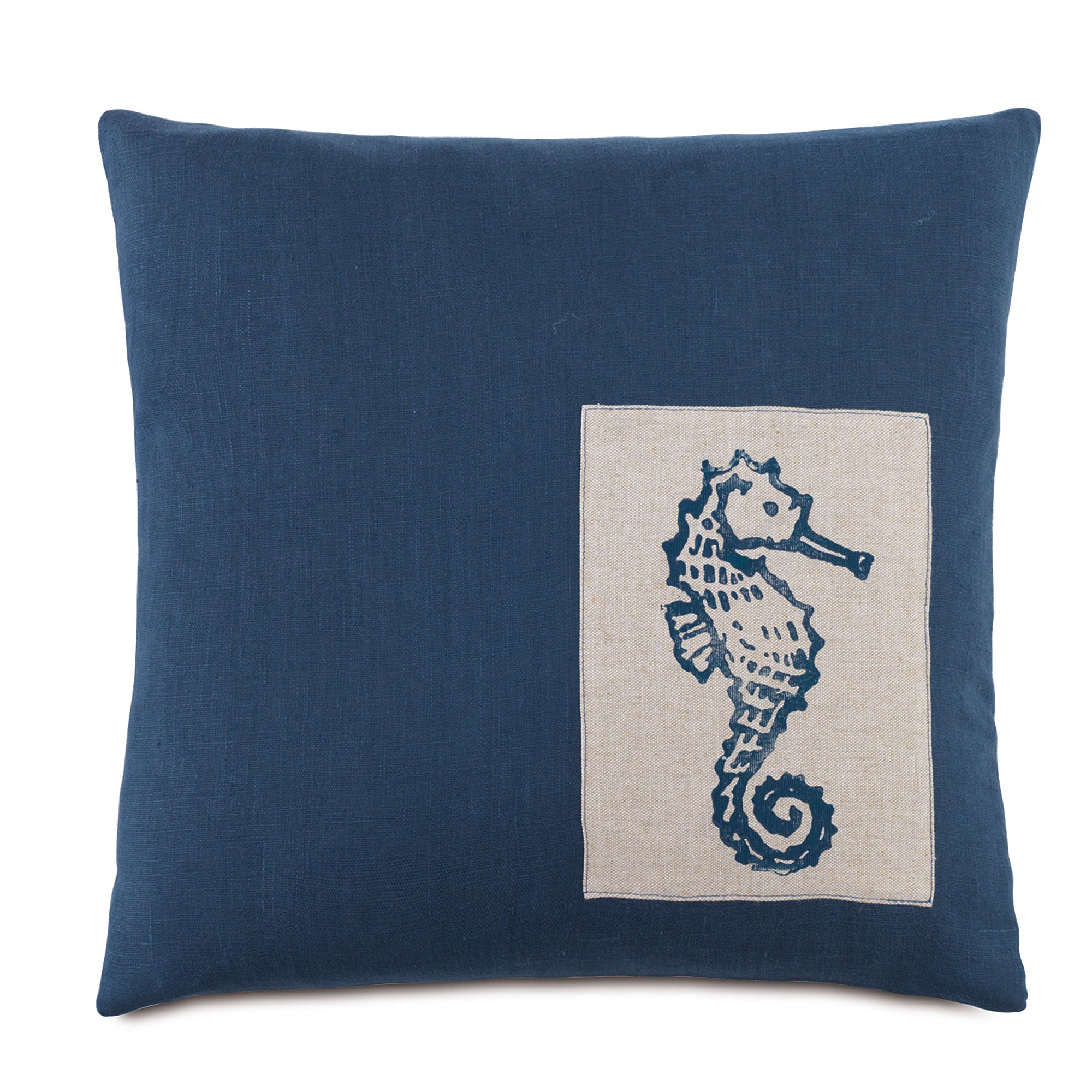 Throw pillow with block printed seahorse pattern on face