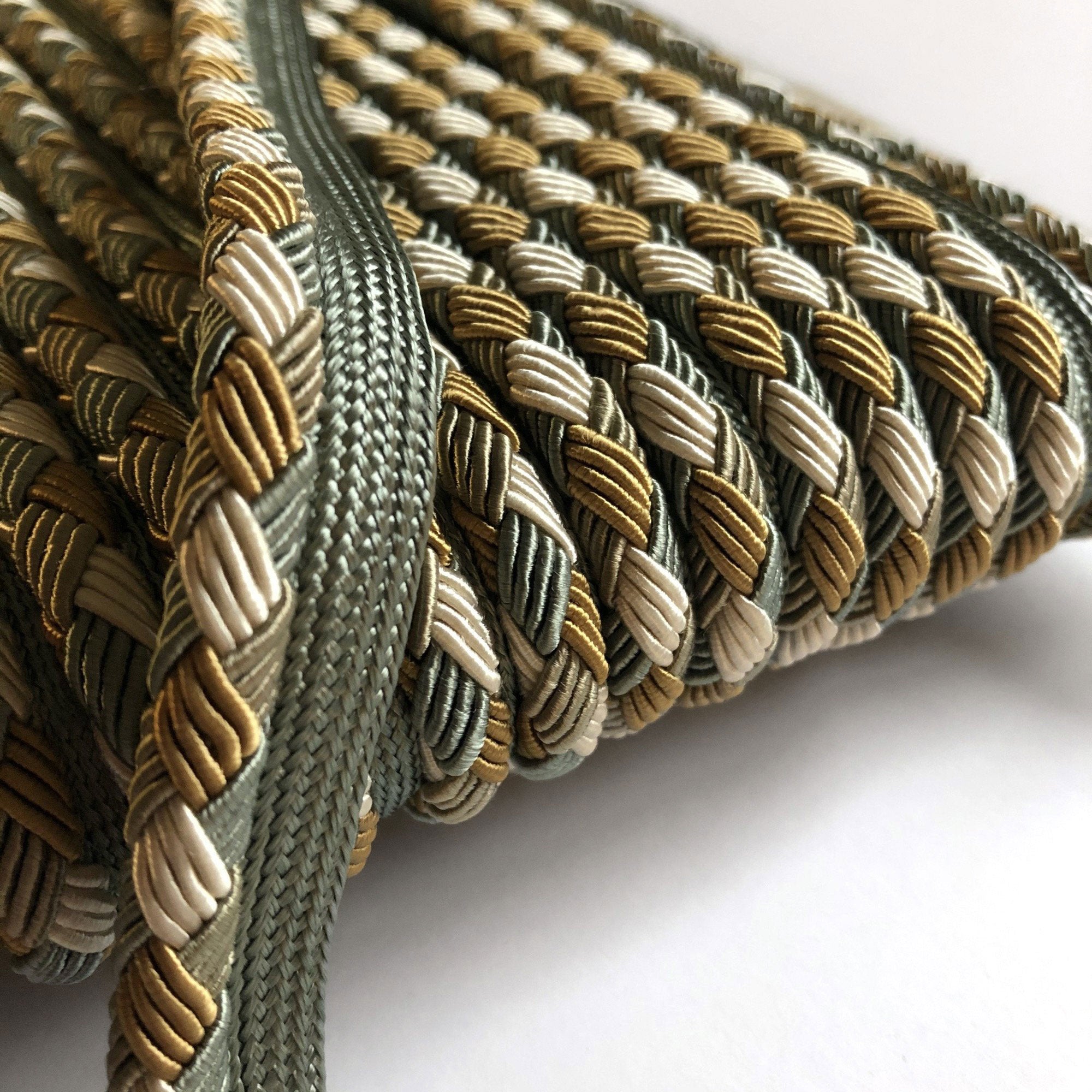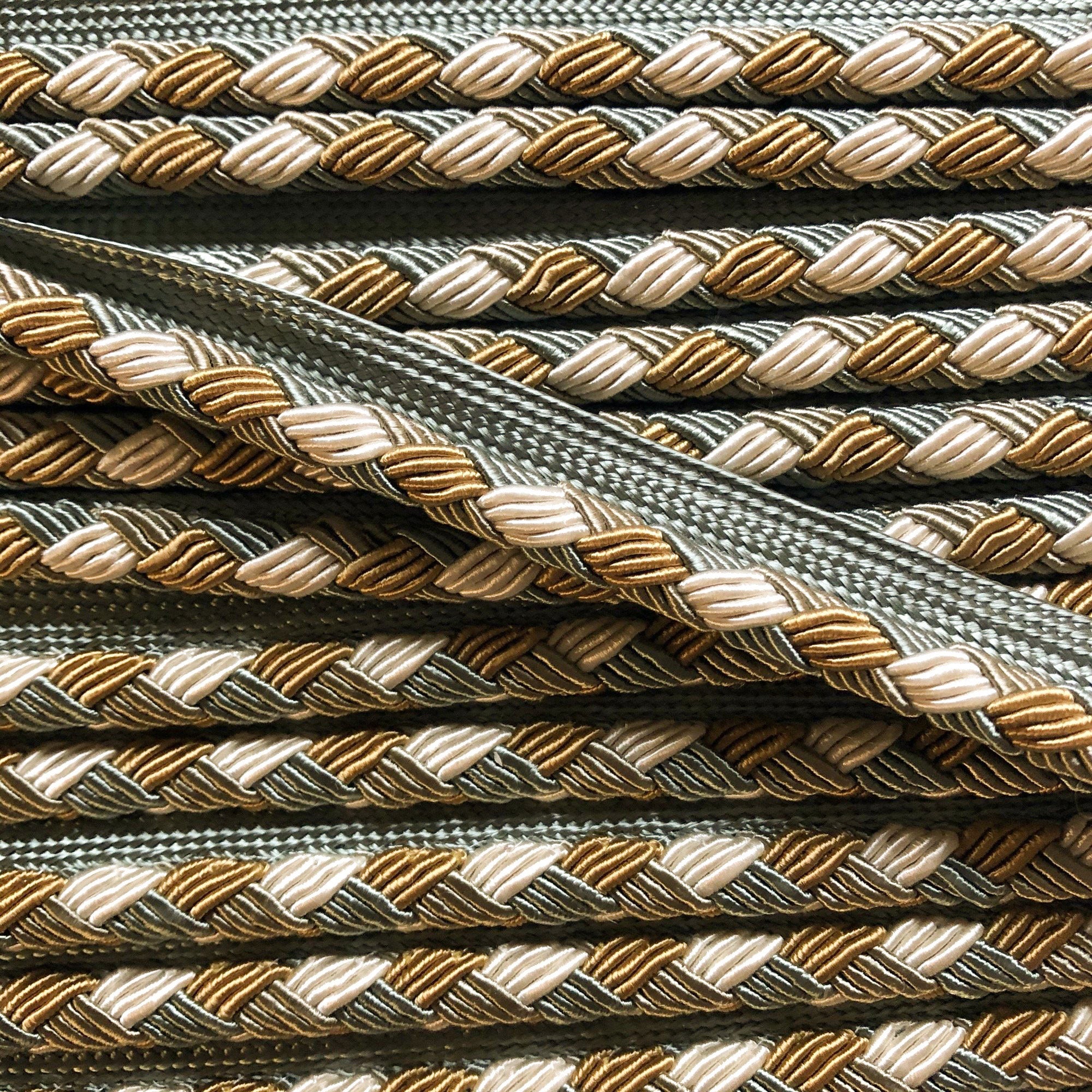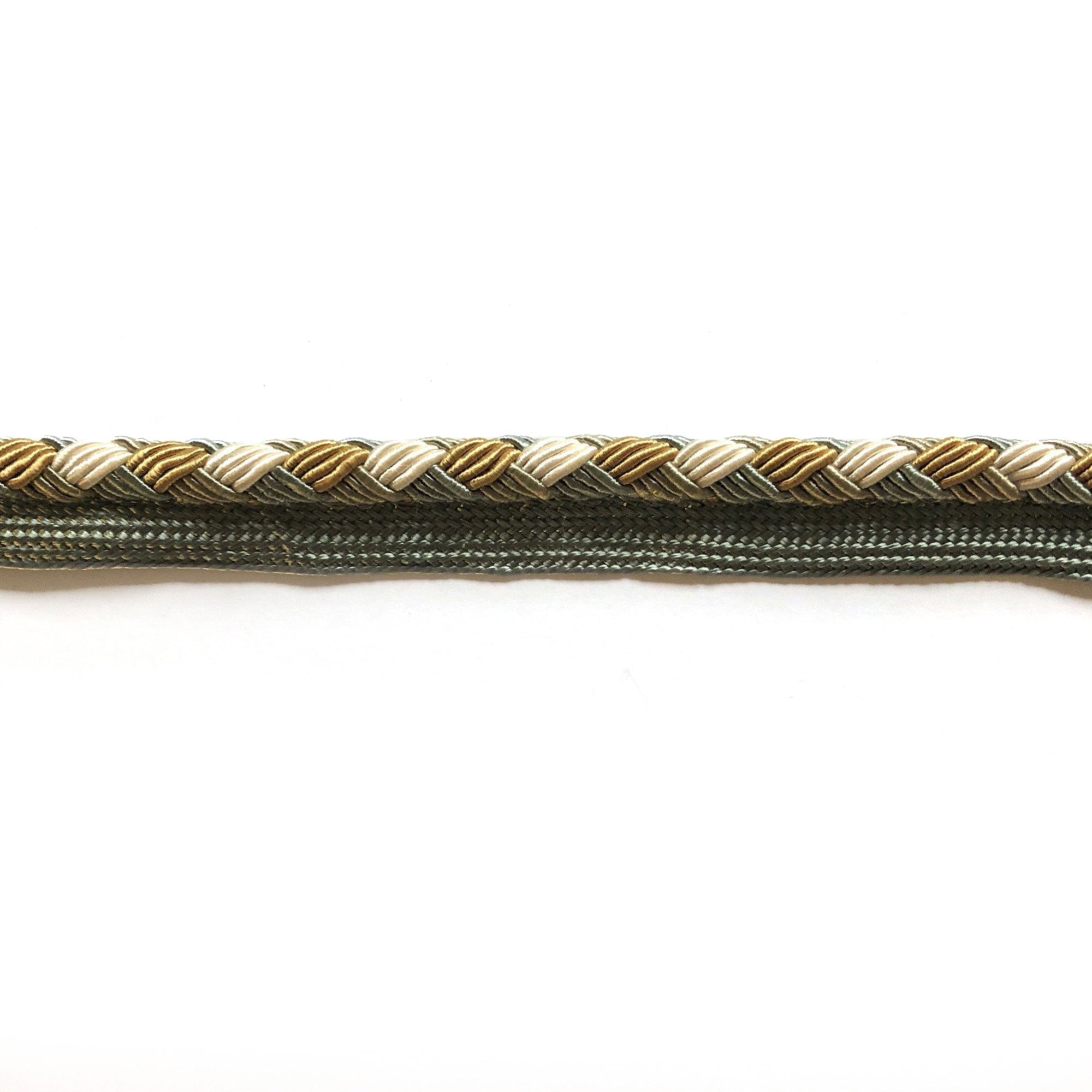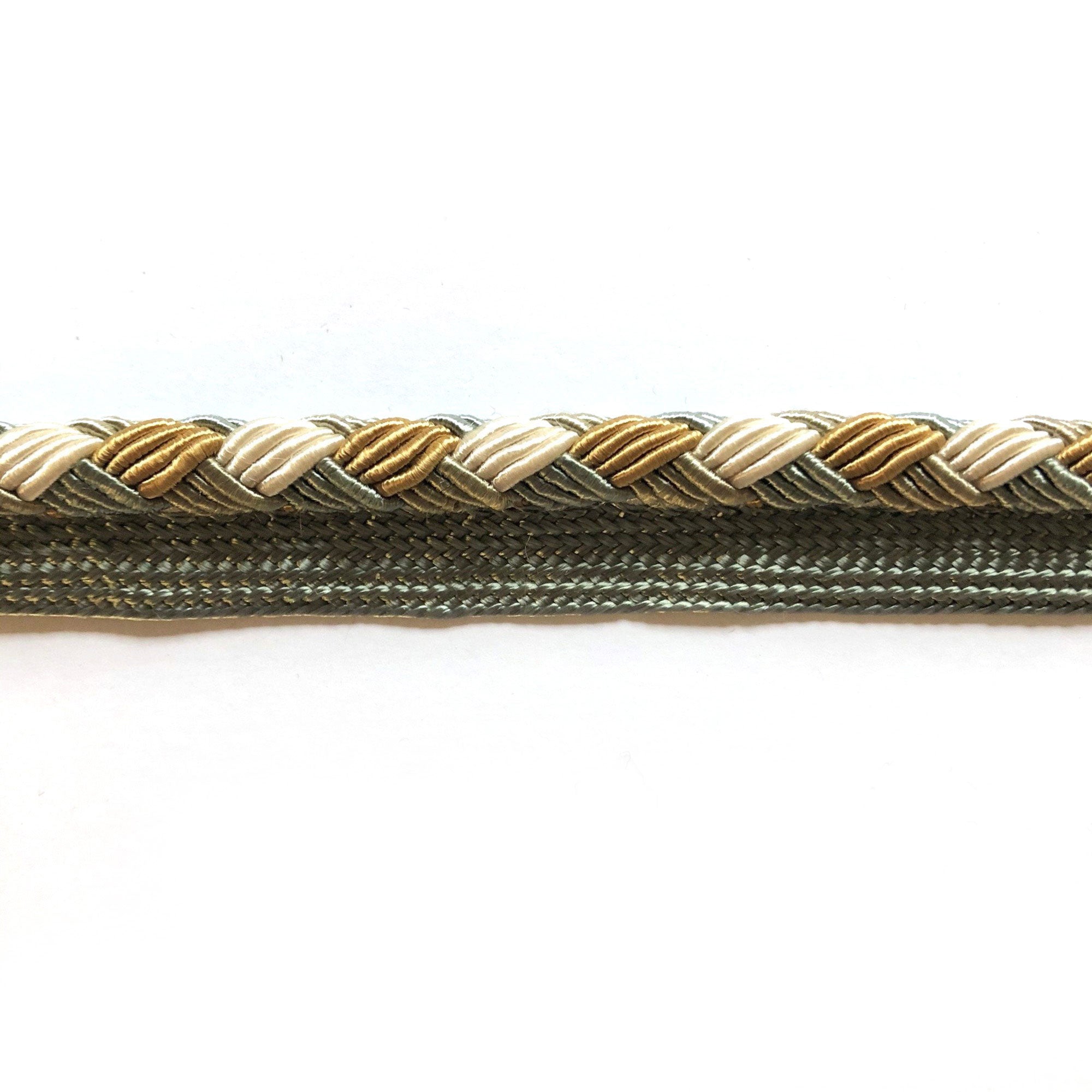 Decorative lip cord trim with seafoam green, gold, and white threads.