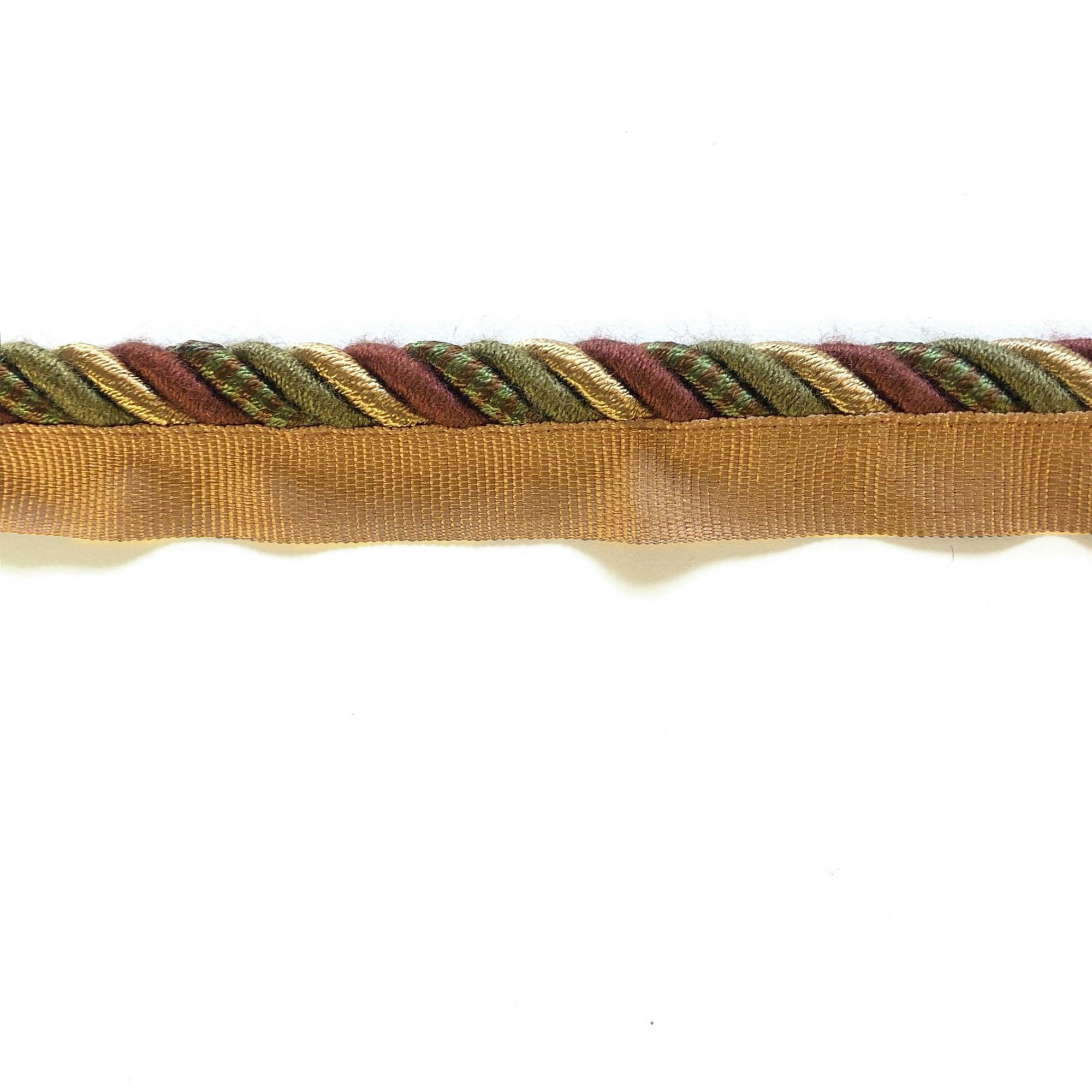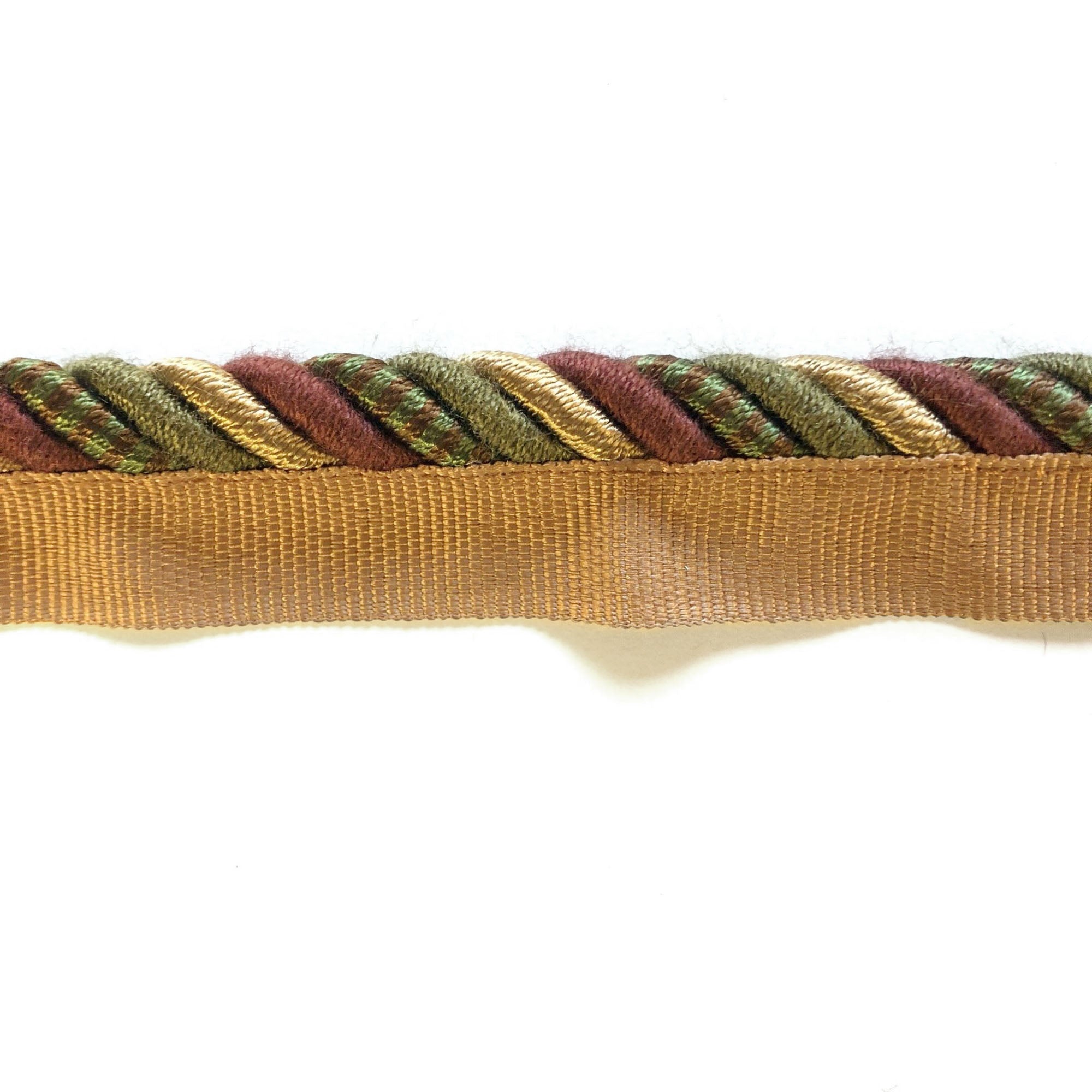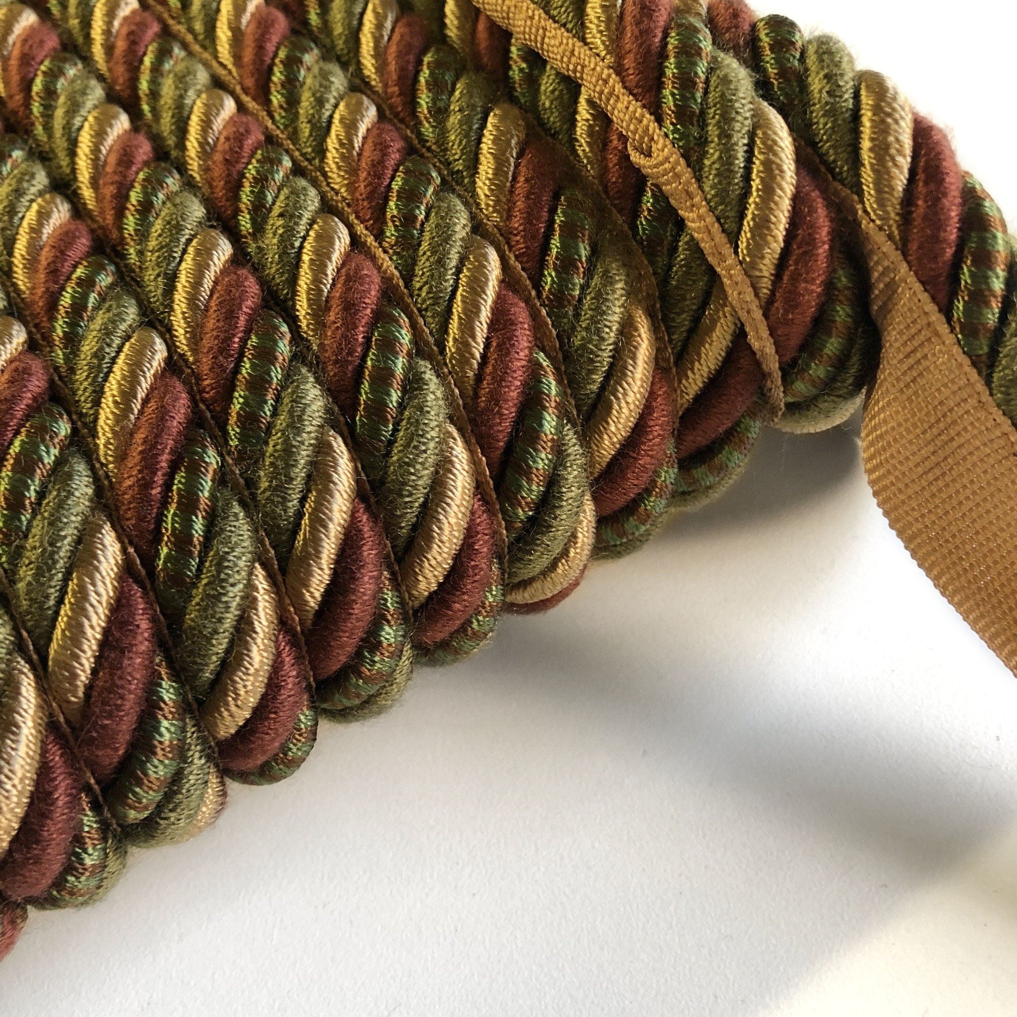 Decorative lip cord trim with twisted maroon, olive and gold threads.