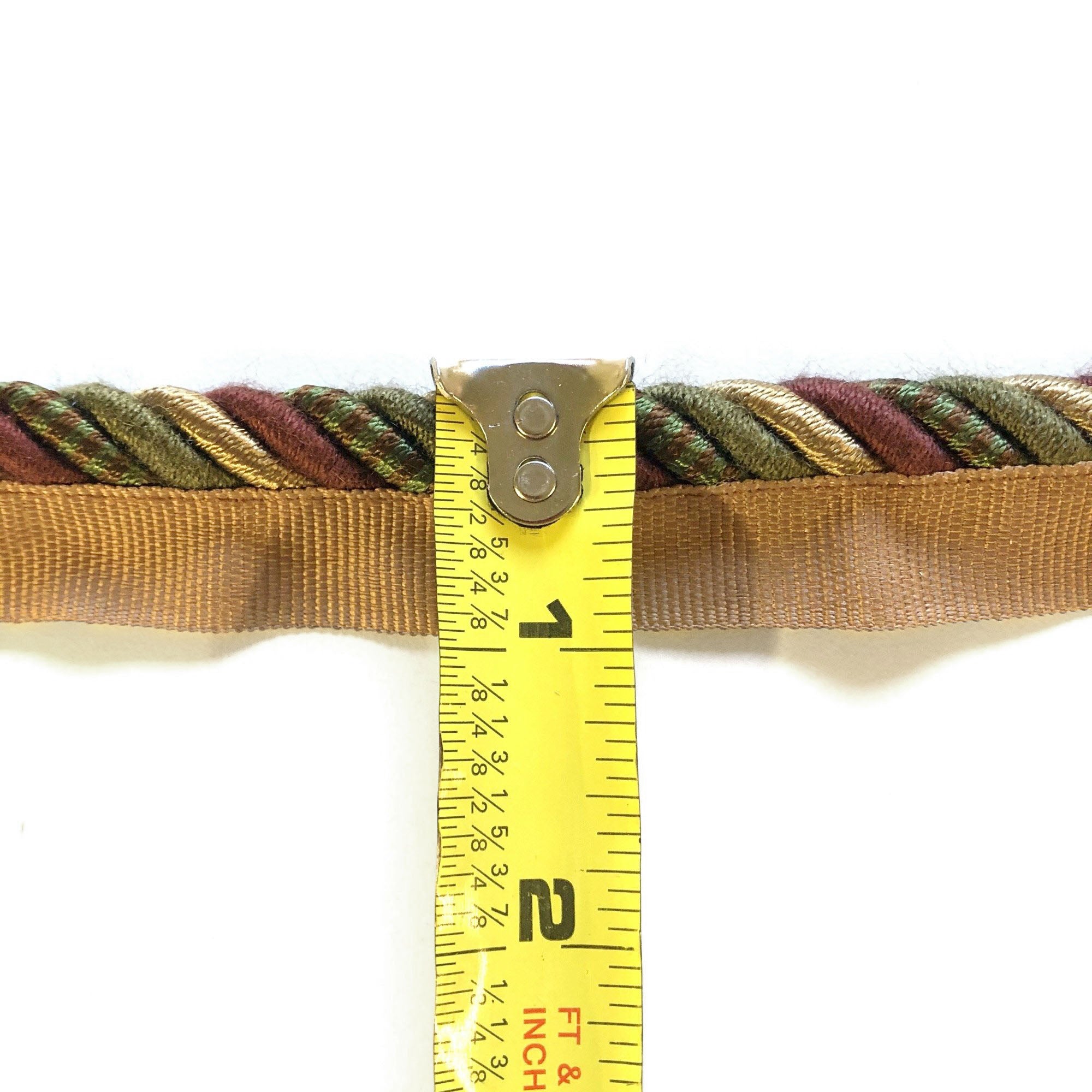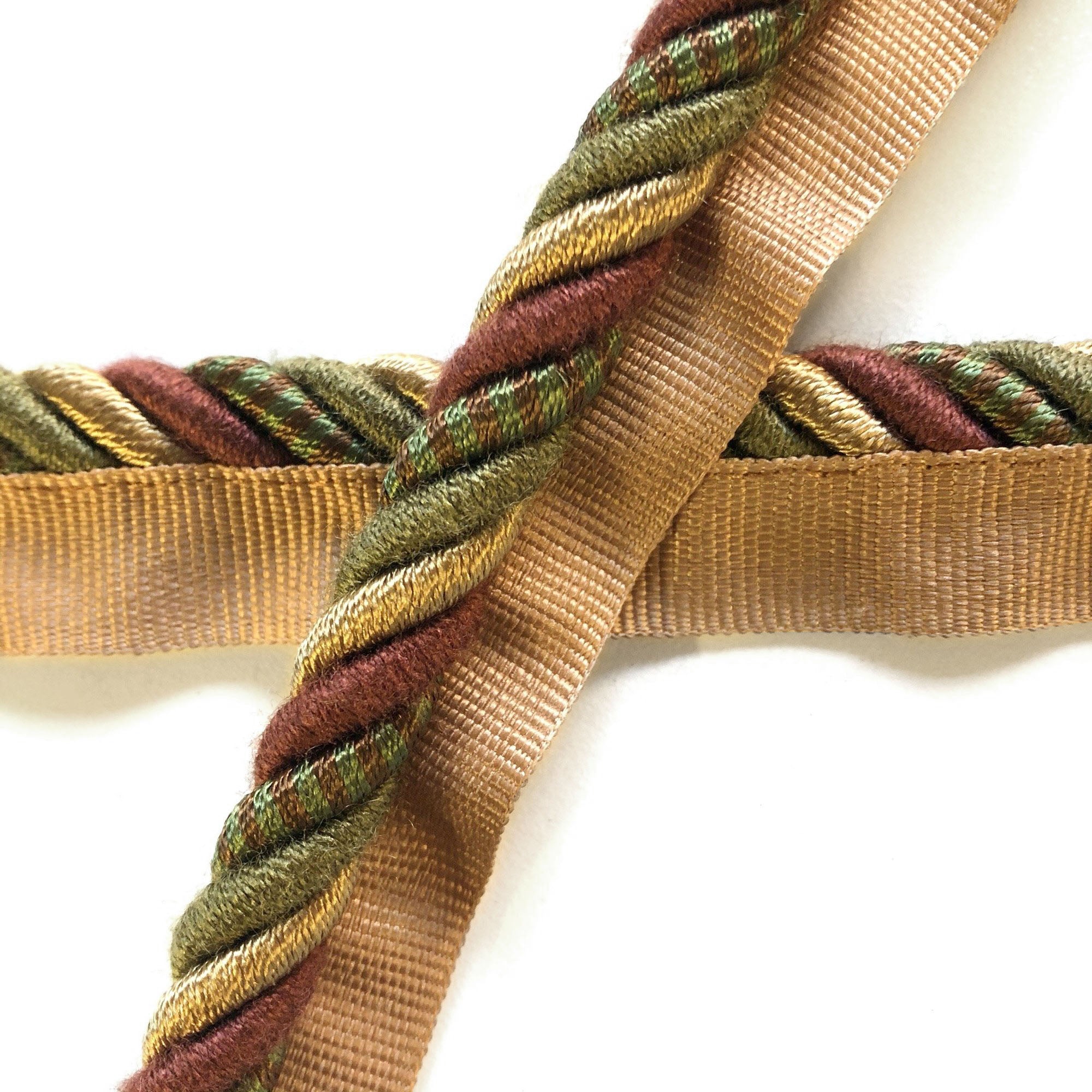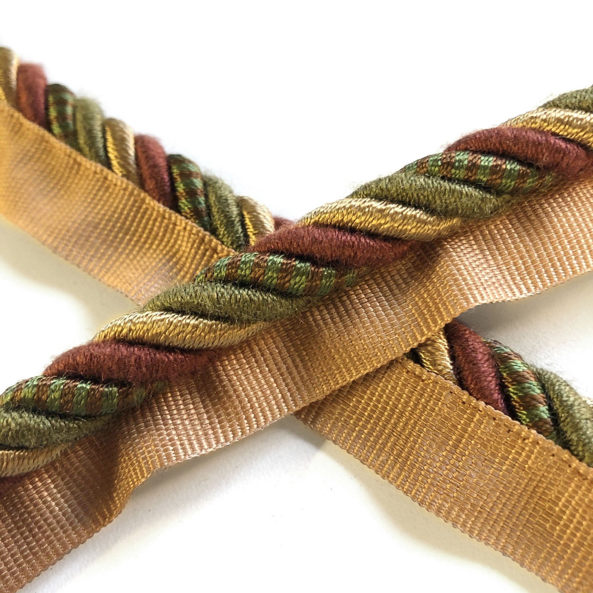 Decorative lip cord trim with twisted maroon, olive and gold threads.
