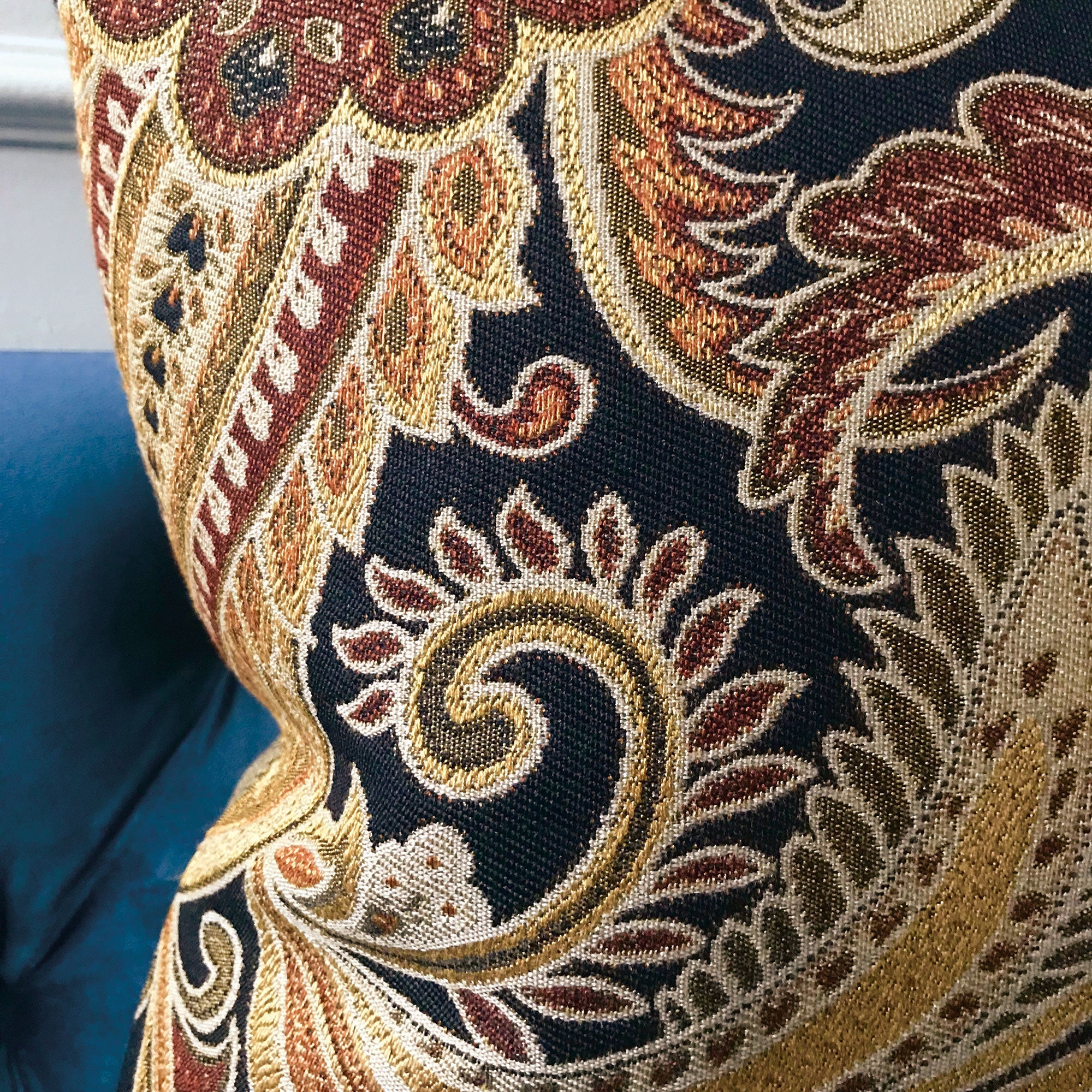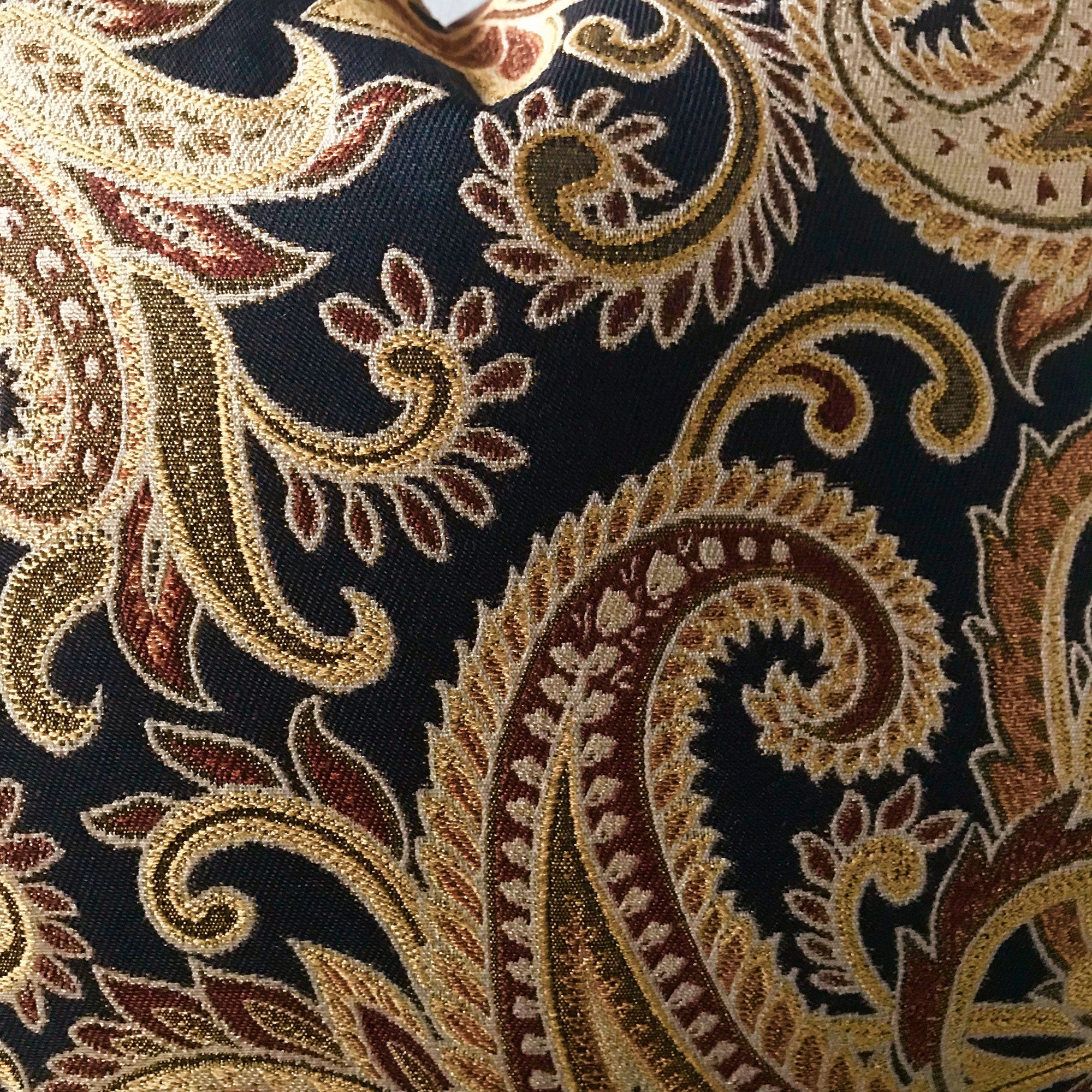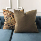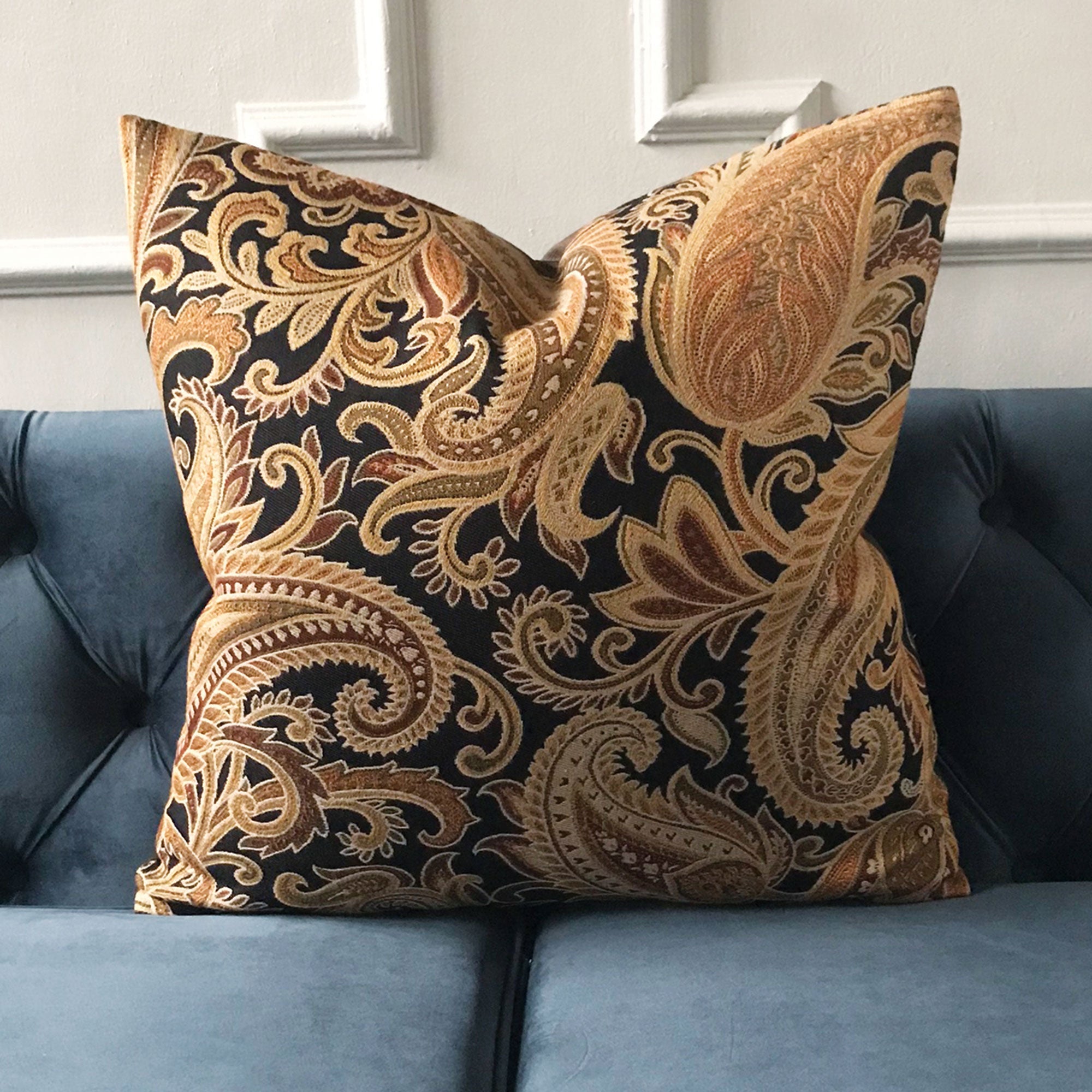 ⁌ Add refined elegance and timeless pattern to your décor with the Antique Paisley Floral Lumbar Pillow Cover. Designed in a 15x26 size, this decorative pillow cover features an intricately embroidered paisley motif in golden hues, blending classic artistry with rich texture. The backing is available in different fabric options, allowing you to customize the look to your space. Finished with a knife-edge for crisp structure and a hidden zipper for convenience, it’s proudly made in the USA.