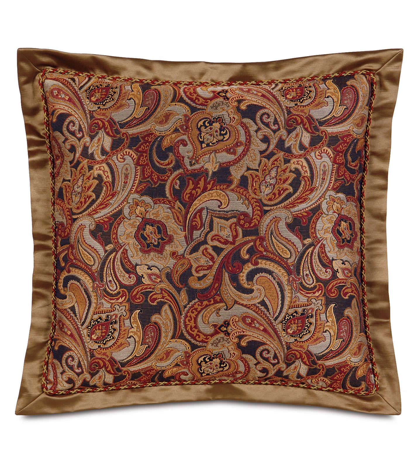 • 27x27 luxury Euro sham with an ornate crimson and gold paisley pattern