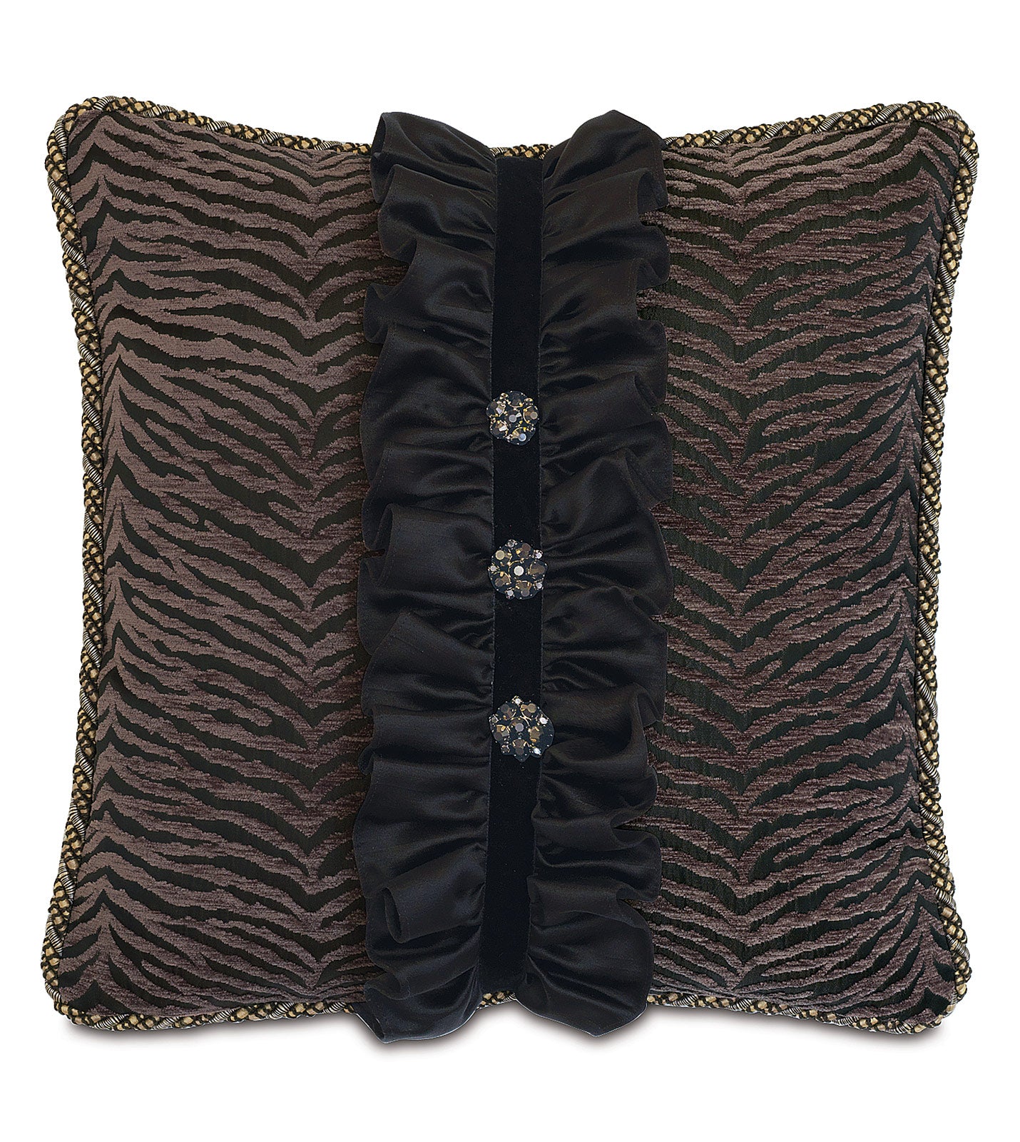 • Throw pillow featuring textured abstract patterns and ruffles in cool tones of black and taupe