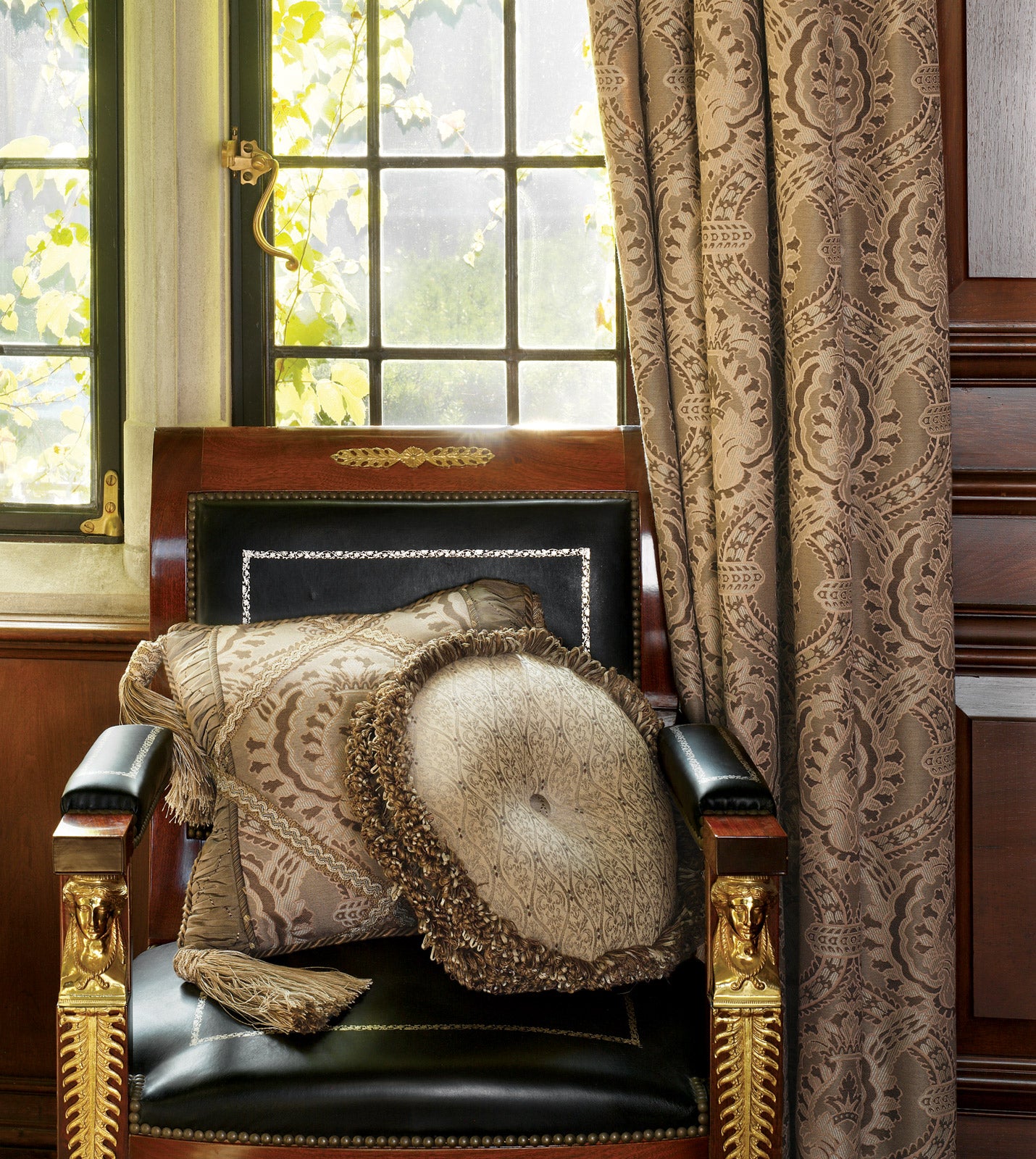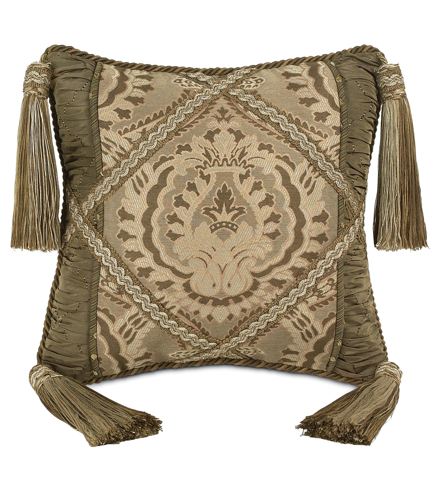 - Throw pillow with a damask pattern and bronze ruched detailing