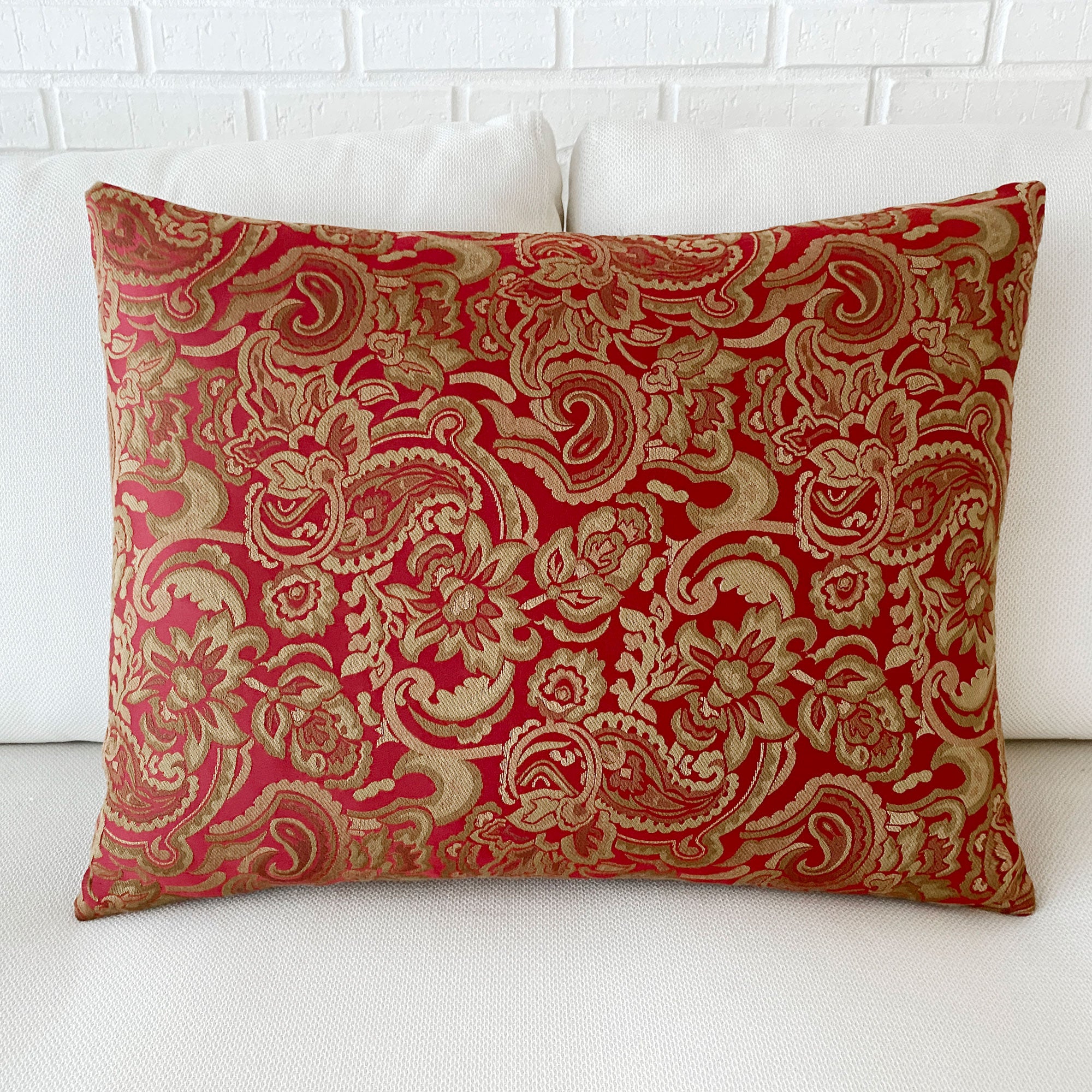 - Decadent floral paisley pattern in vibrant red and gold for a bold, elegant statement