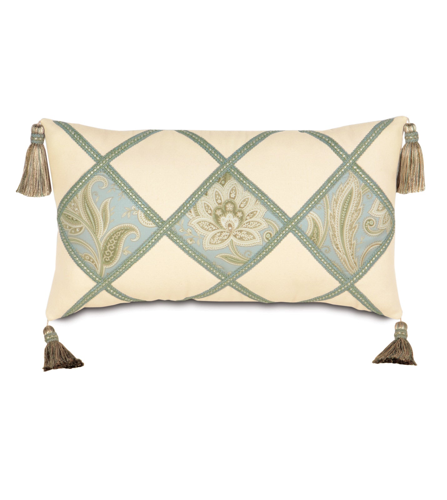 - Decorative pillow cover with diamond-shaped paisley collage design in ocean blue and light beige
