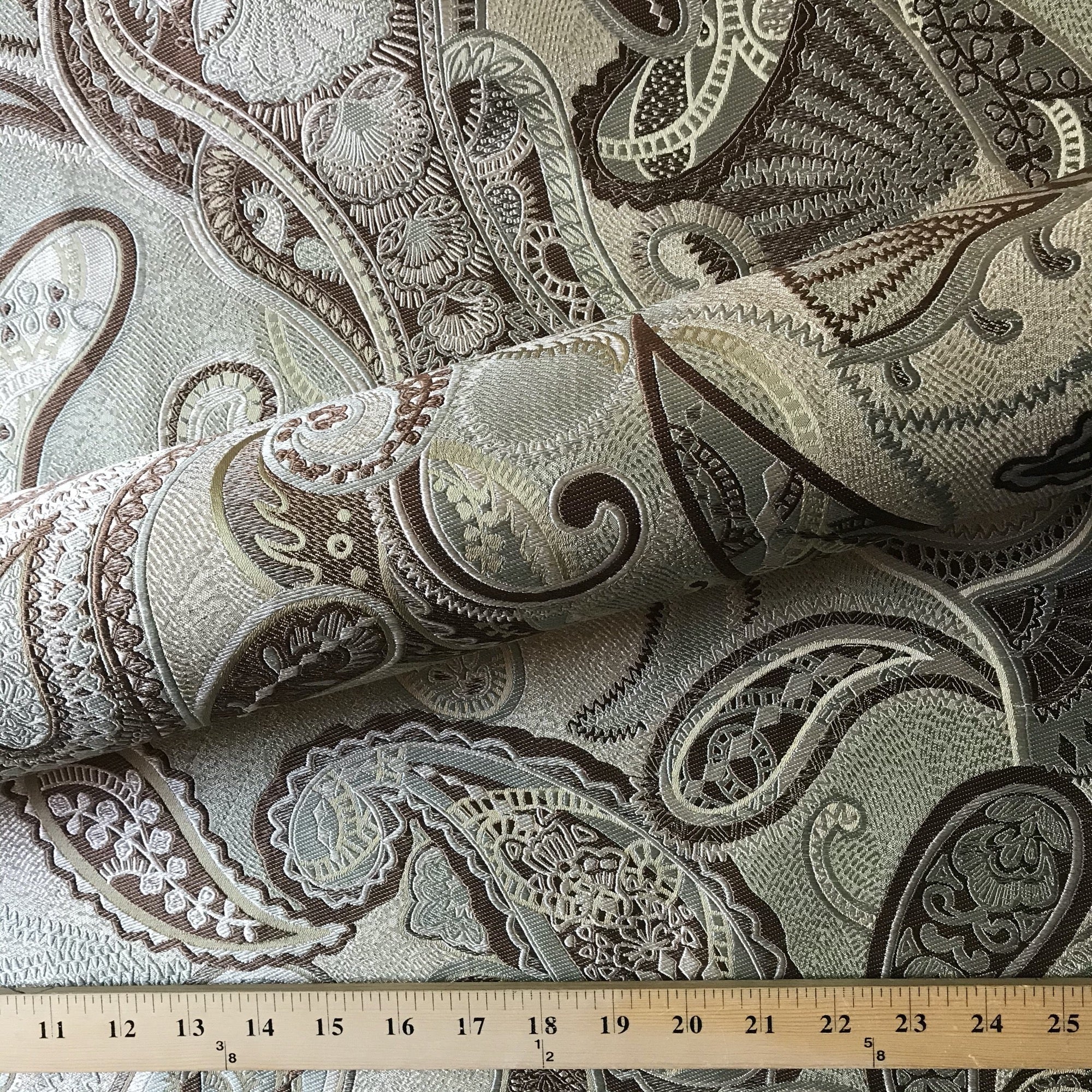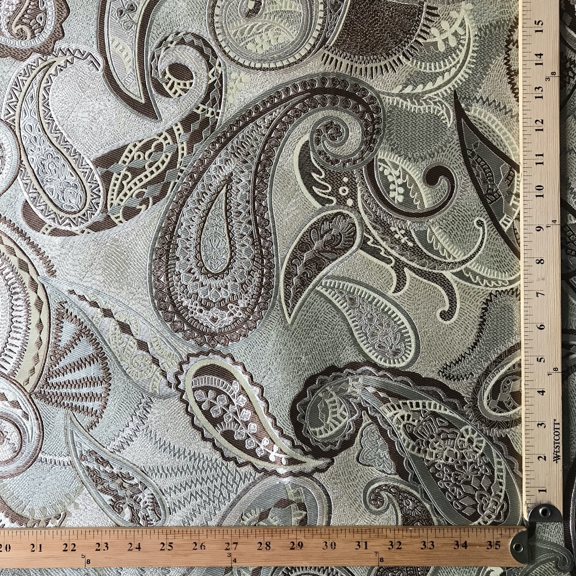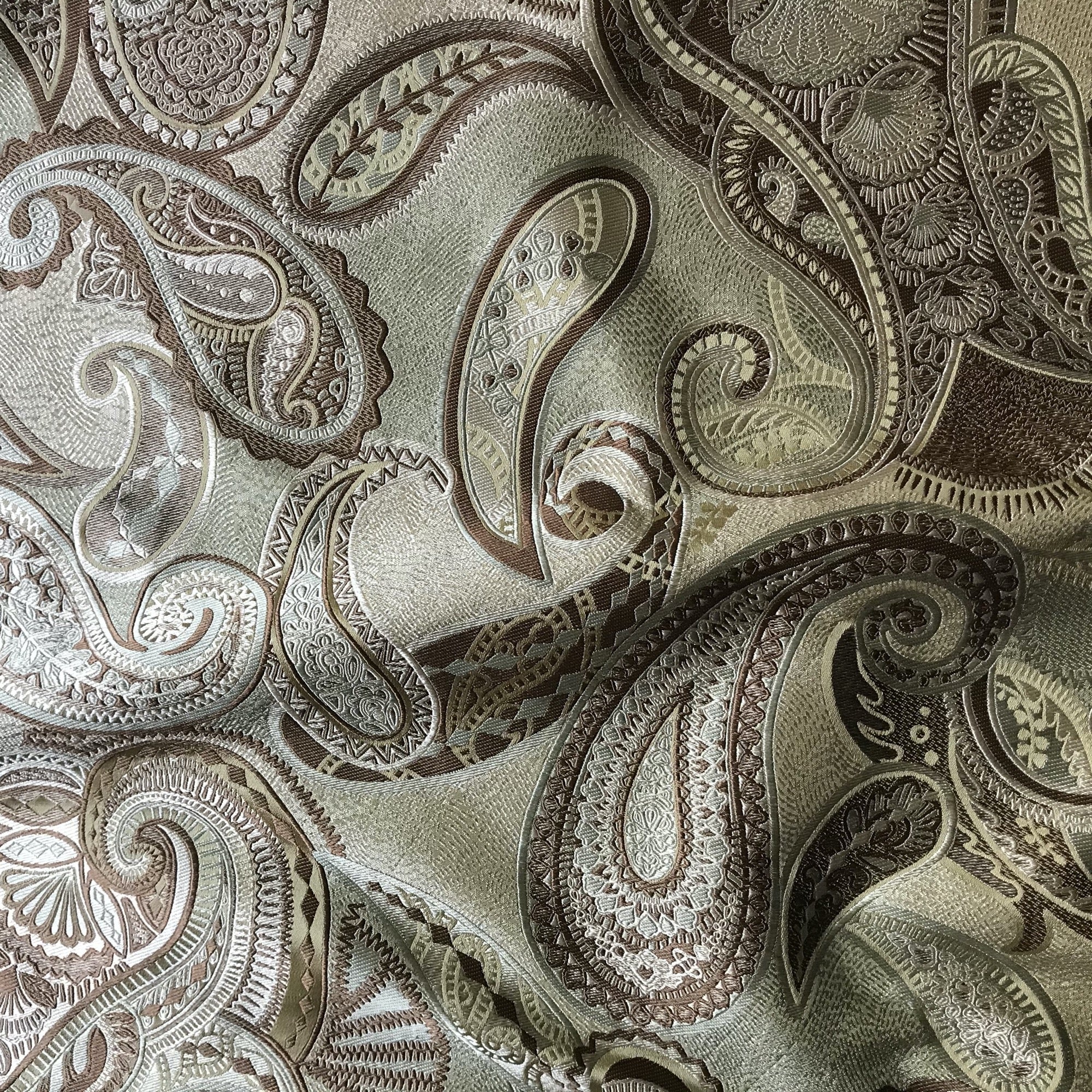 Adorn any interior with this Sage Traditional Paisley Jacquard Upholstery Fabric 54", perfect for arts and crafts, DIY, upholstery, home decorating, and more. Give your bedding, chairs, cushions, windows and more a fresh new look with our selection of high quality fabrics curated by a team of trend leading designers. This luxurious paisley jacquard upholstery fabric in sage meets flair with versatility, offering the perfect personal touch for any traditional aesthetic. Designed and crafted by skilled textile artisans this fabric is made to last and never compromises on quality. All fabric is sold by the yard in 1-yard increments. Unfortunately, we do not accept returns on fabric orders but swatches are available.