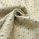 Upholstery fabric in linen featuring a geometric pattern with raised velvet dot embroidery.