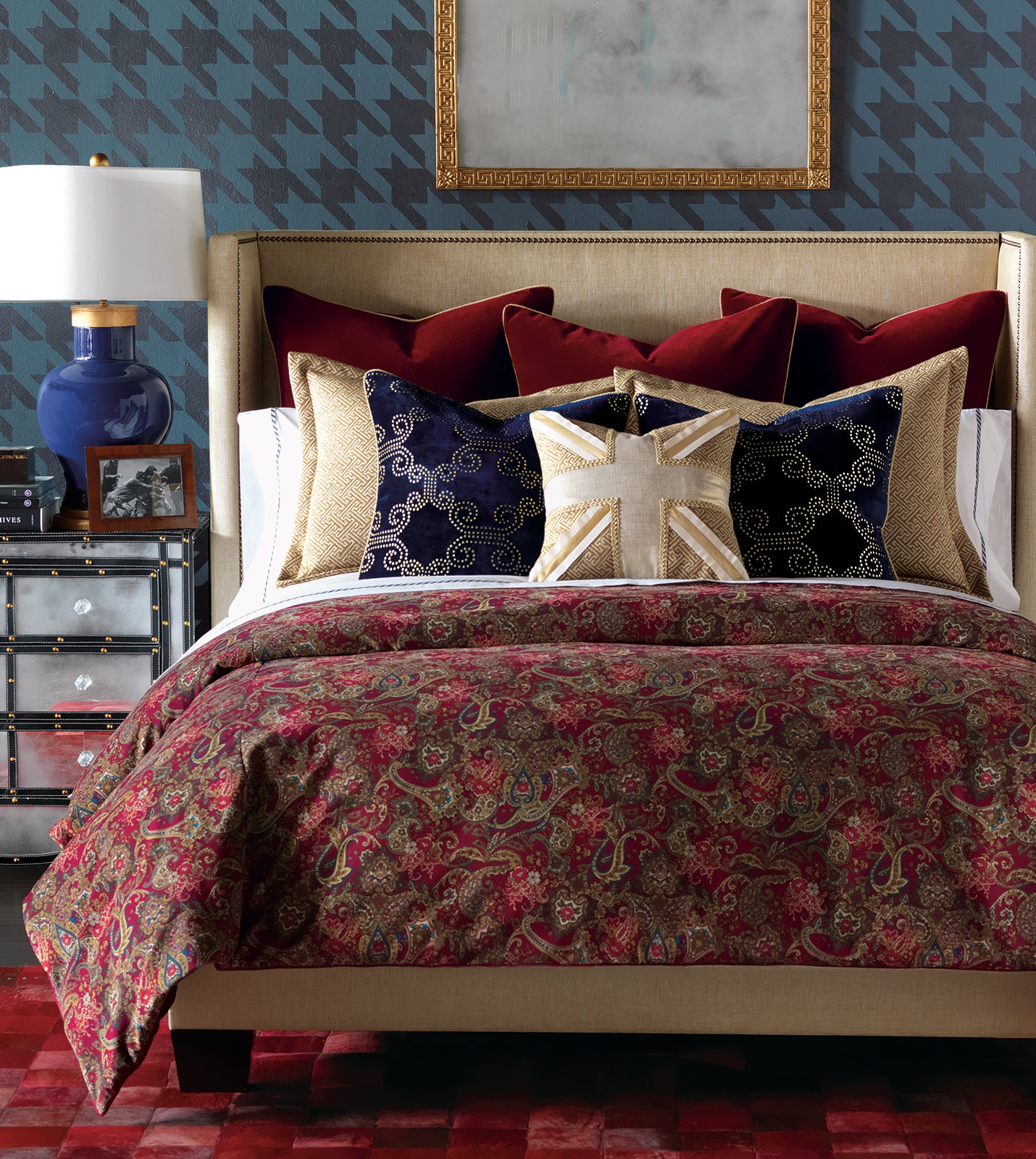 - Backed in solid red fabric