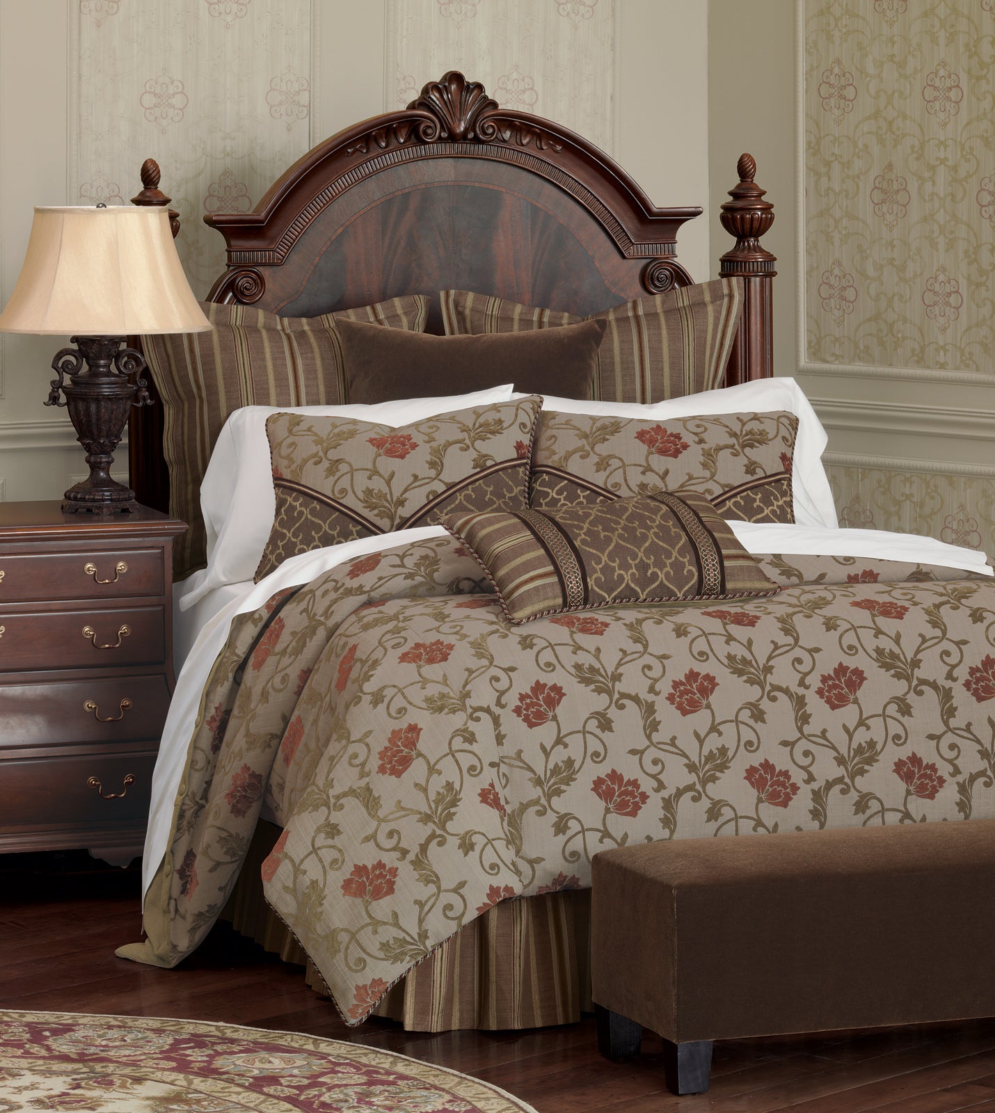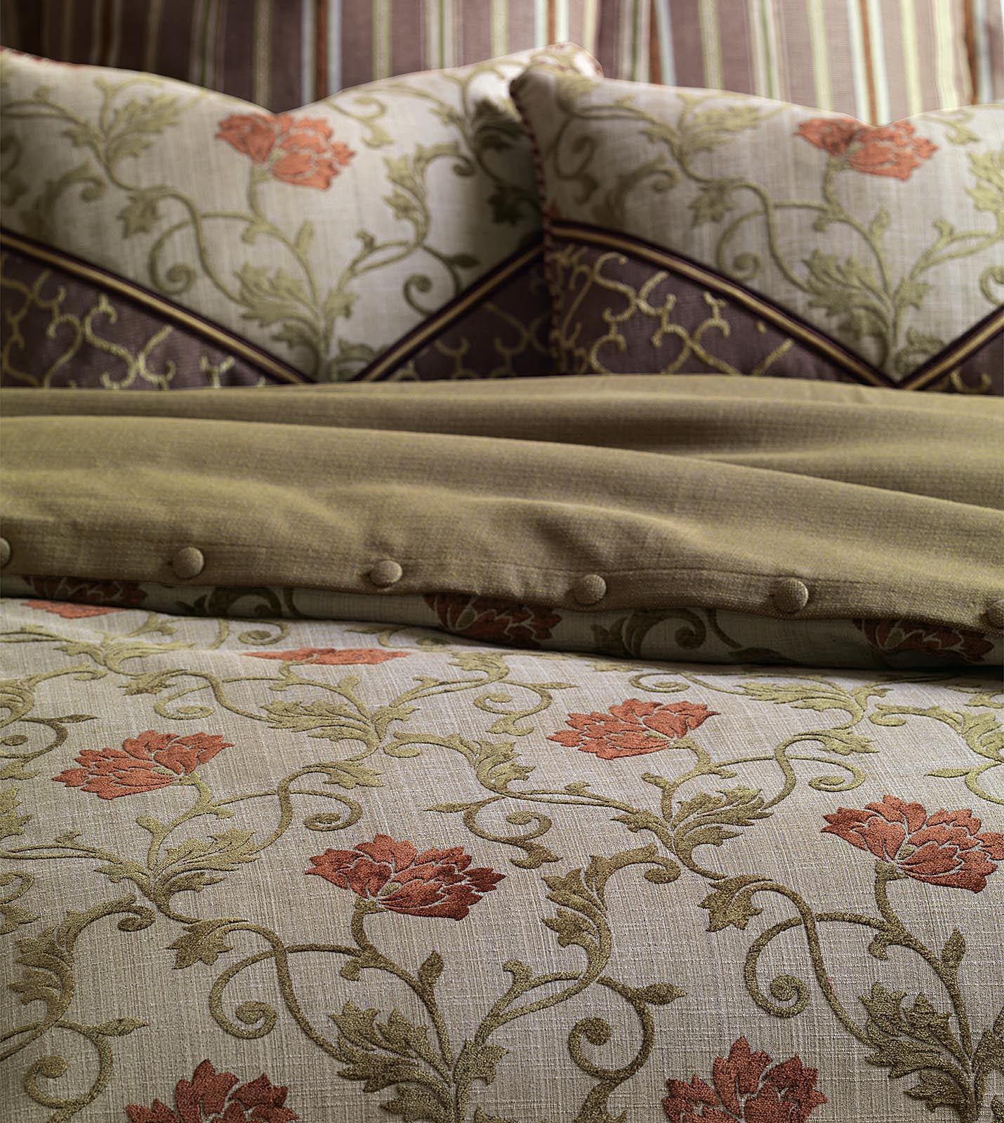 - Duvet cover with a woven chenille floral fabric in olive and rust on a pewter gray background