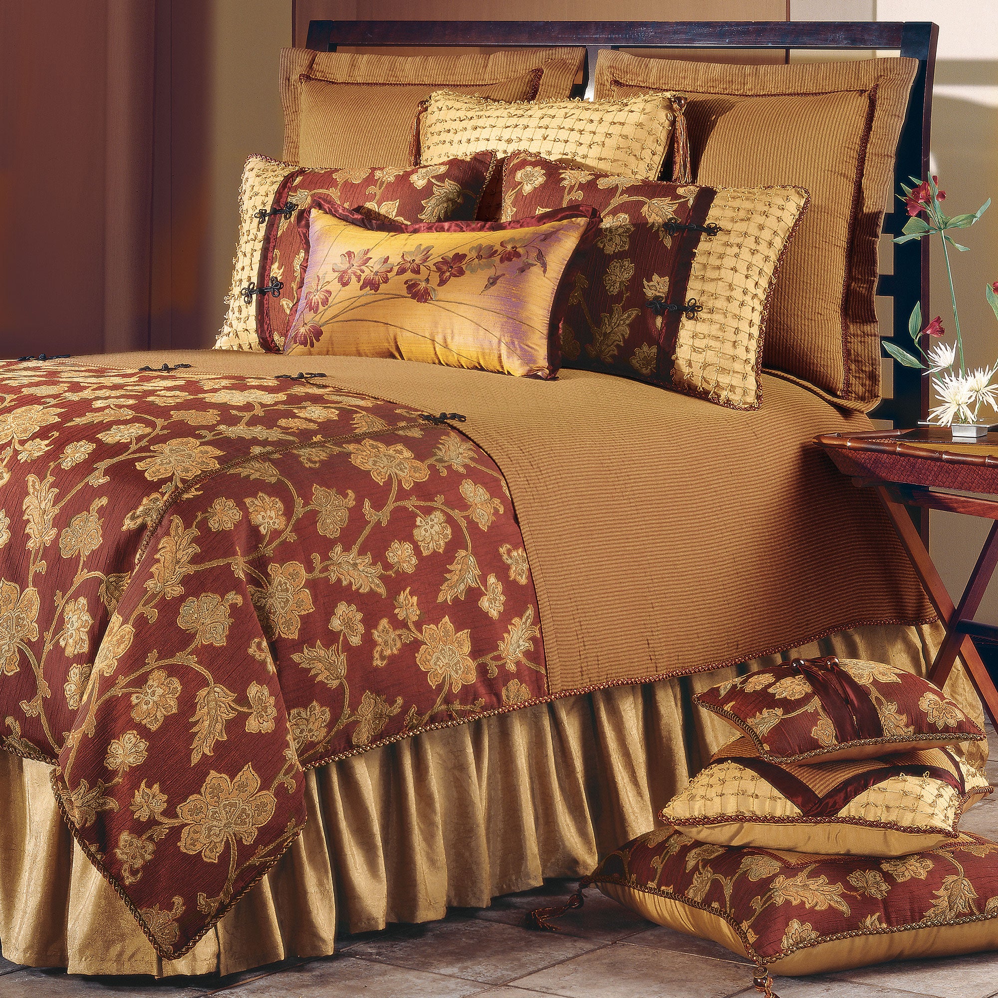 - Duvet cover featuring a floral pattern in deep shades of auburn and bronze