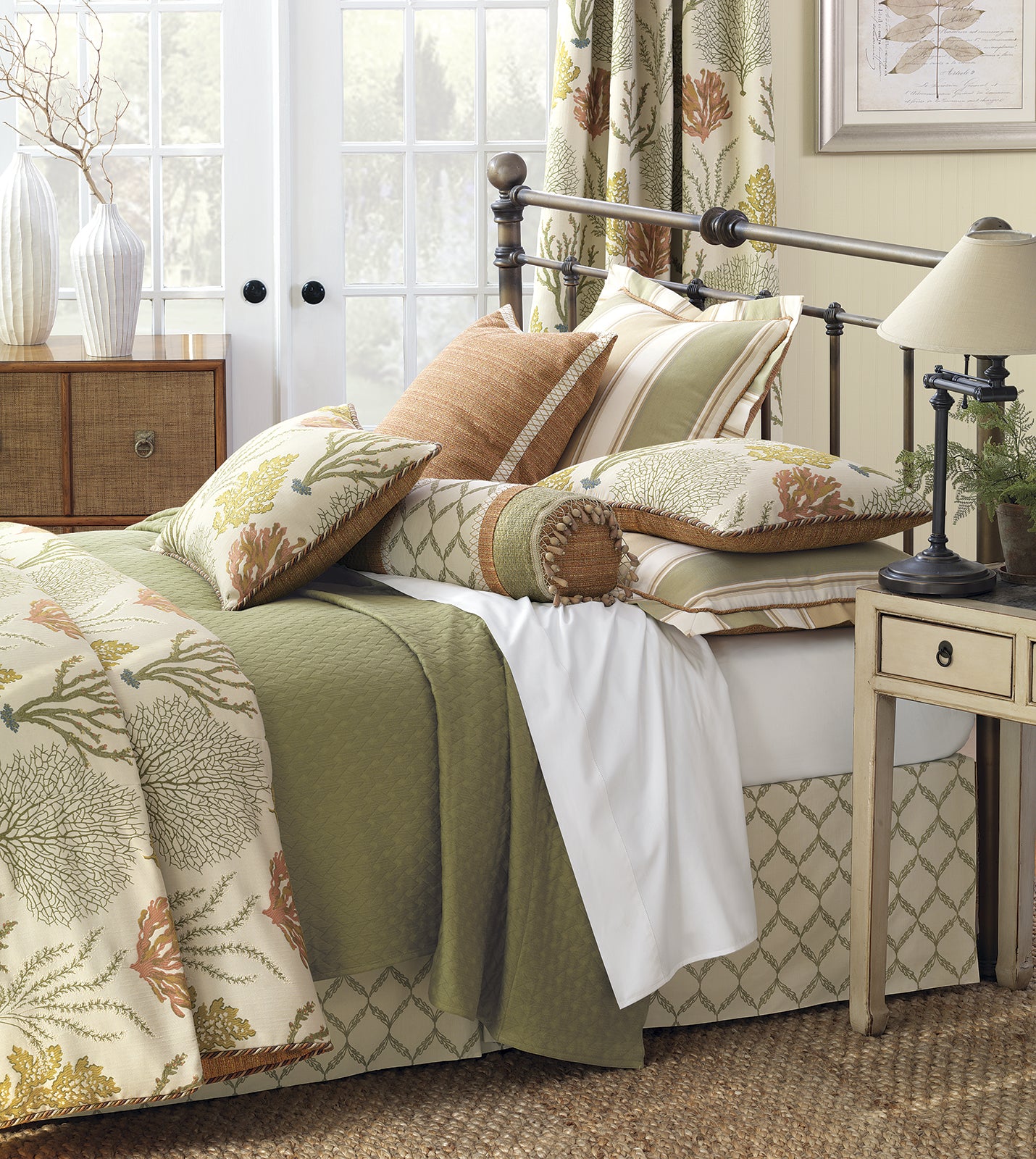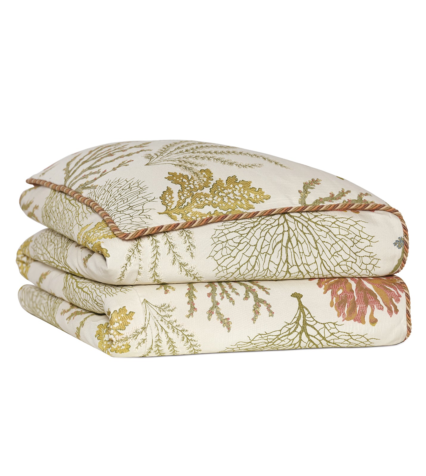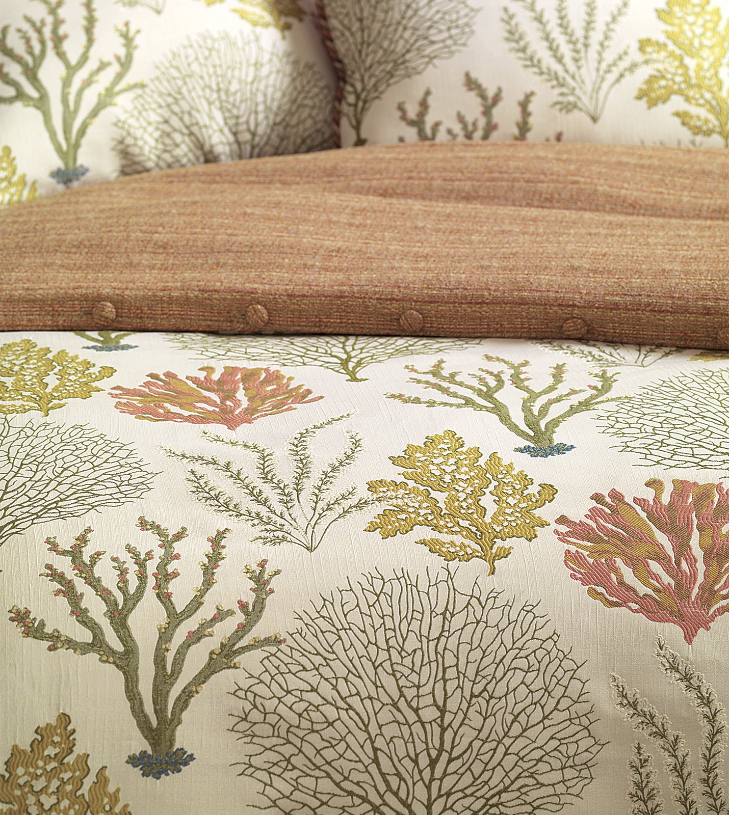 - Duvet cover in a variety of coral prints in hues of orange and mossy green