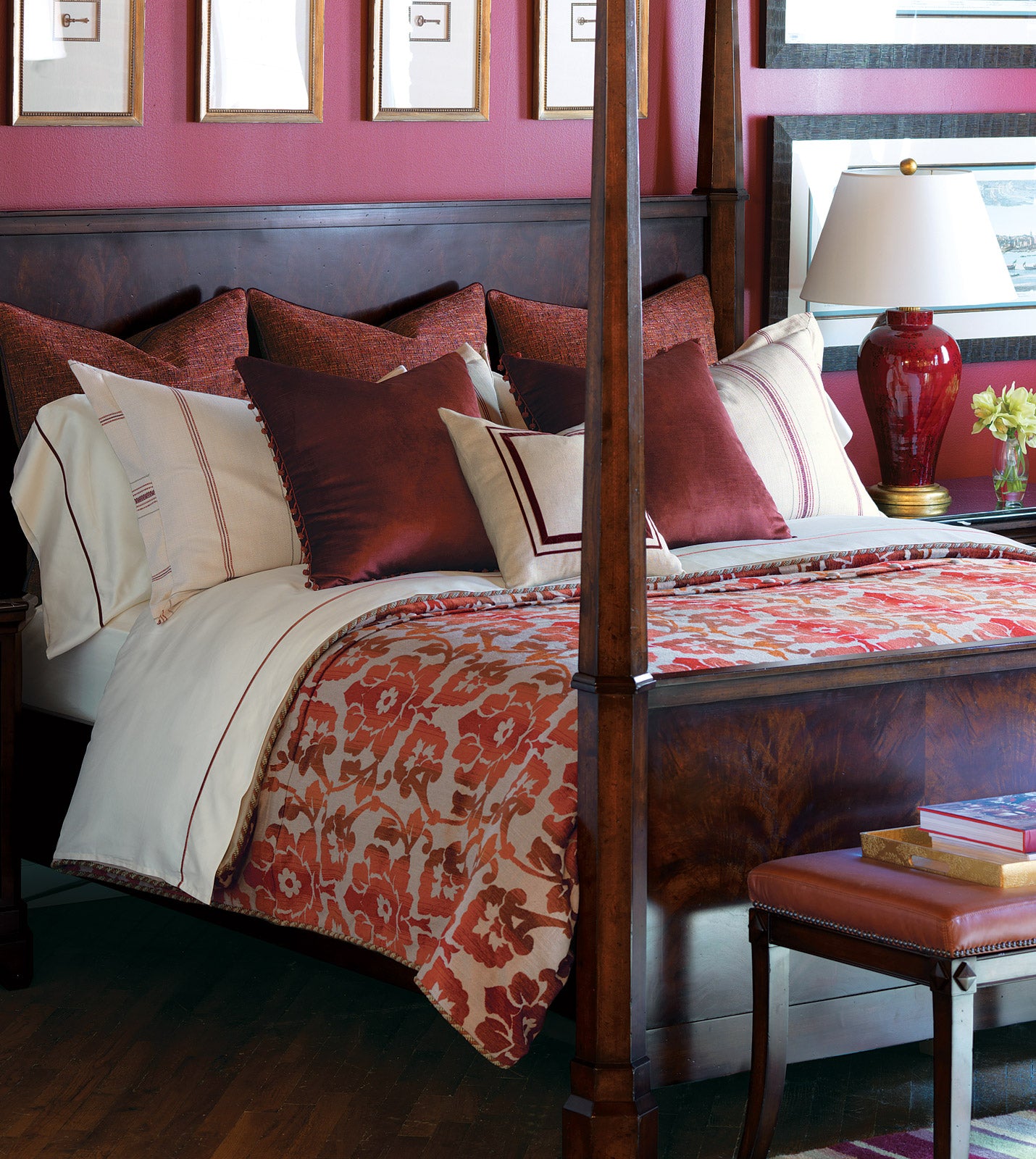 - Duvet cover featuring a bold floral pattern with bright ombre tones of red and marmalade