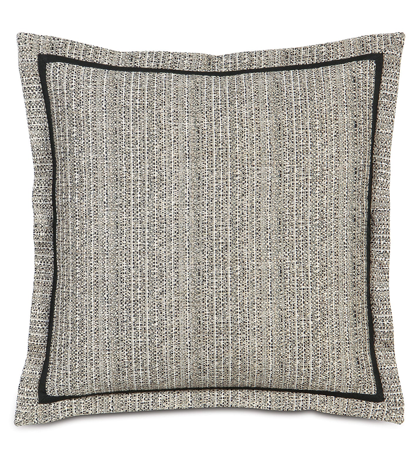 ⁌ Elevate your bedding with the Abernathy Textured Euro Sham. This 27x27 decorative sham is crafted from a neutral woven fabric that adds depth and sophistication to your space. Featuring a decorative border made from trim application and a mitered flange edge for tailored elegance, it is backed in solid black fabric for striking contrast. Designed with a discreet zipper closure, this sham balances luxury with functionality. Proudly made in the USA.