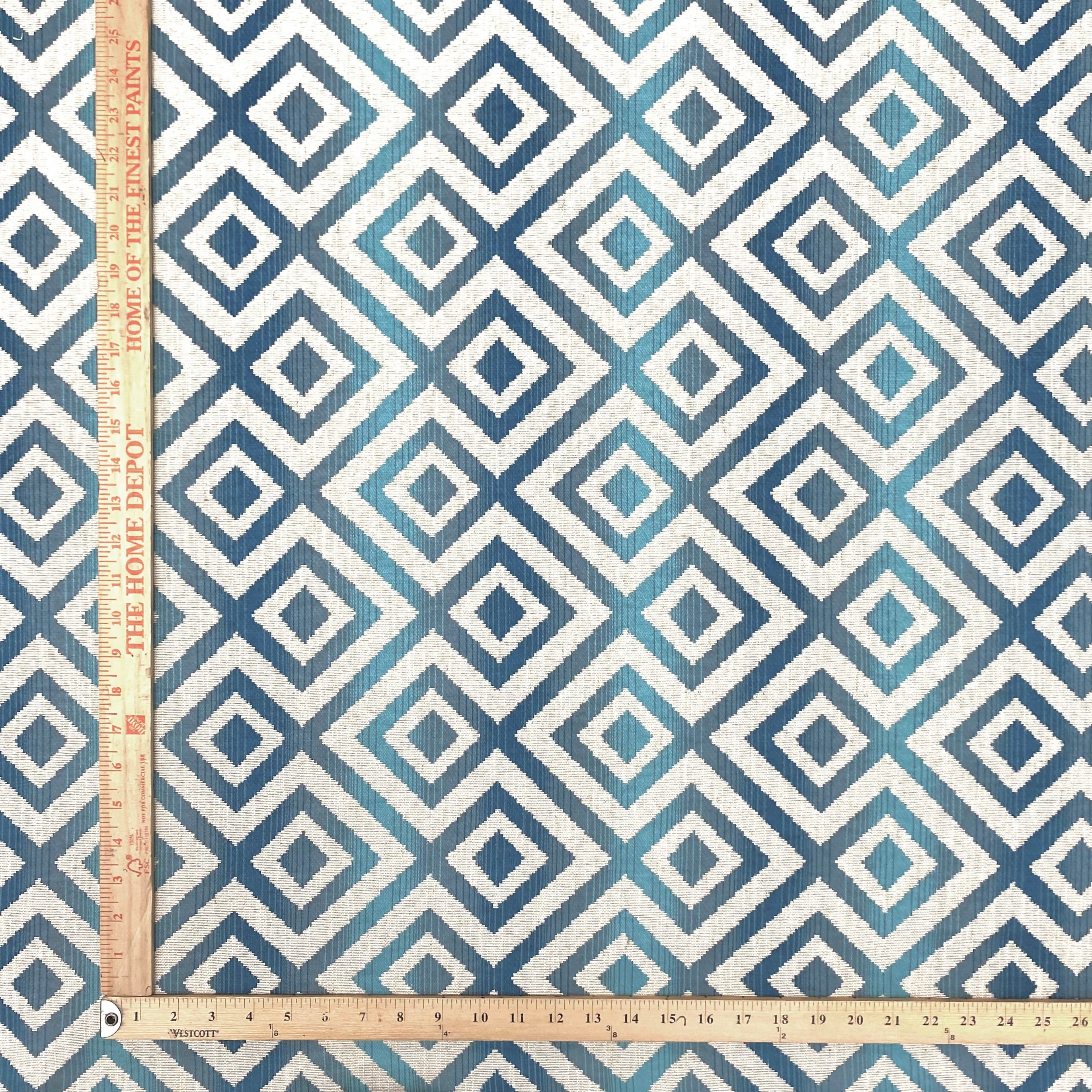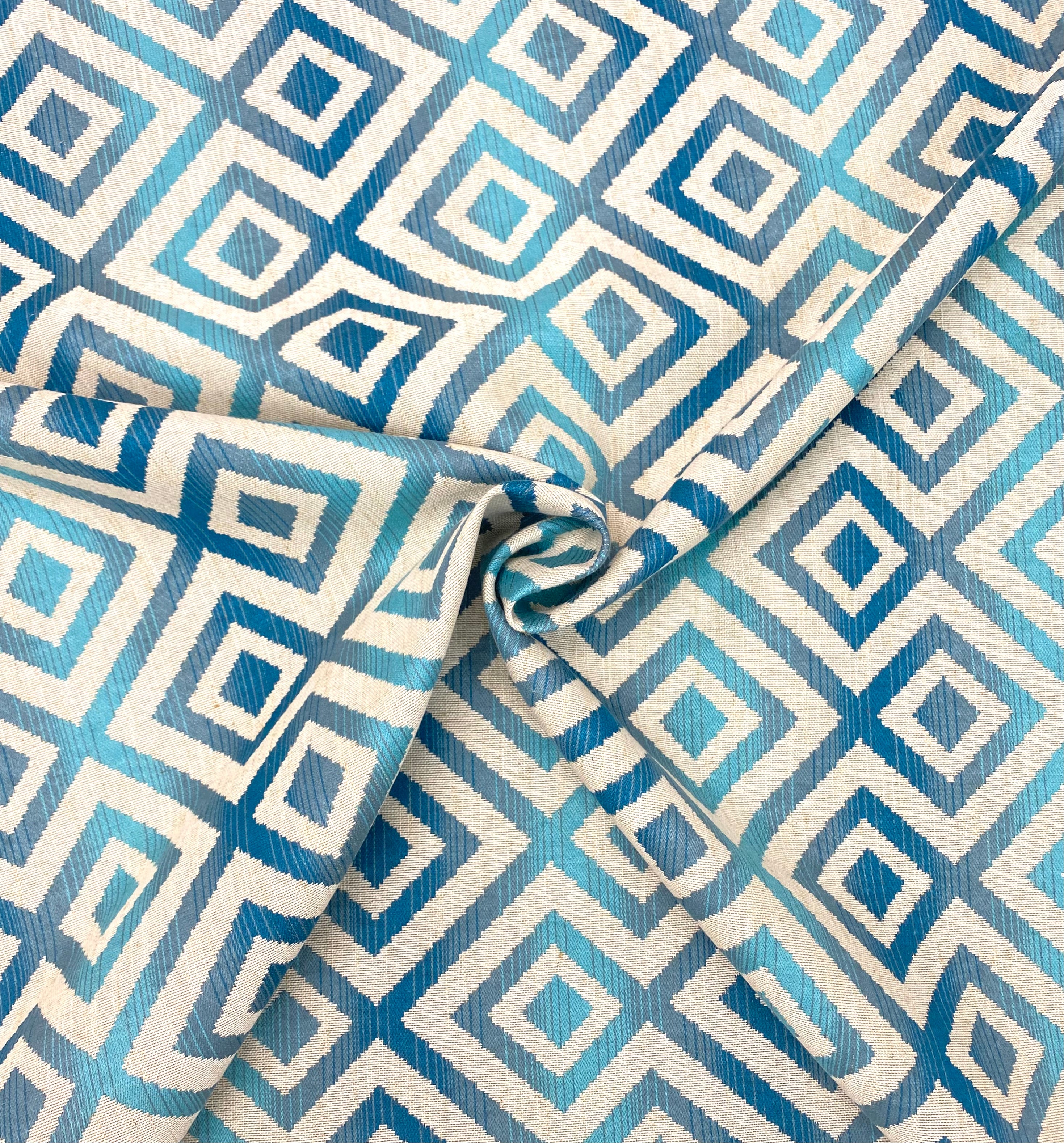 This luxurious Tempus Azure Geometric Jacquard Upholstery Fabric 54 meets flair with versatility, offering the perfect personal touch for any aesthetic. Designed and crafted by skilled textile artisans this fabric is made to last and never compromises on quality. All fabric is sold by the yard in 1-yard increments. Unfortunately, we do not accept returns on fabric orders but swatches are available.