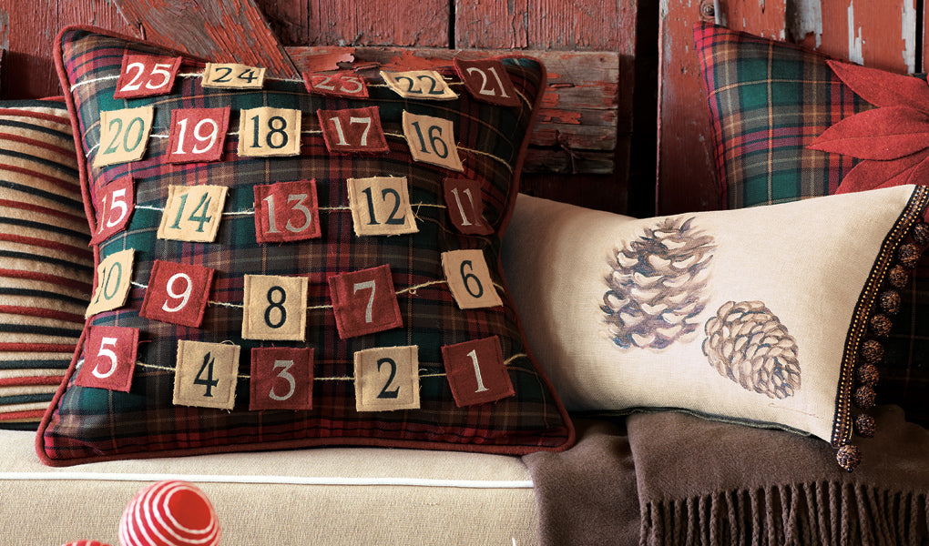 - 100% wool red and green plaid pillow cover with a decorative advent calendar design stitched on face.