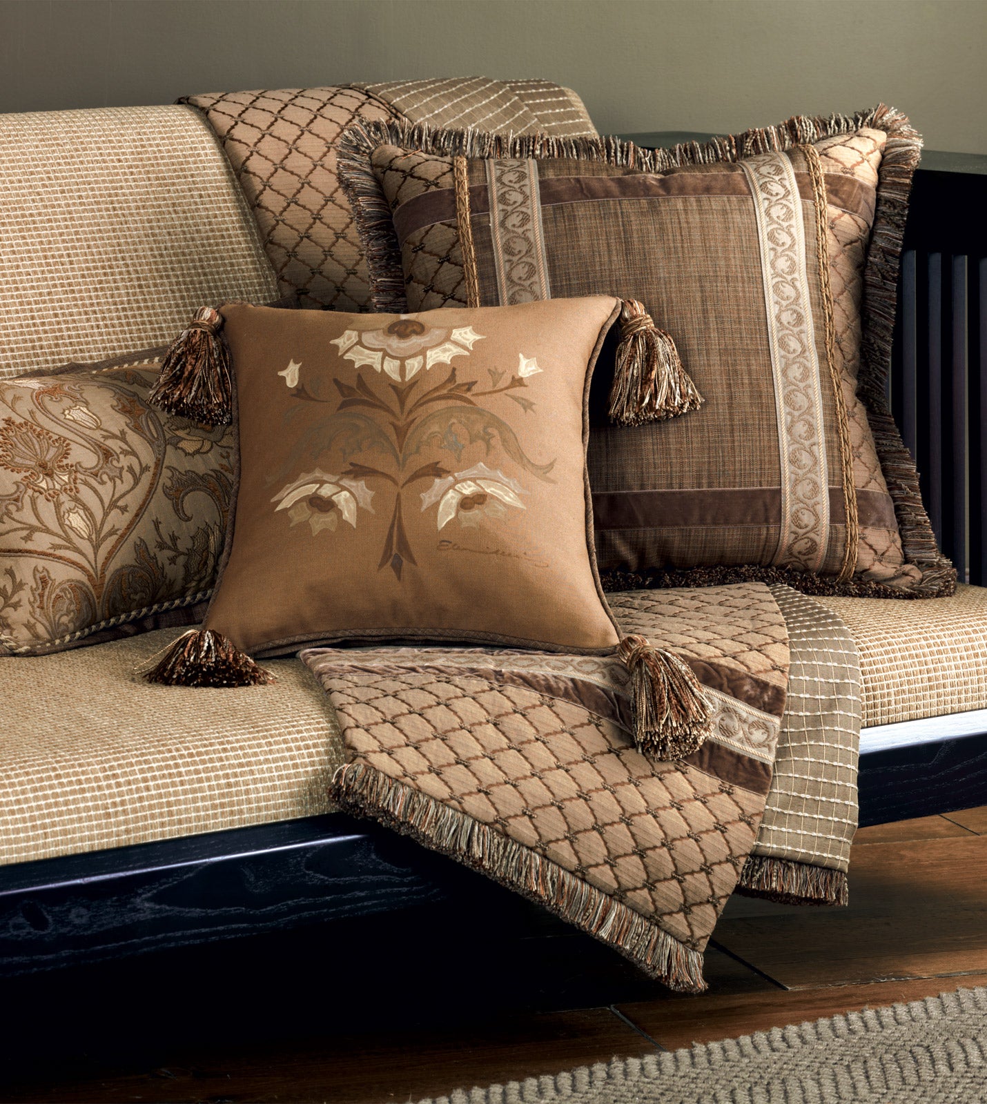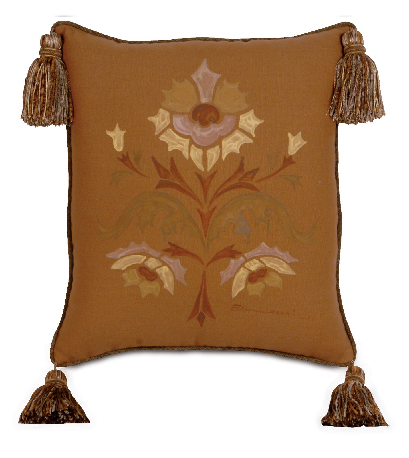 - Decorative pillow cover featuring a hand-painted floral design in shades of ginger and golden brown