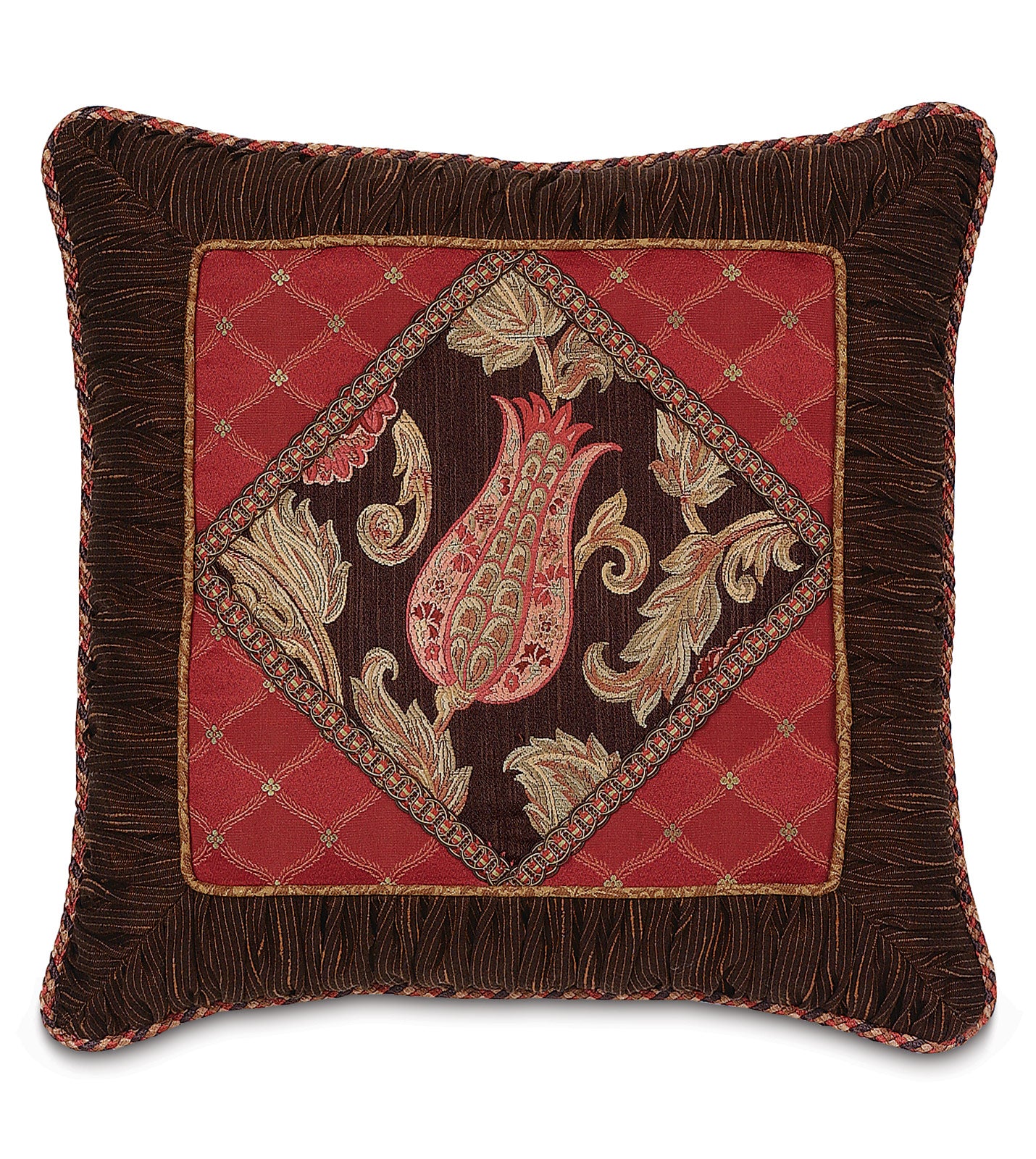 - Throw pillow with a collage of textured fabrics in brown and scarlet