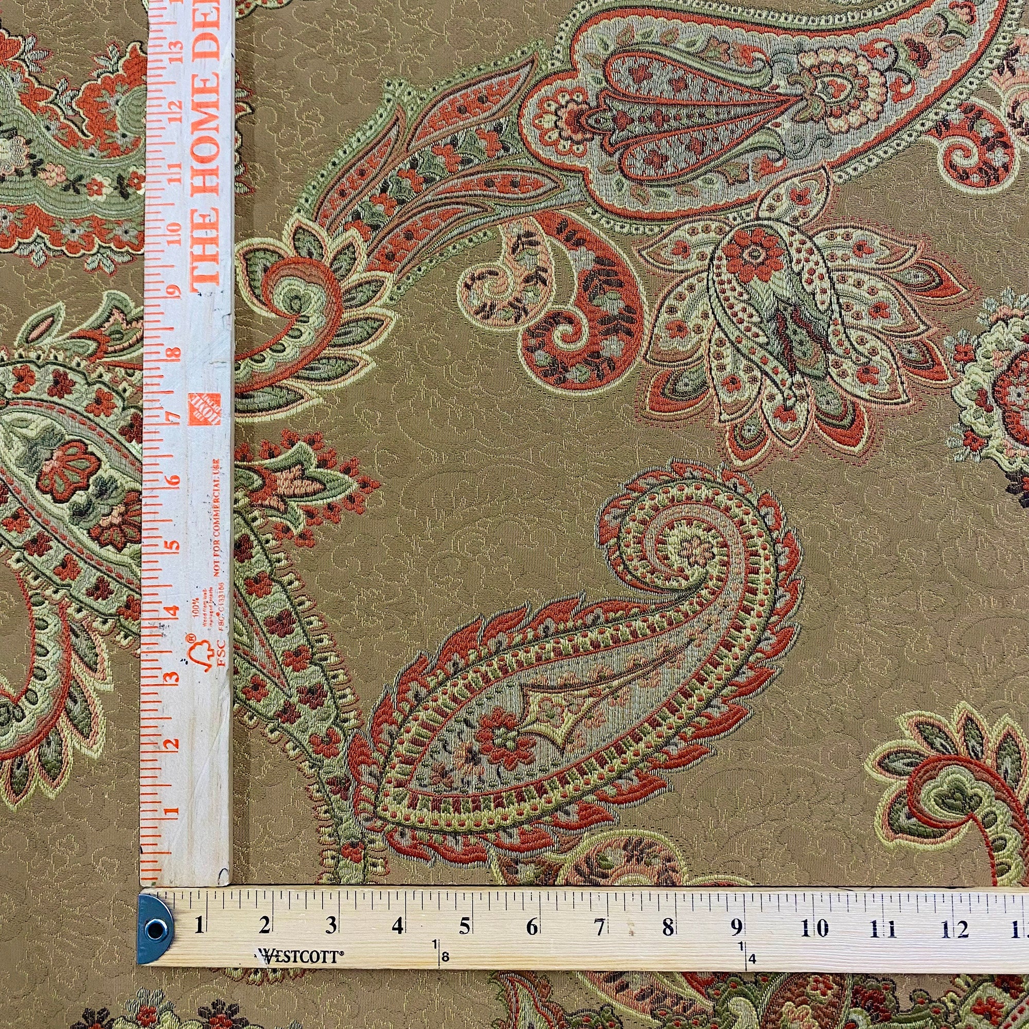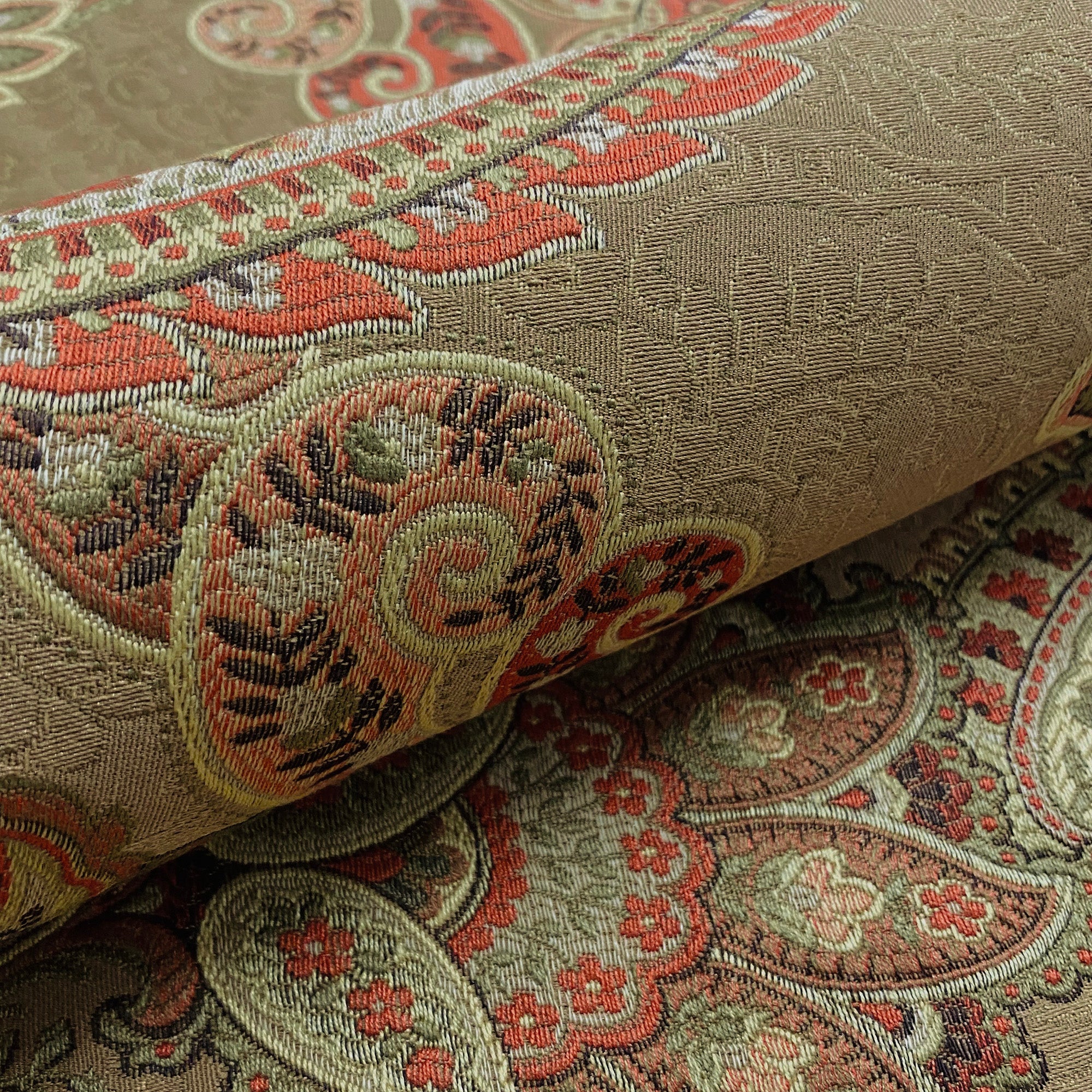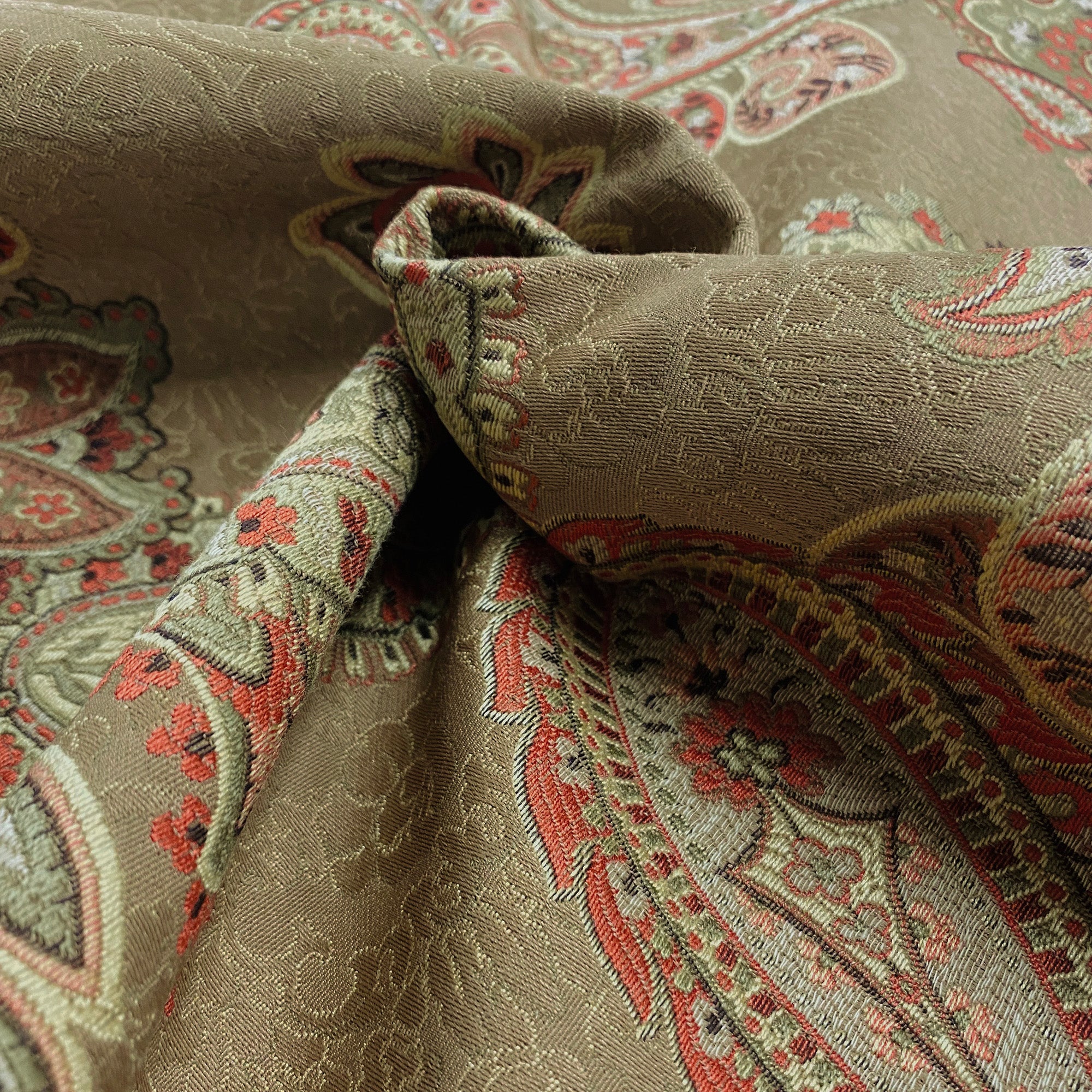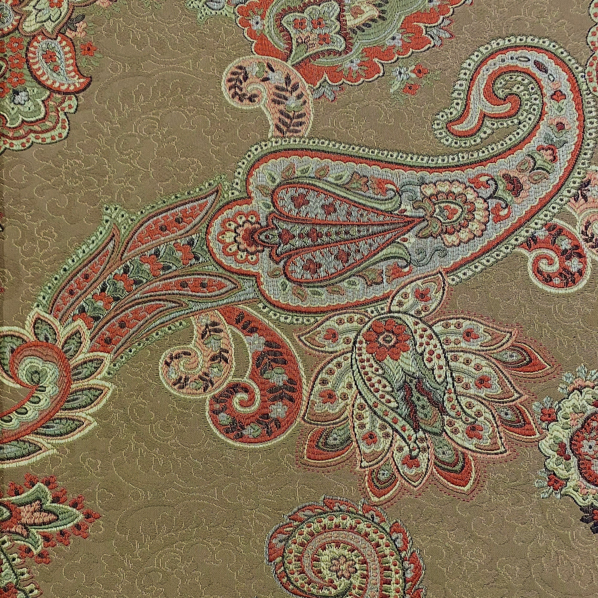 Brocade upholstery fabric with warm toned floral paisley embroidery on tan ground.
