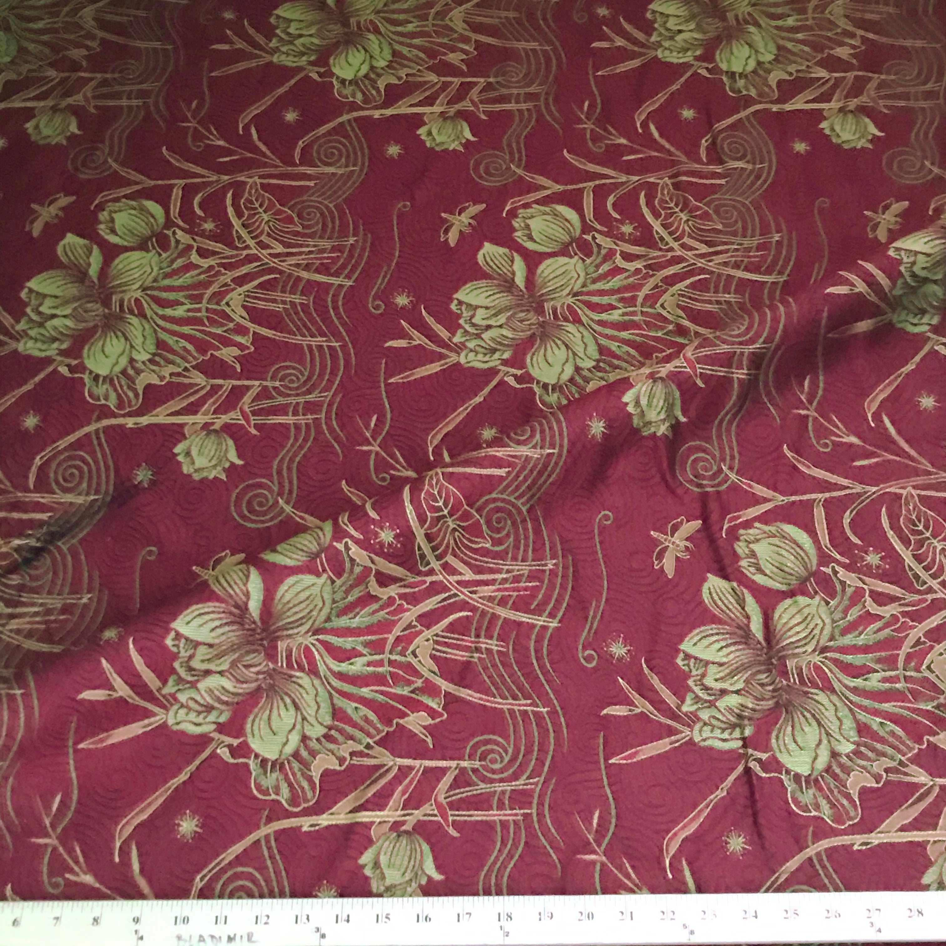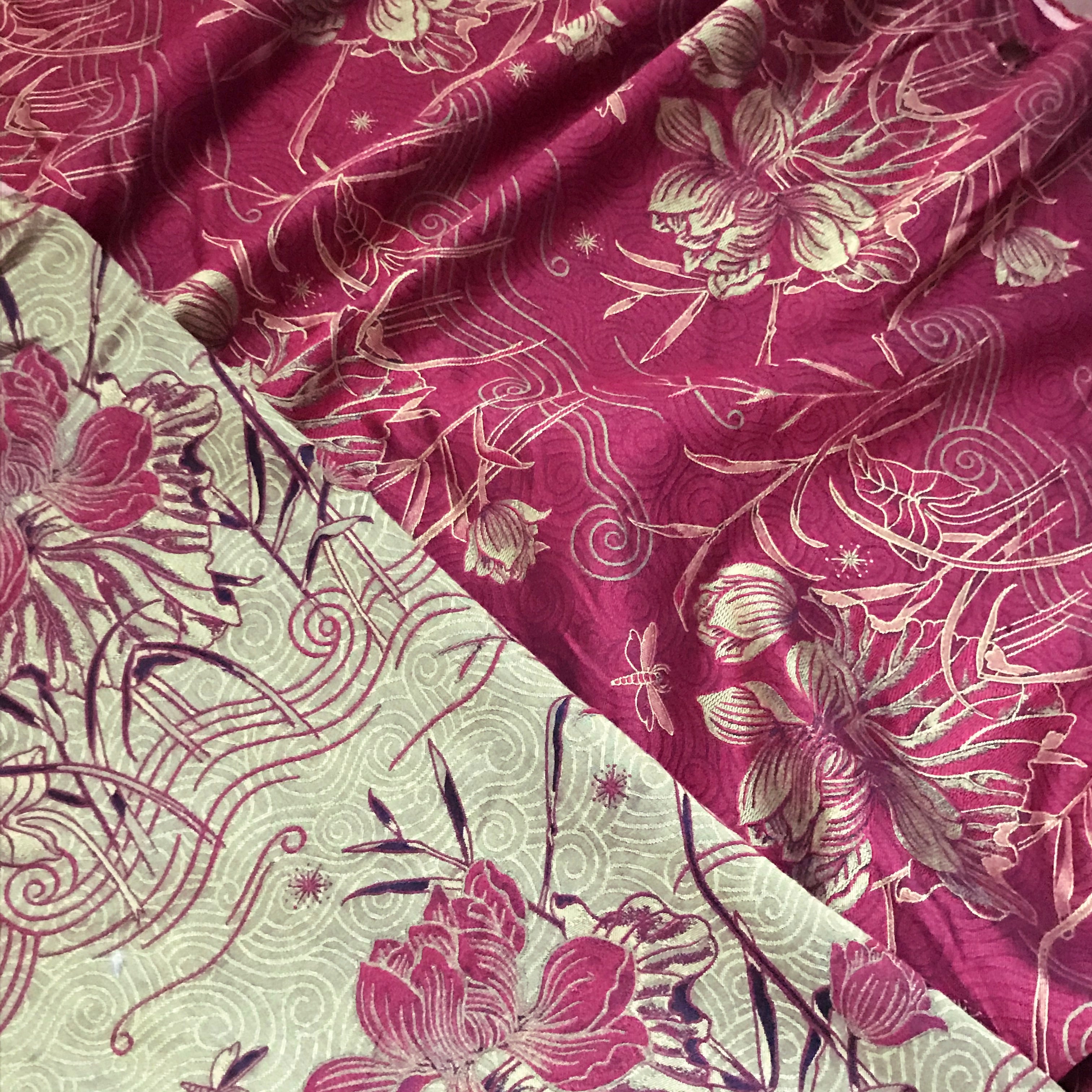 Decoratively embroidered pattern with floral and scroll designs in a eastern-style inspired hues in red and lightly hued green.