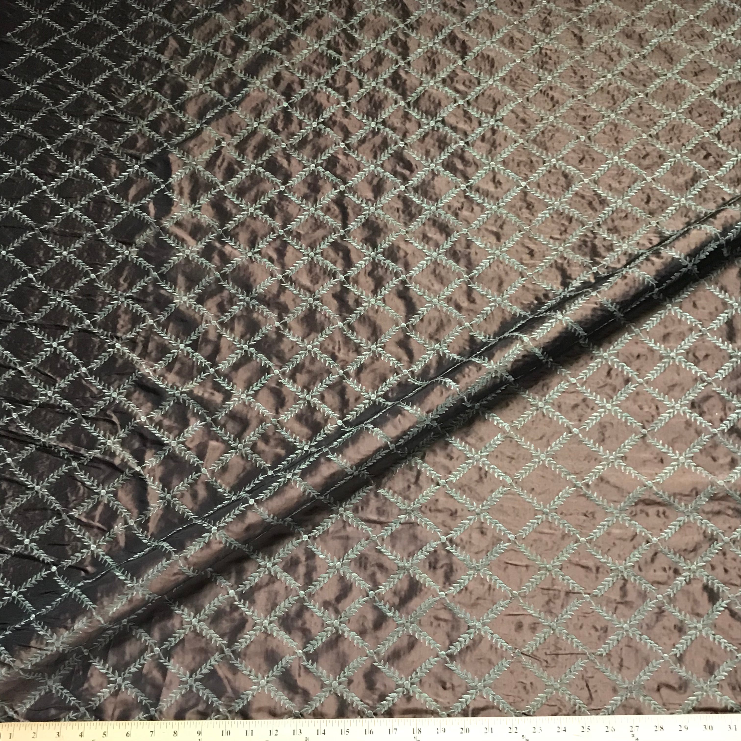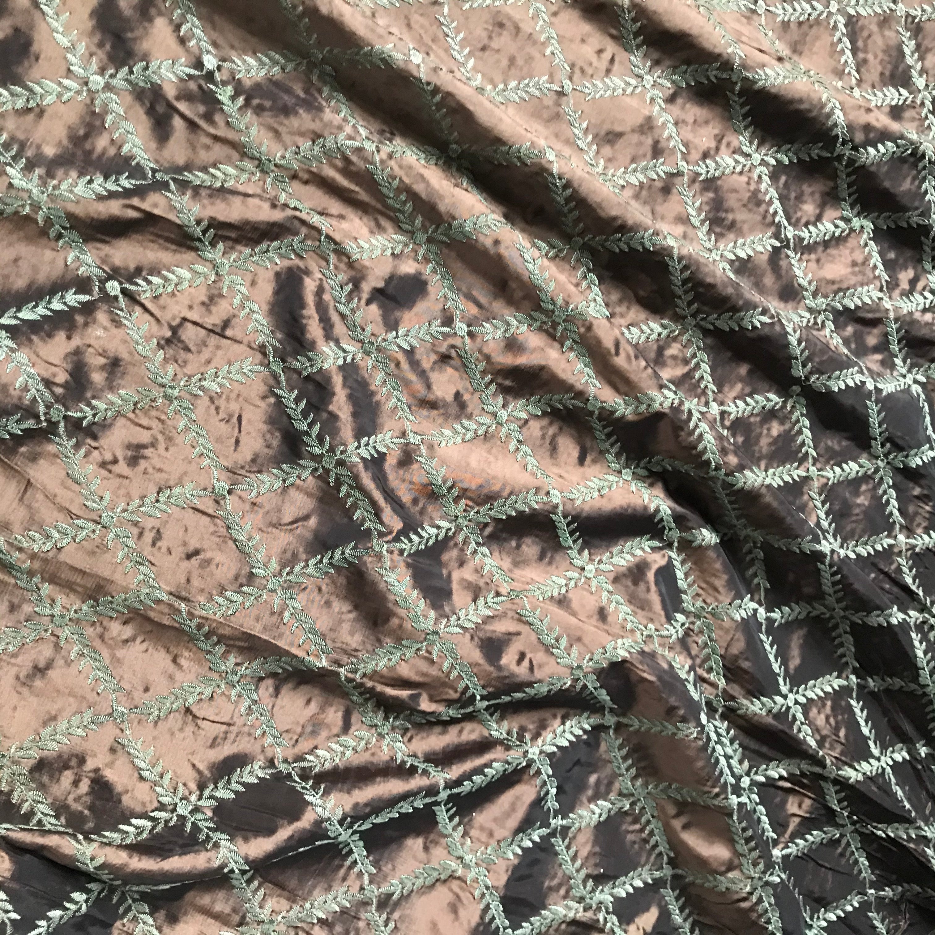 Luxuriously embroidered satin fabric featuring green leaflet vine in geometric, trellis design on solid brown base.