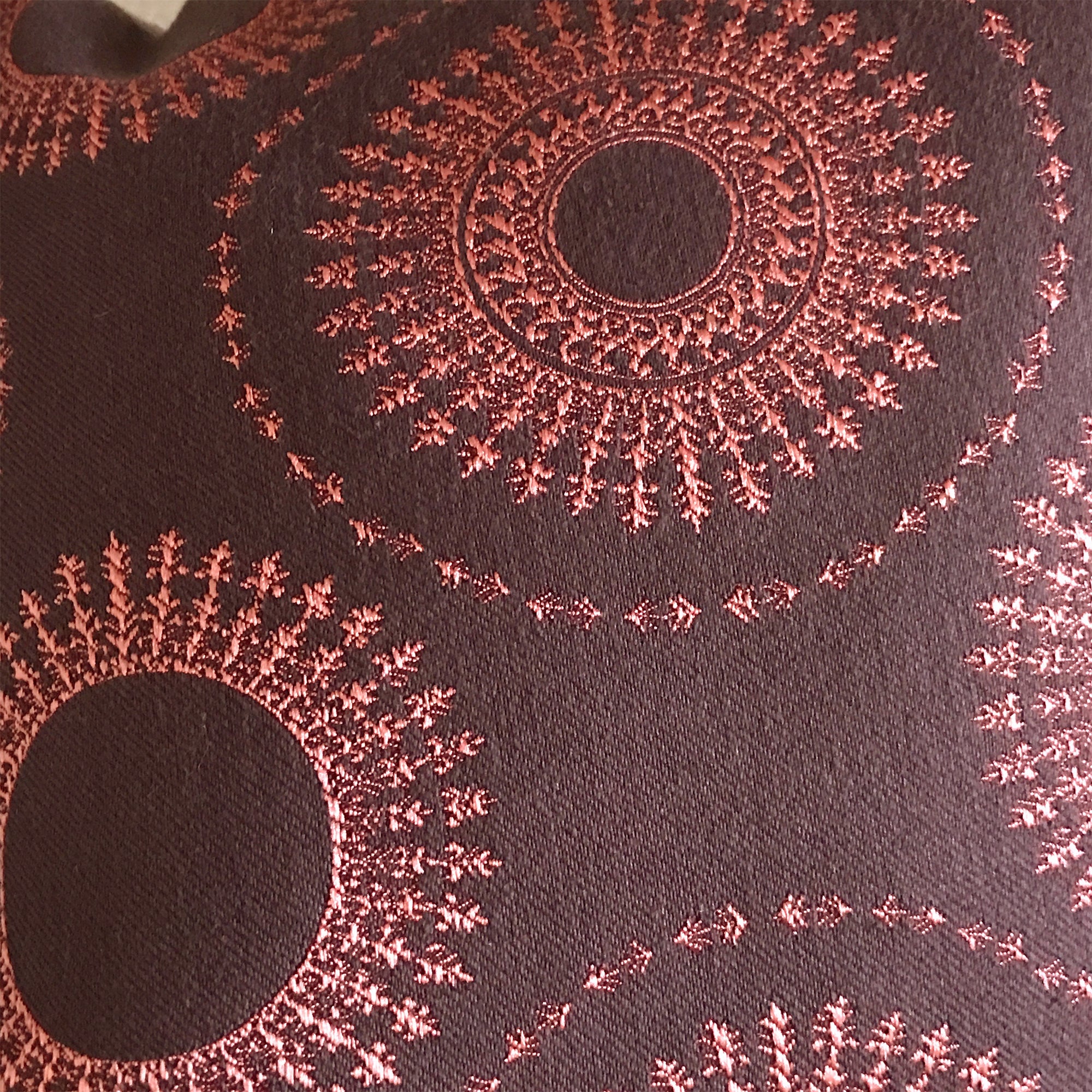 - Embroidered circular geometric pattern in purple adds depth and visual interest