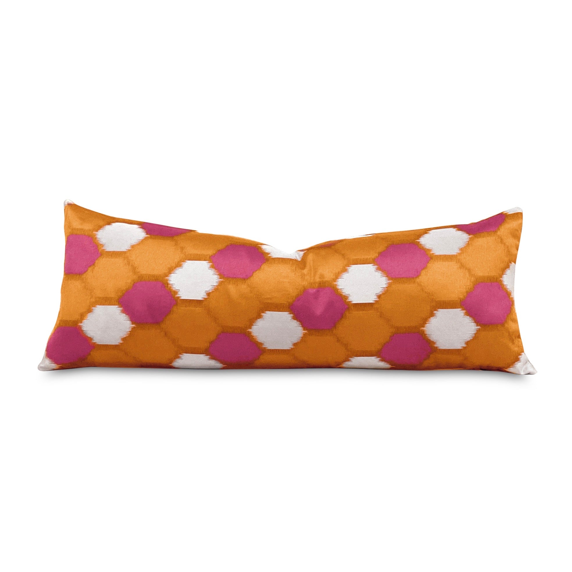 ⁌ Make a bold statement with this orange mid-century ikat lumbar pillow cover. Featuring a striking ikat-inspired jacquard pattern in vibrant shades of orange and pink, this extra-long 13x36 pillow cover adds a dynamic pop of color and texture to your space. Its sleek, elongated shape makes it ideal for layering across beds, sofas, or benches in modern, bohemian, or eclectic interiors.