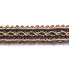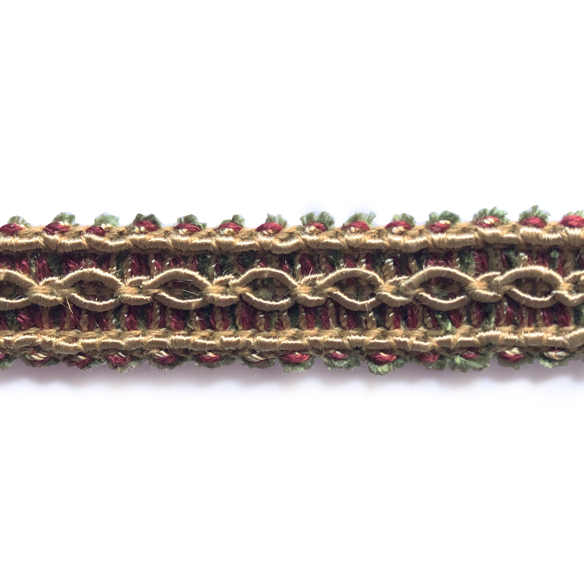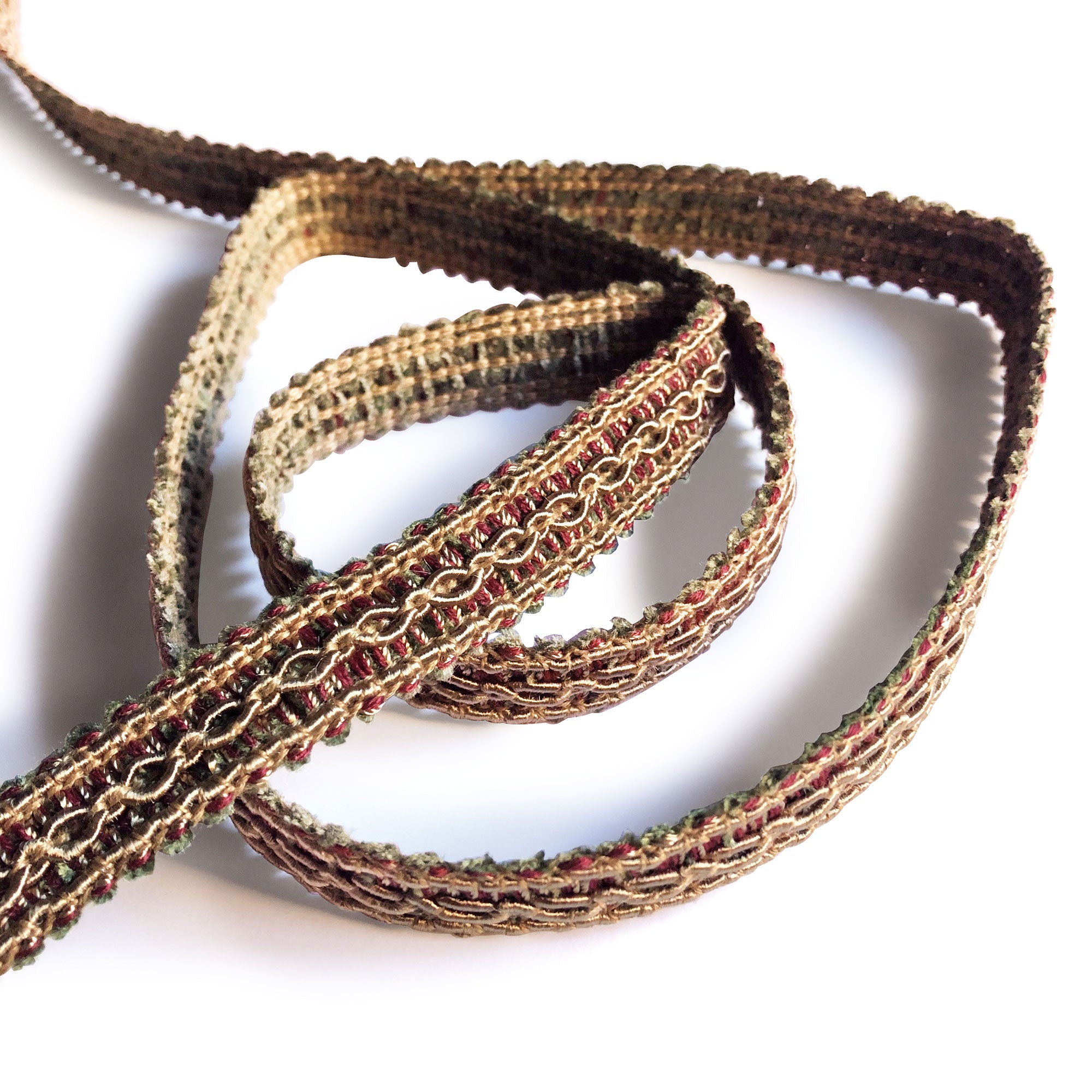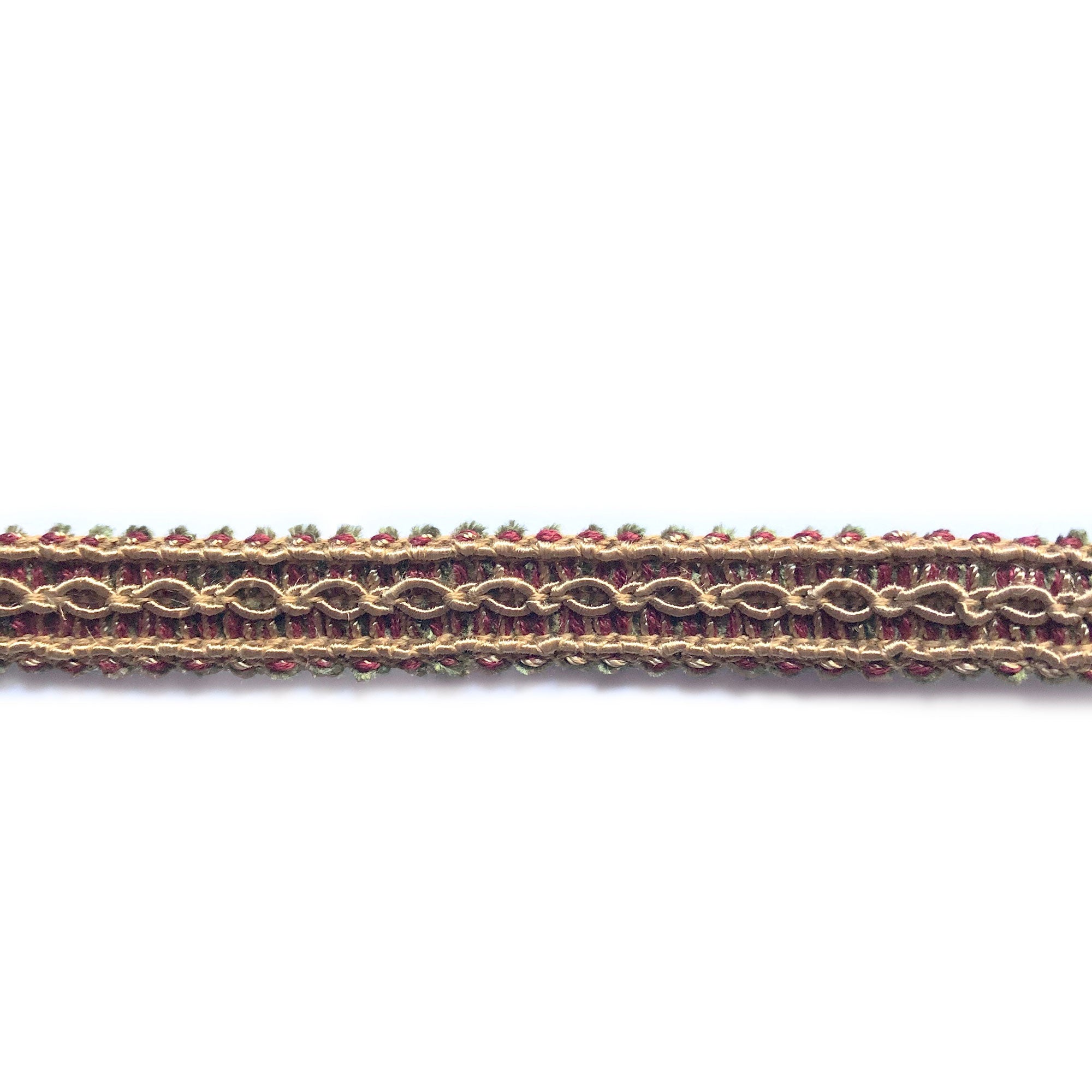 Decorative gimp trim with light brown, pink, and green threads.